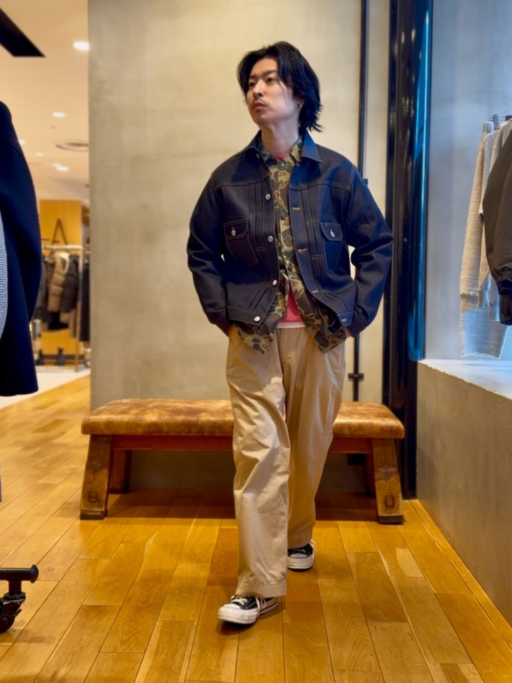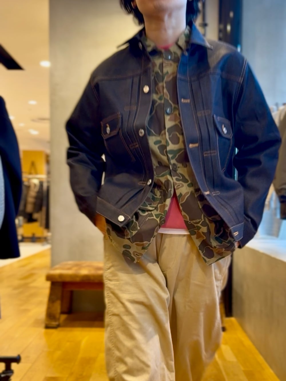 胸ポケットやフラップポケットなどのワーク感あるディテールが程よいアクセントになり、ブーツやレザーシューズと合わせれば大人っぽく、デニムセットアップで合わせれば統一感のある着こなしが作れます。