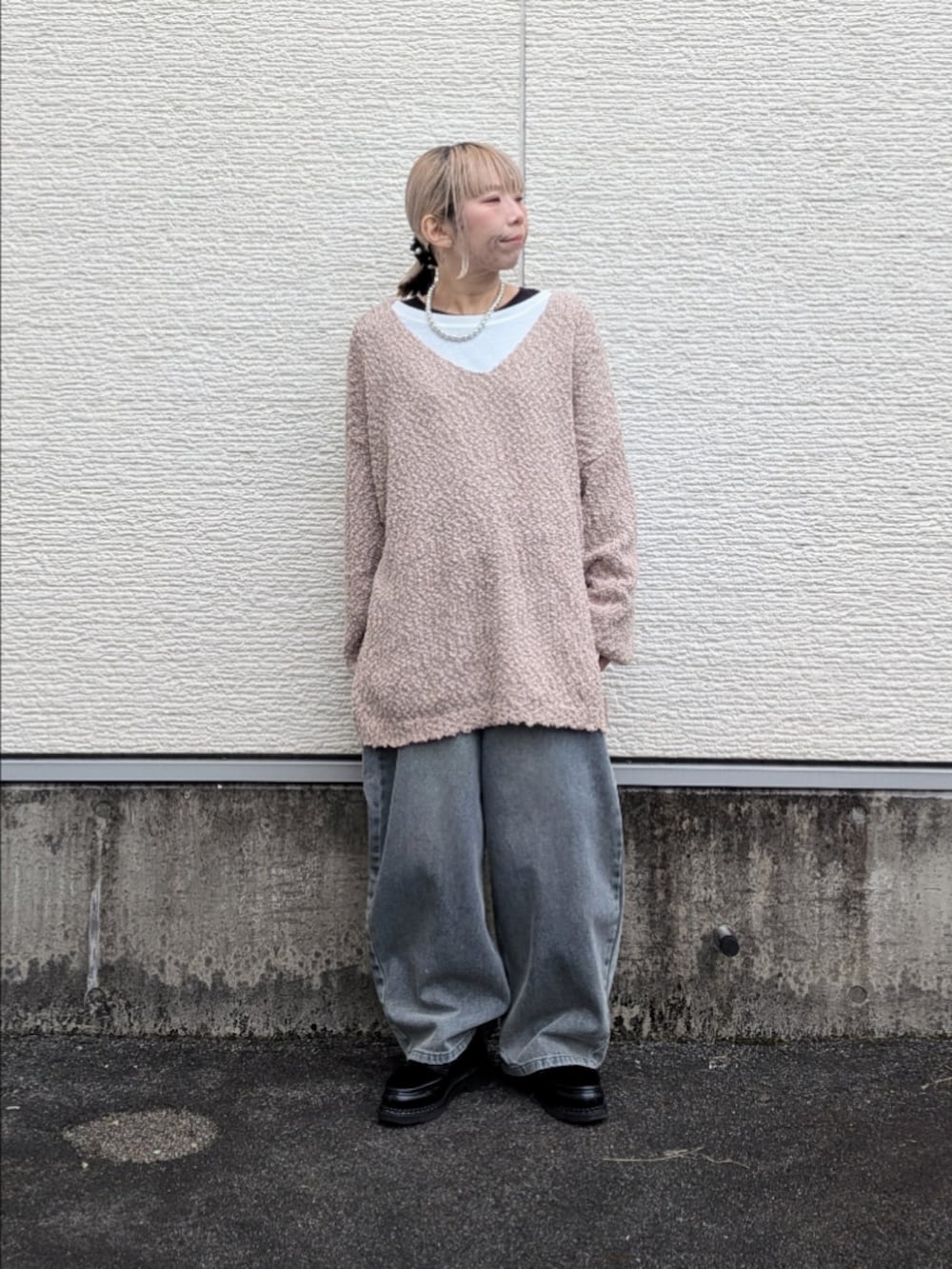 シルエットがキレイなデニムのコクーンパンツ。ダメージ具合も絶妙でオススメの一本です。サイズはSサイズ着用です。