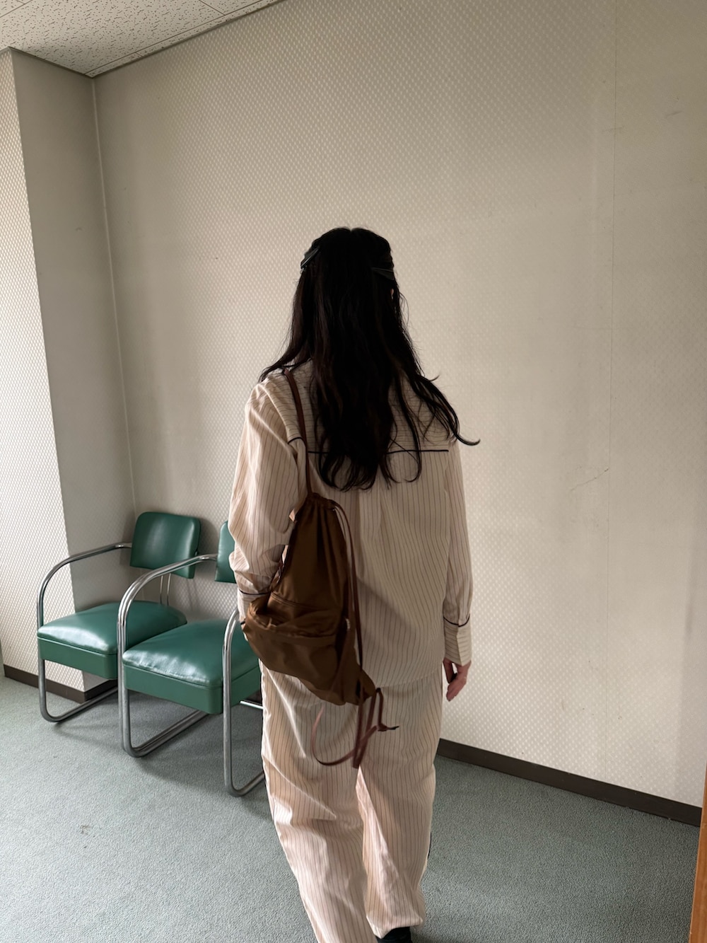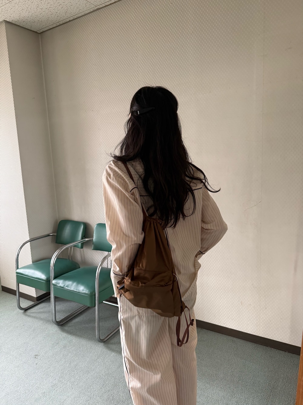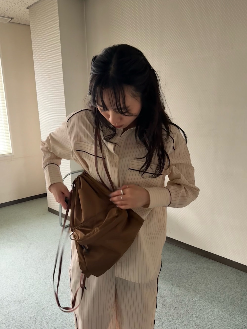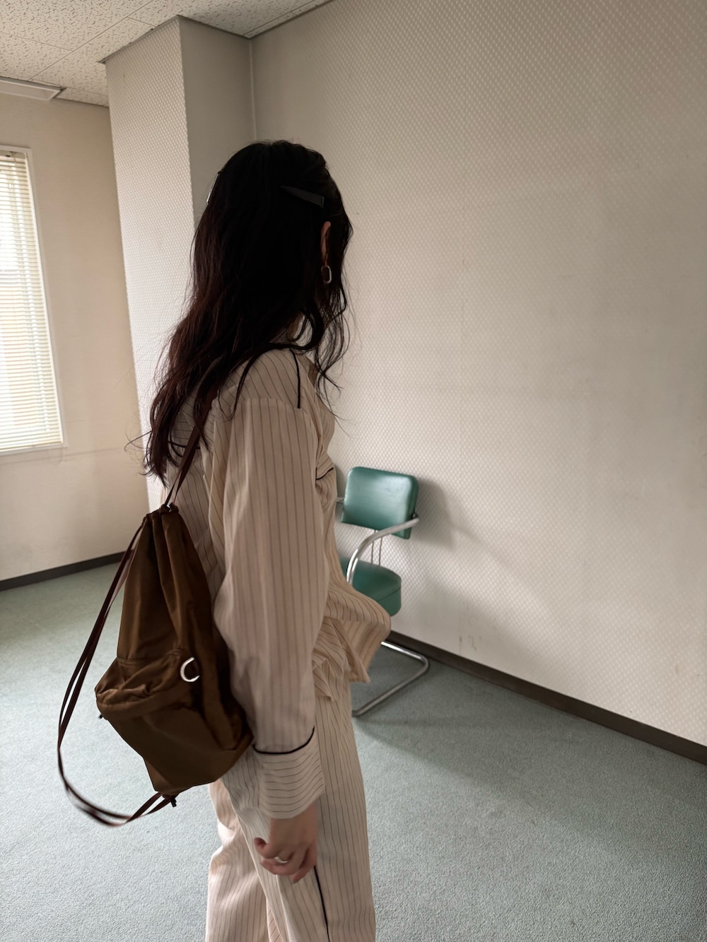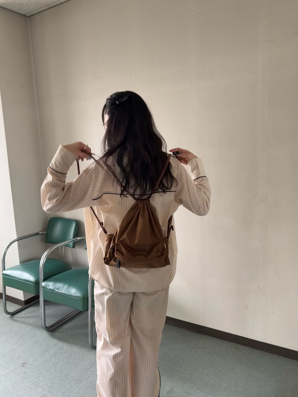 さらに、ツヤ感のあるナップサックを合わせることで、大人っぽく、アクセントにしました。