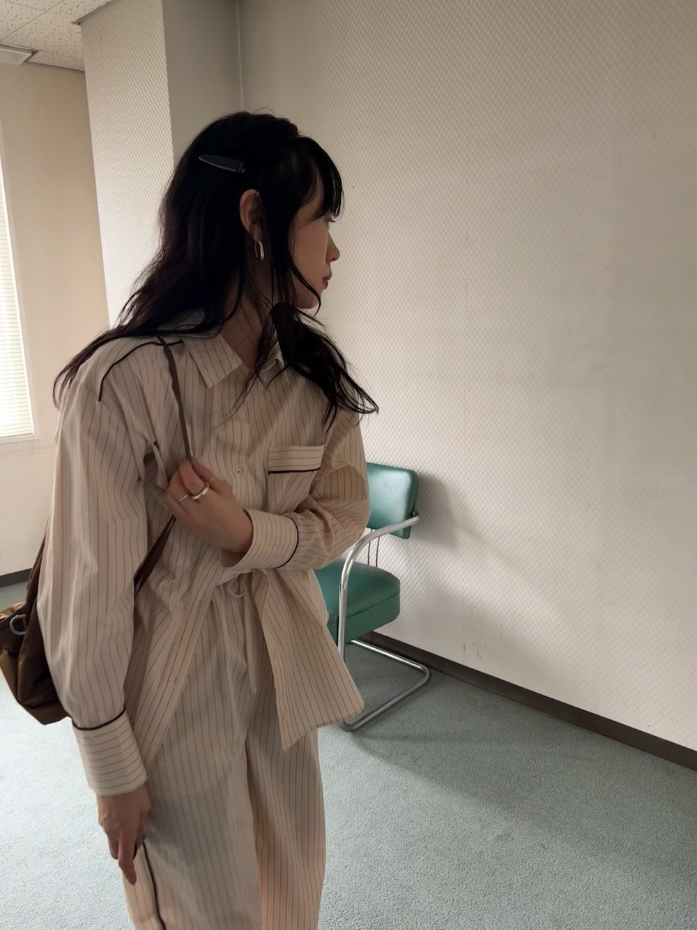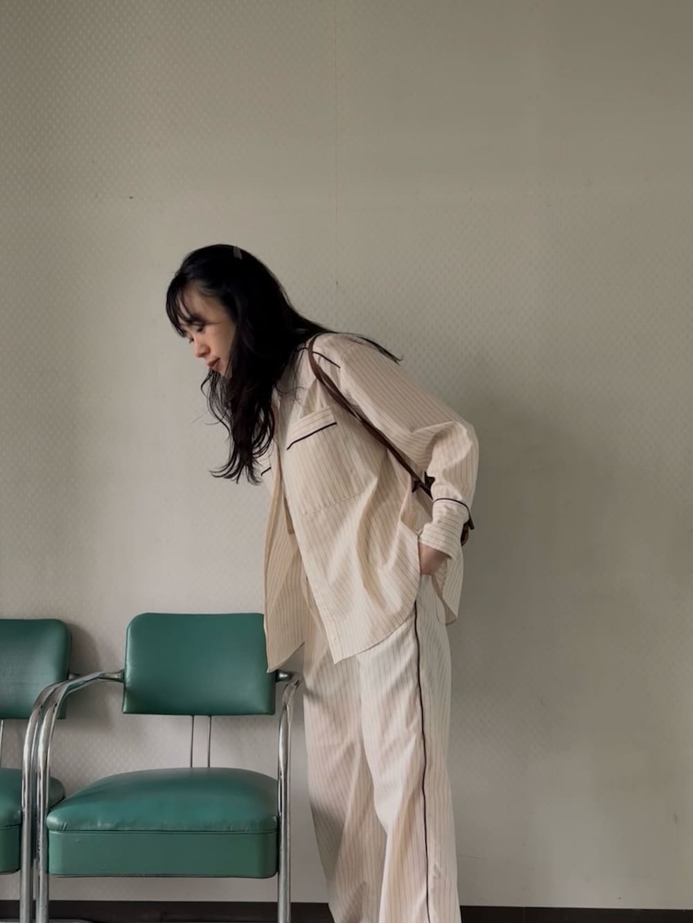 シャツもパンツも少しハリ感があるので、家着っぽくならず、オシャレに着こなせます。