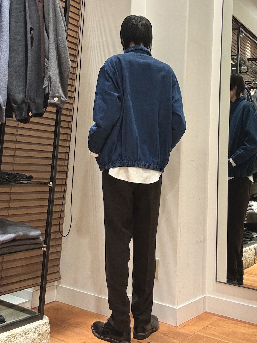爽やかなカラーのデニムブルゾンを使用したスタイリング。ダブルジップになっていてレイヤードにも使いやすいです。