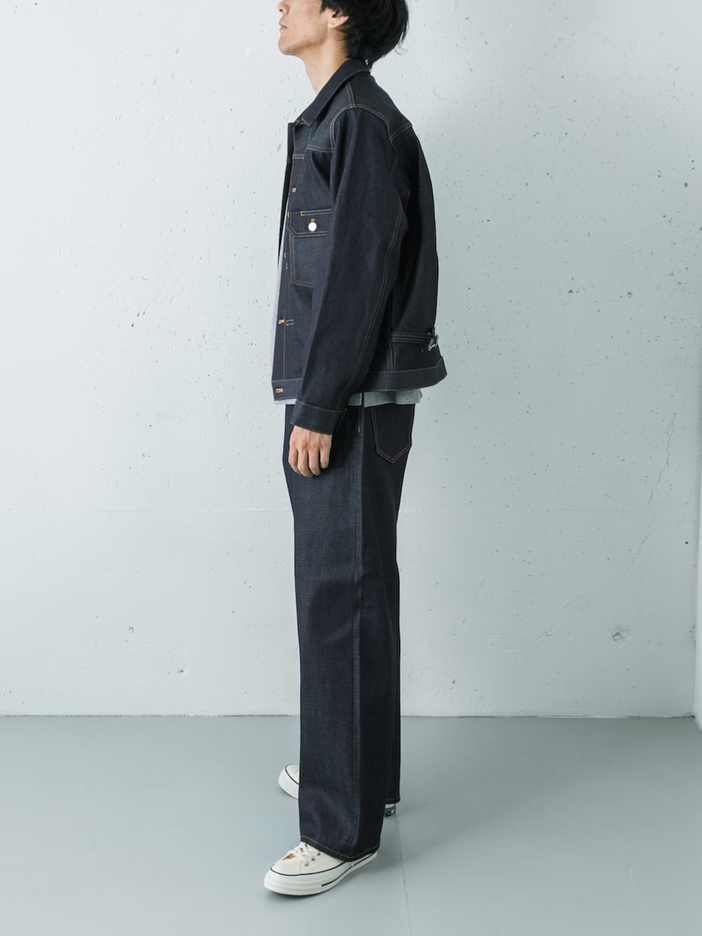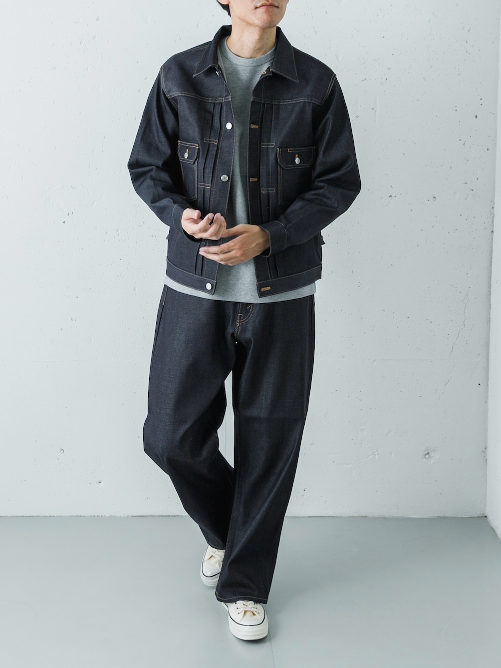ボトムスには同素材のバギーパンツ「JAY」を合わせ、あえてルーズなシルエットを構築。上下デニムの重厚感を、足元の白コンバースが軽やかに中和し、クリーンで現代的なアメカジスタイルへと昇華させています。