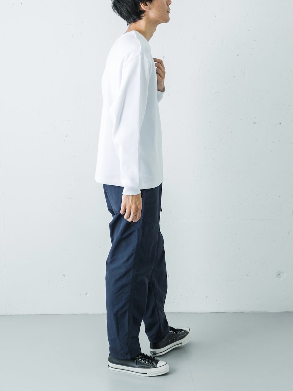 トップスは「UR TECH」の度詰めワッフルロングスリーブ。アーバンリサーチ独自の機能素材を使用しており、快適な着心地が魅力。目が詰まったしっかりとした生地感なので、白でも透けにくく、一枚で様になります。