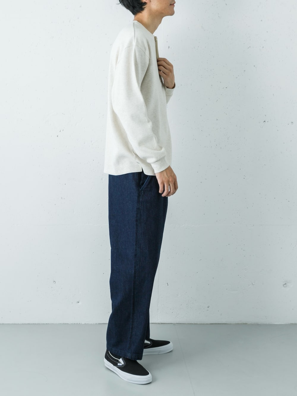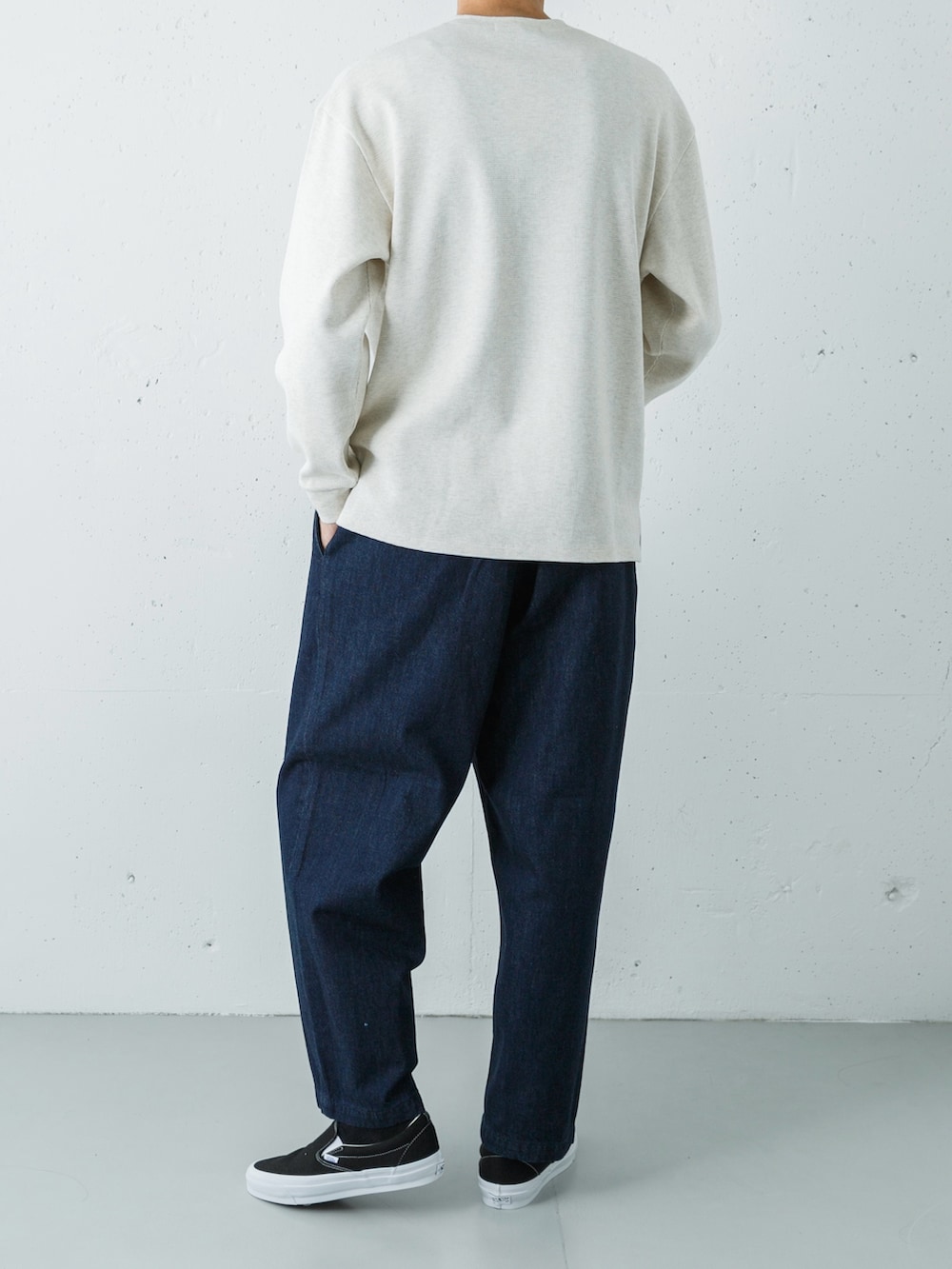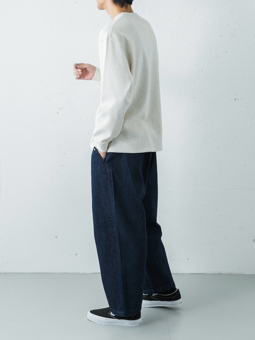 ボトムスには「DAD EASY WIDE DENIM」のダークブルーを合わせました。その名の通り、お父さんが履いているような絶妙なゆるさ(Dad感)を、現代的なワイドシルエットに昇華した一本。