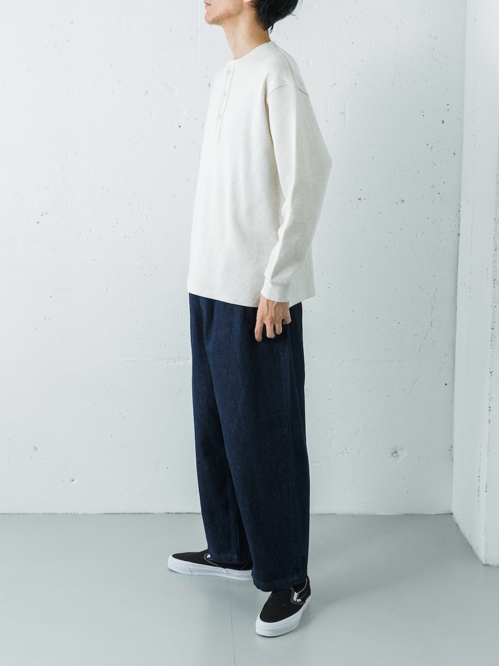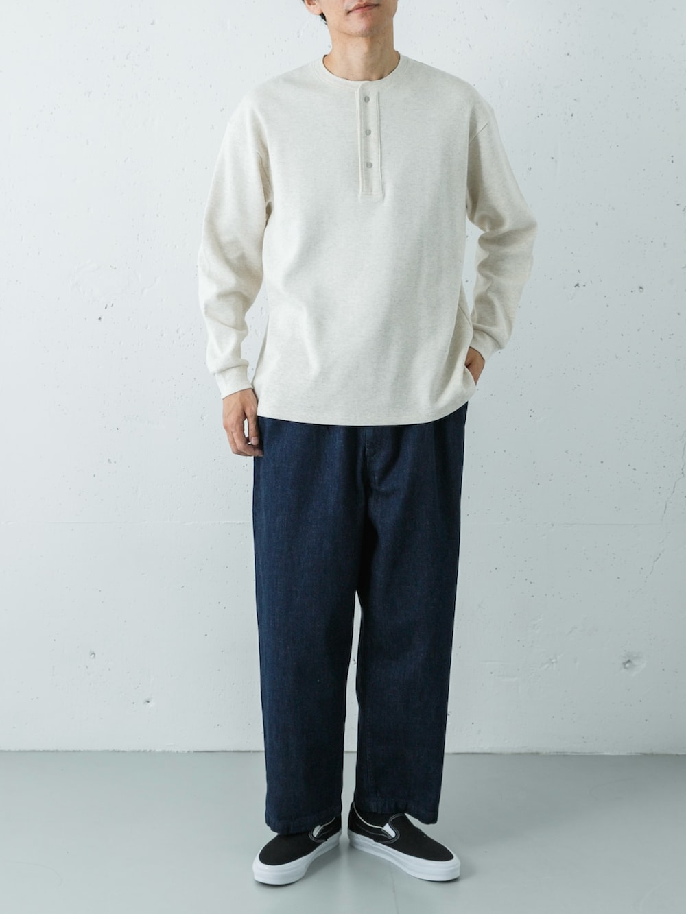 トップスは「UR TECH」の度詰めワッフルヘンリー。オートミールの優しい色味と、ボタンのあるヘンリーネックが顔周りにアクセントを加えます。機能素材ながらコットンのような風合いで、一枚でも様になる厚みです。