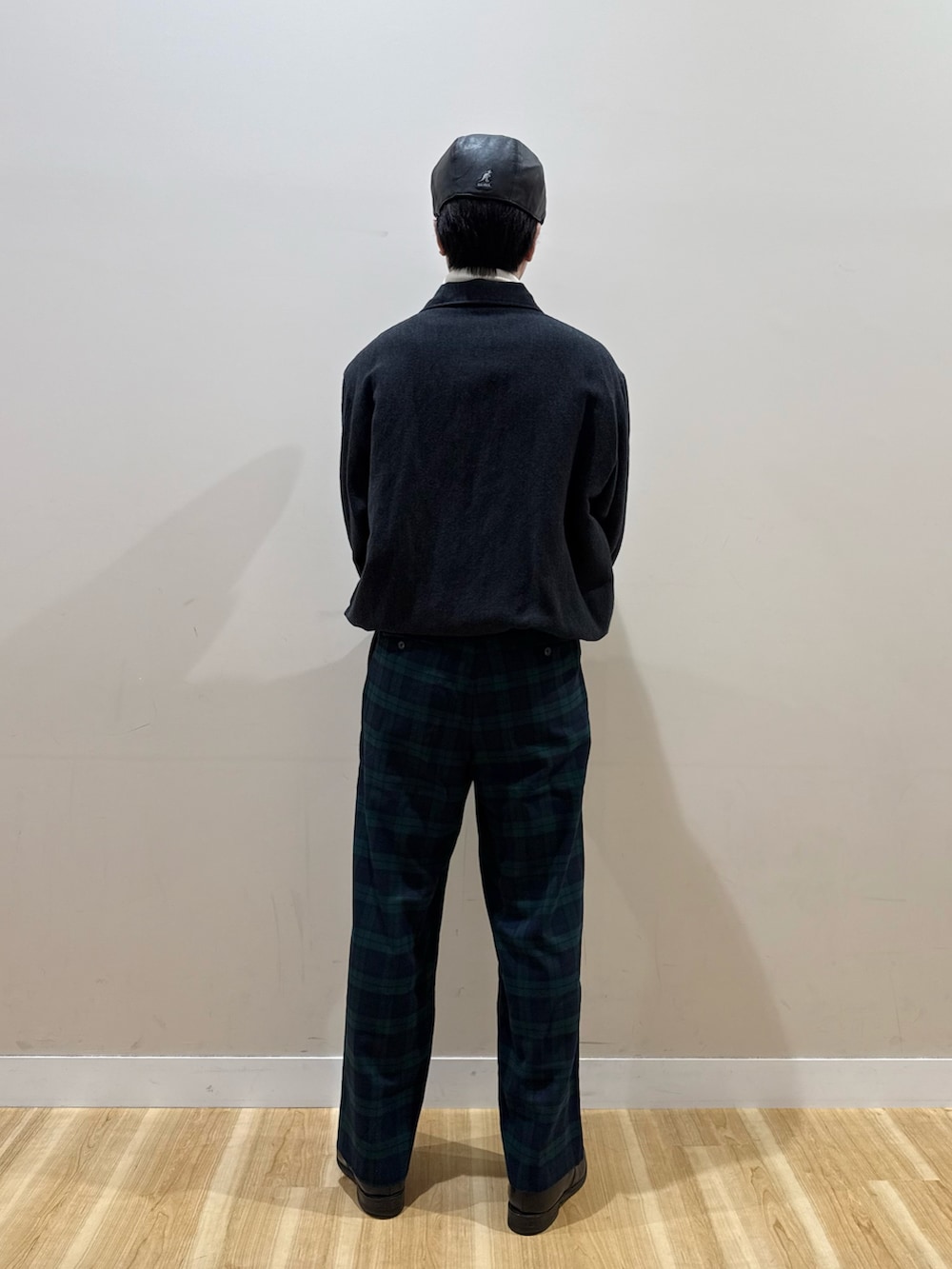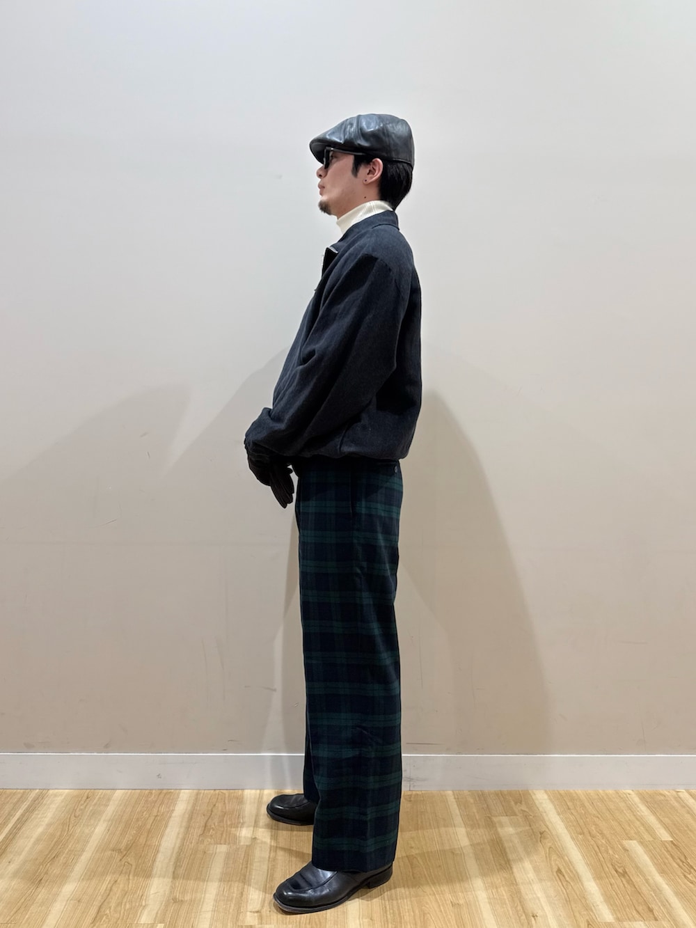 パンツのチェックやレザーグローブがアクセントになって見飽きないコーデになるかと。