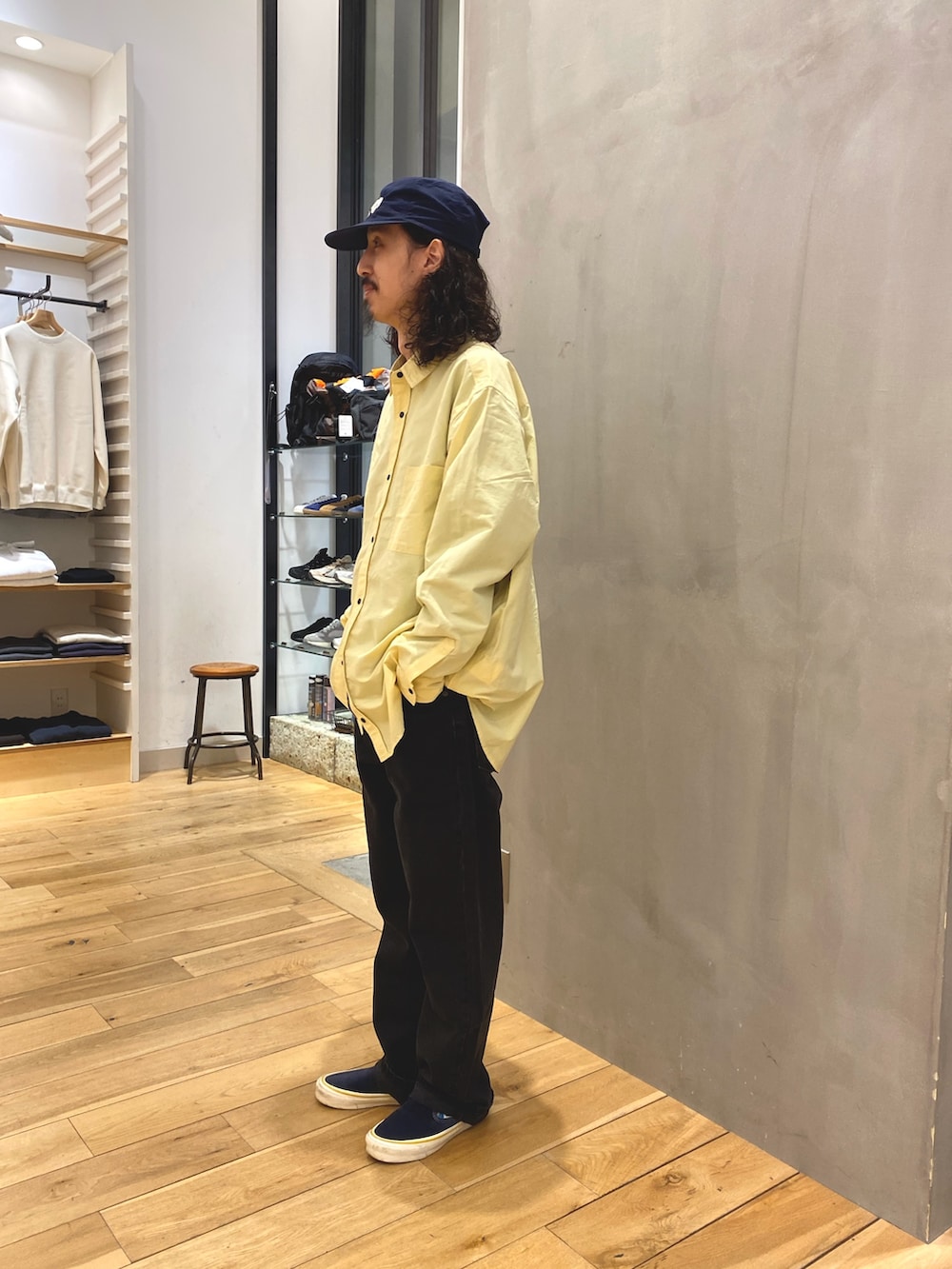 ブラックデニムと合わせて全体のバランス調節と