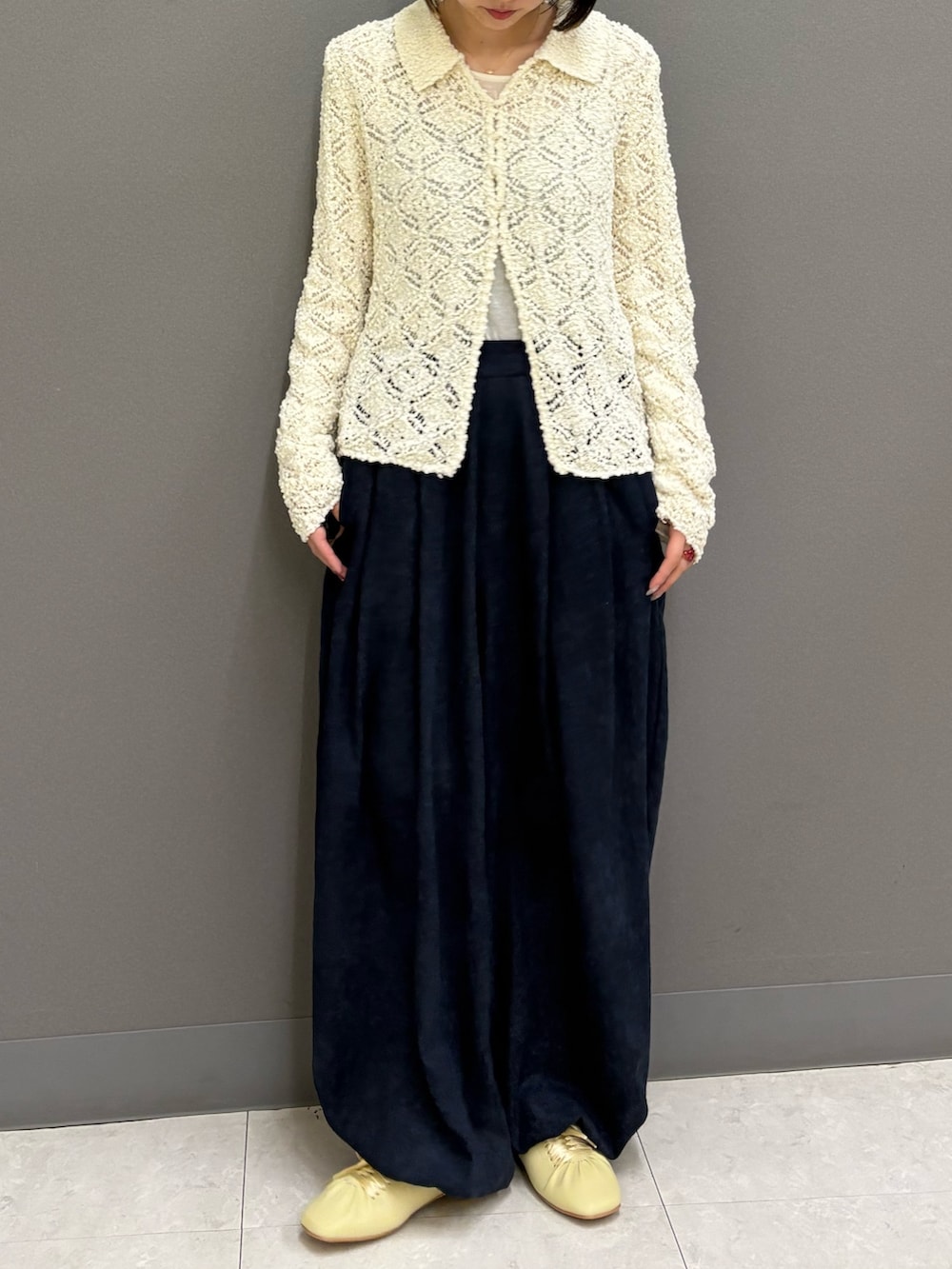 トップスに近い春色のシューズを持ってくることで一気に明るい印象に!!