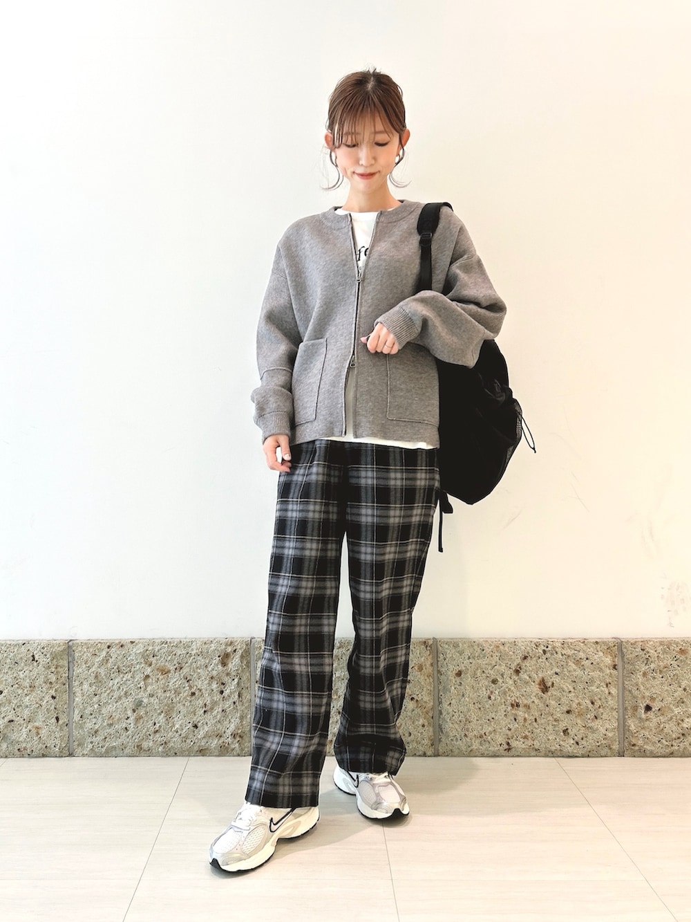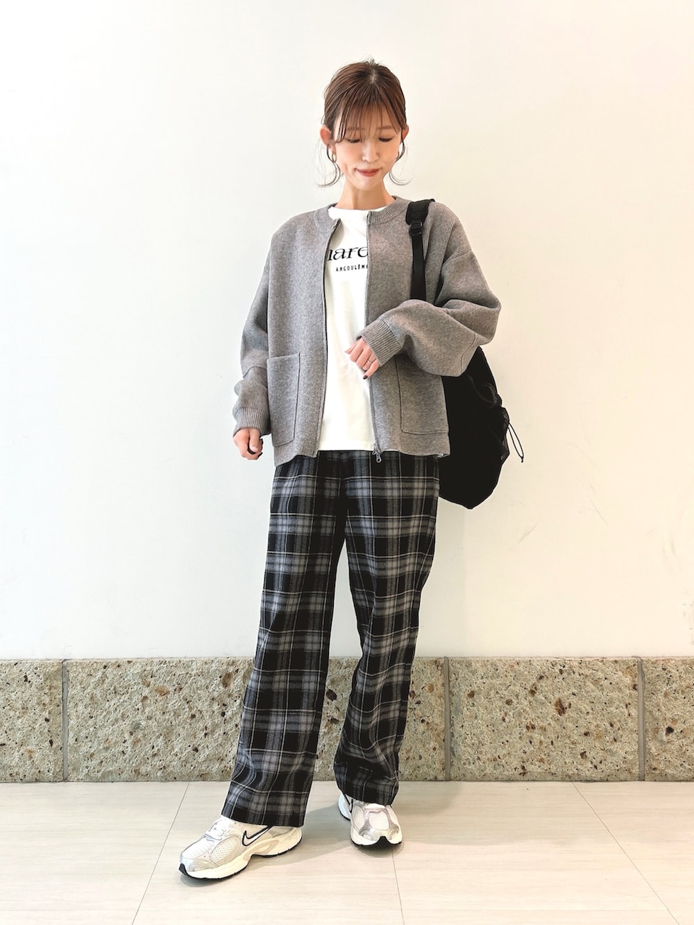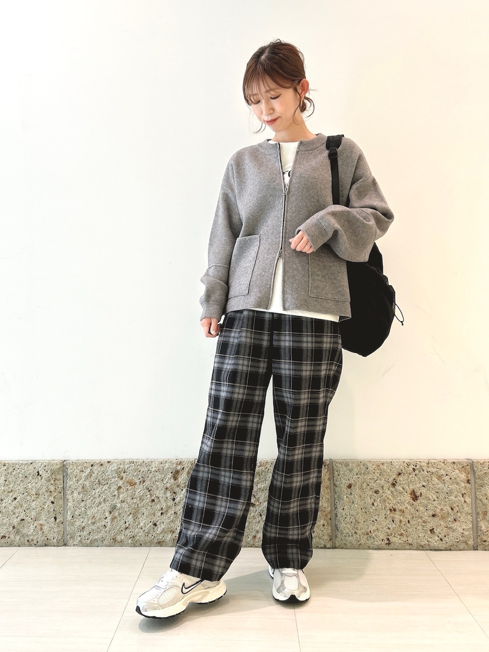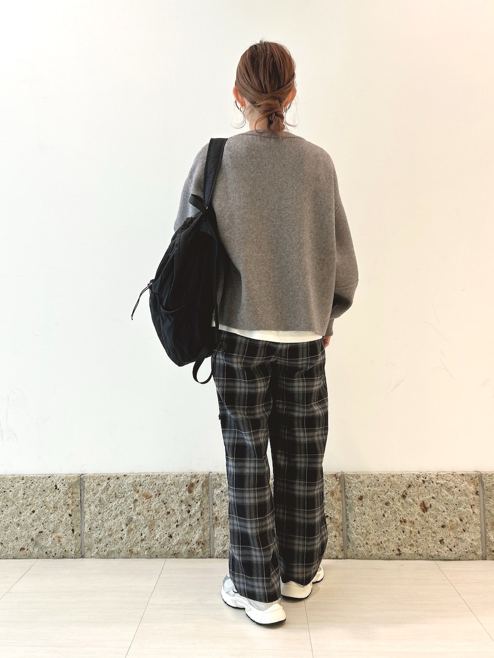 ボトムにはチェック柄のパンツを。
