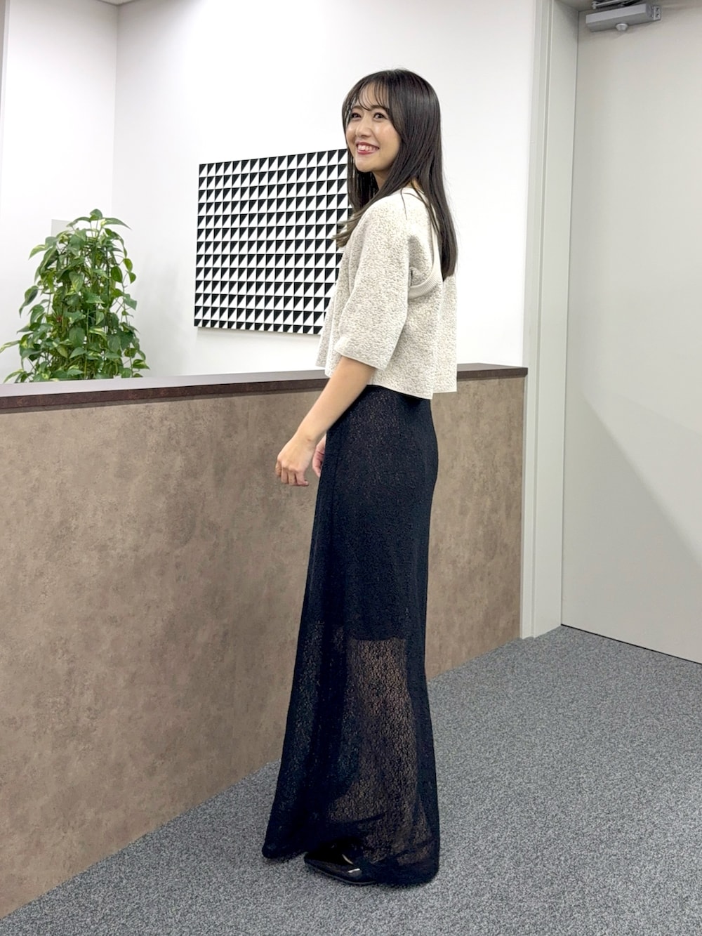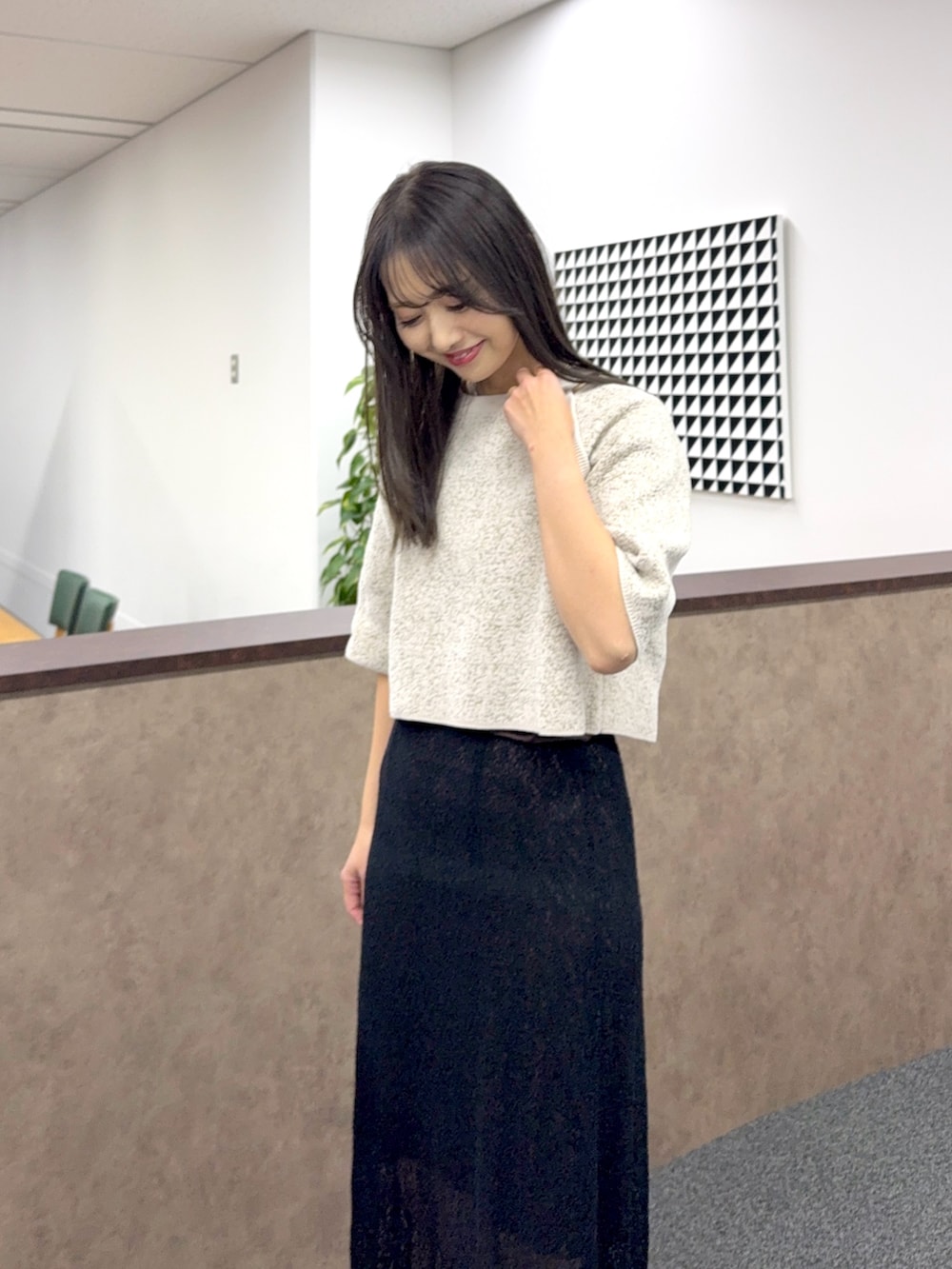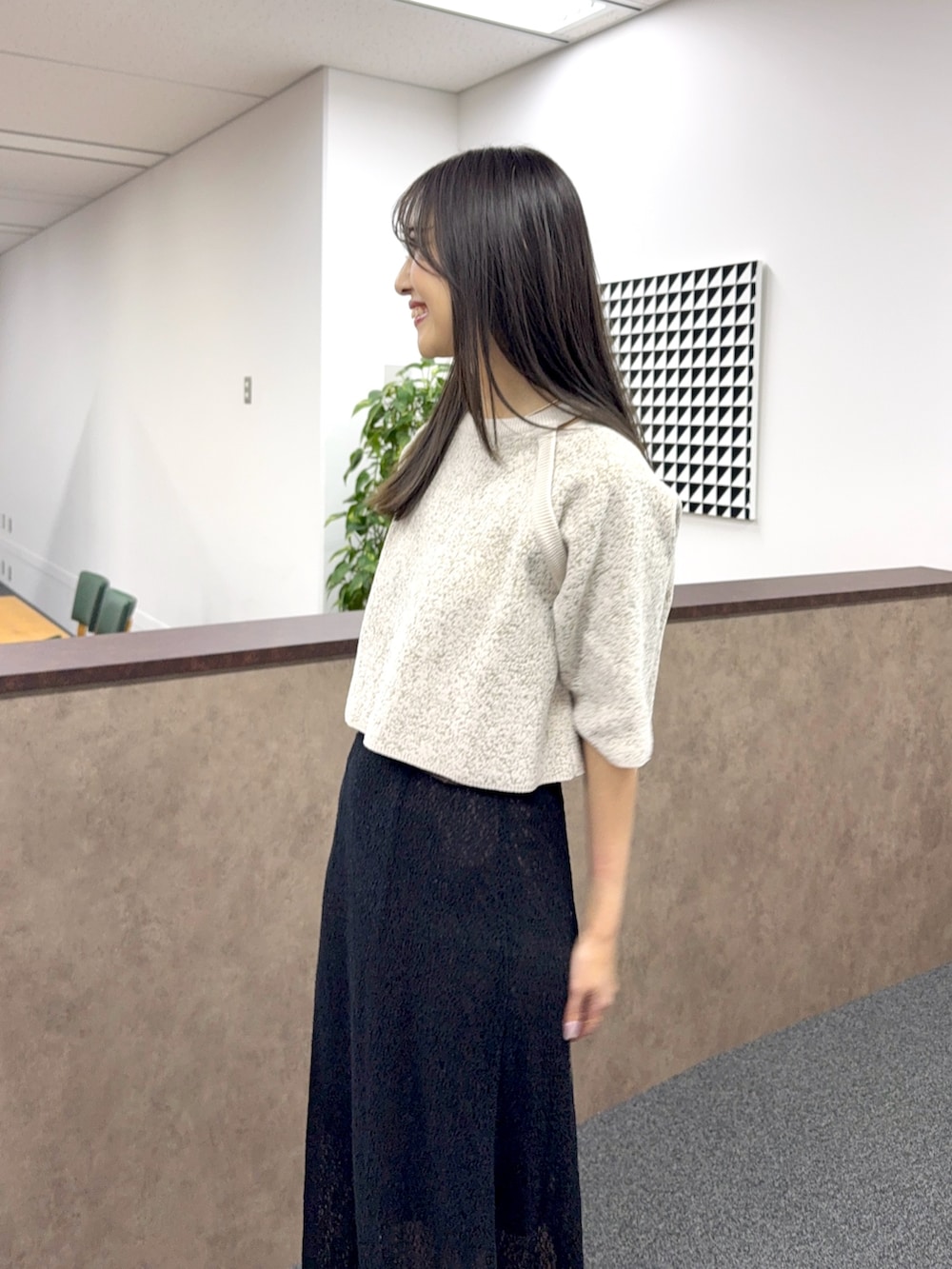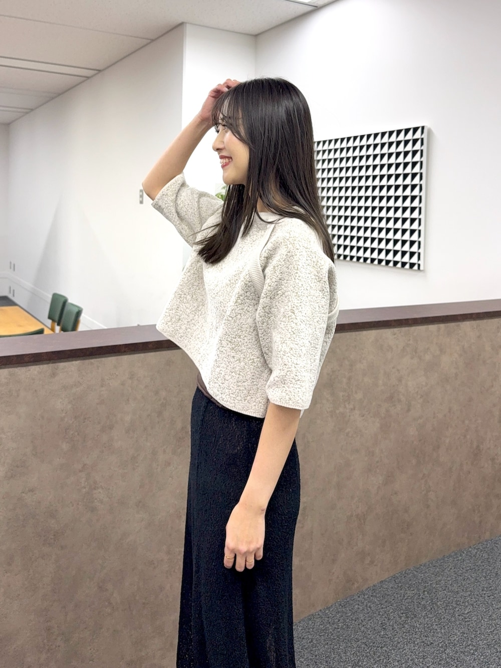 ニットは着心地も良く、ショート丈で合わせるボトムスも選ばずすっきりとした印象です。