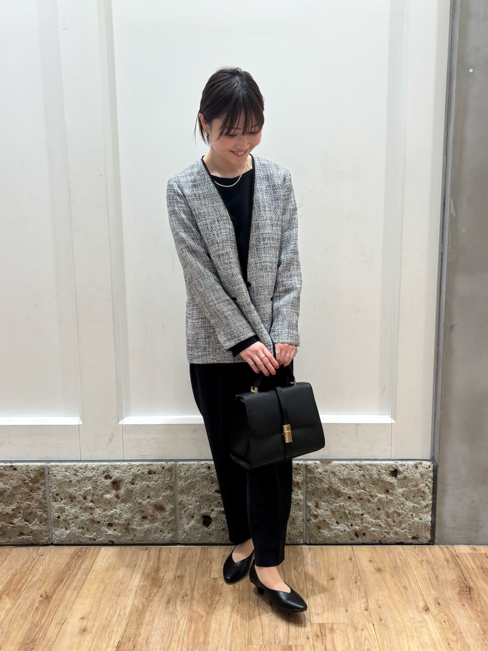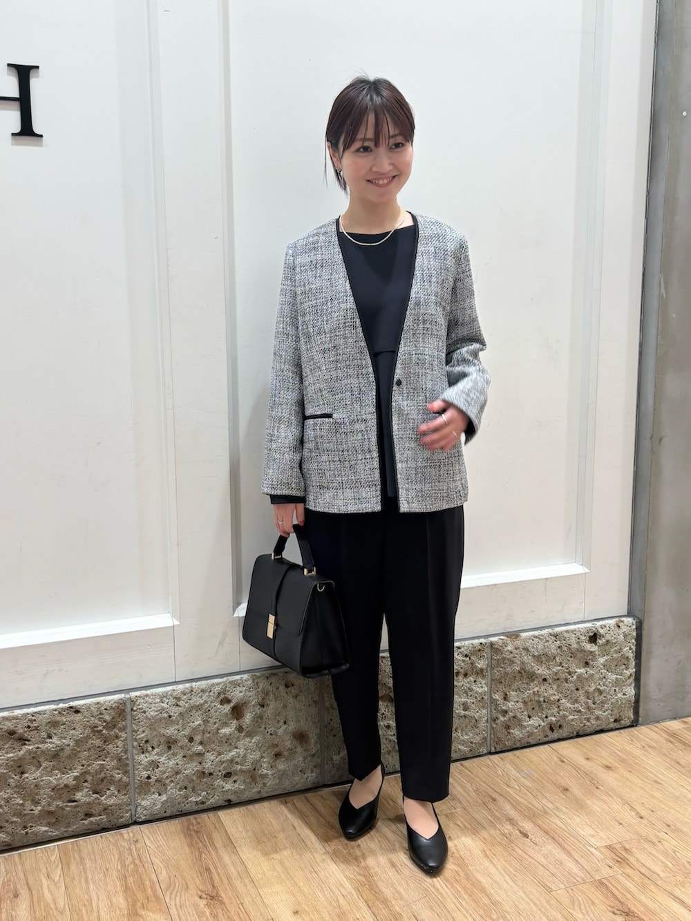 ジャケットを着用するといっきにセレモニー感がでますね!ツイードジャケットは着丈感が長めになっているので控えめながらも存在感のあるアイテムになっています◎
