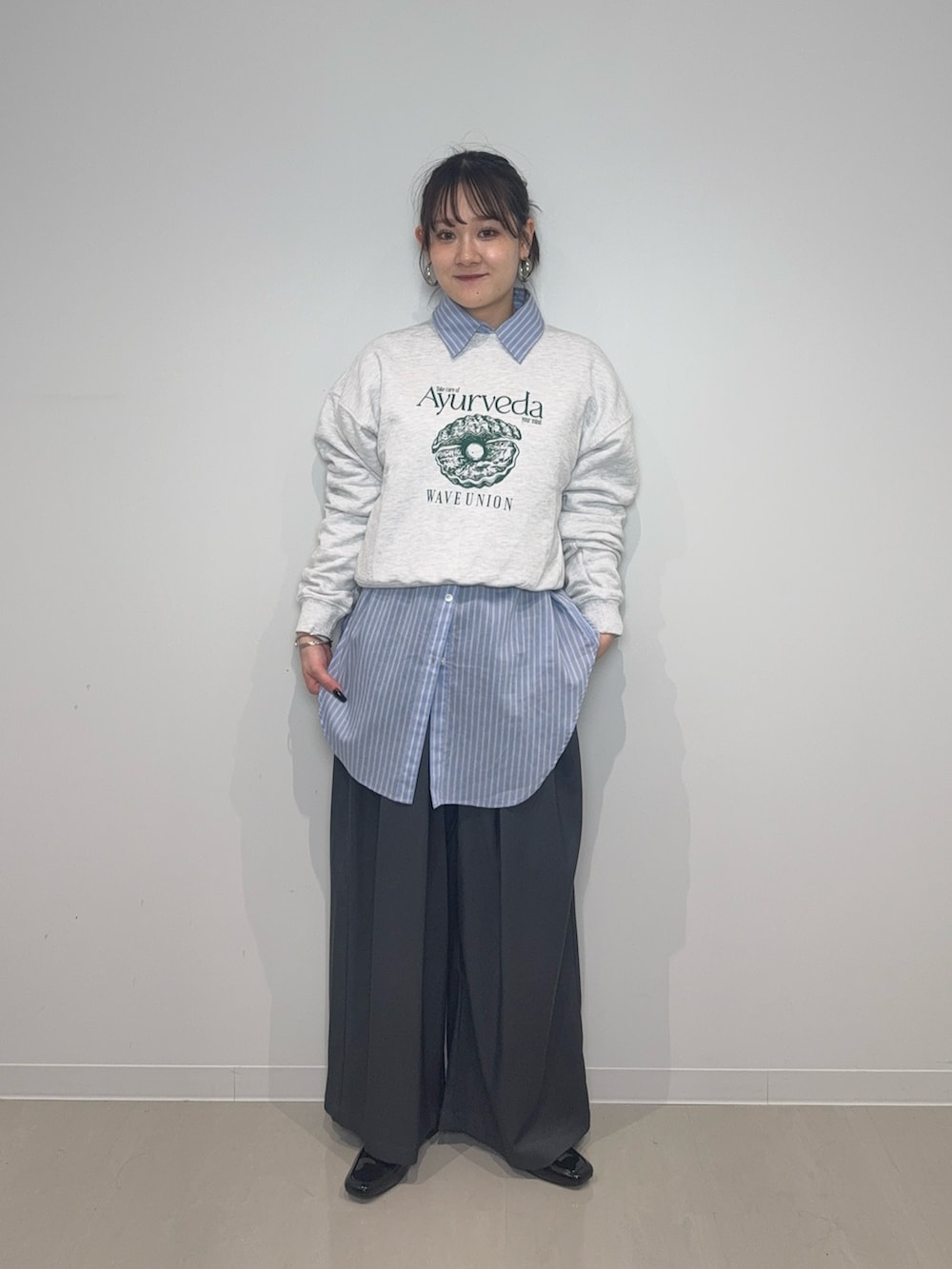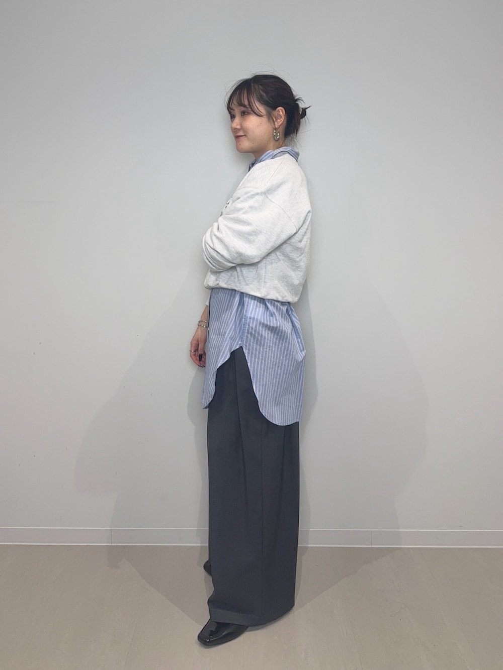 スッキリとした着丈と分厚すぎない生地がスウェットながらもカジュアルすぎずスッキリ着て頂けます!一枚で着てもおしゃれですが、今回はストライプシャツをレイヤードしてみました!