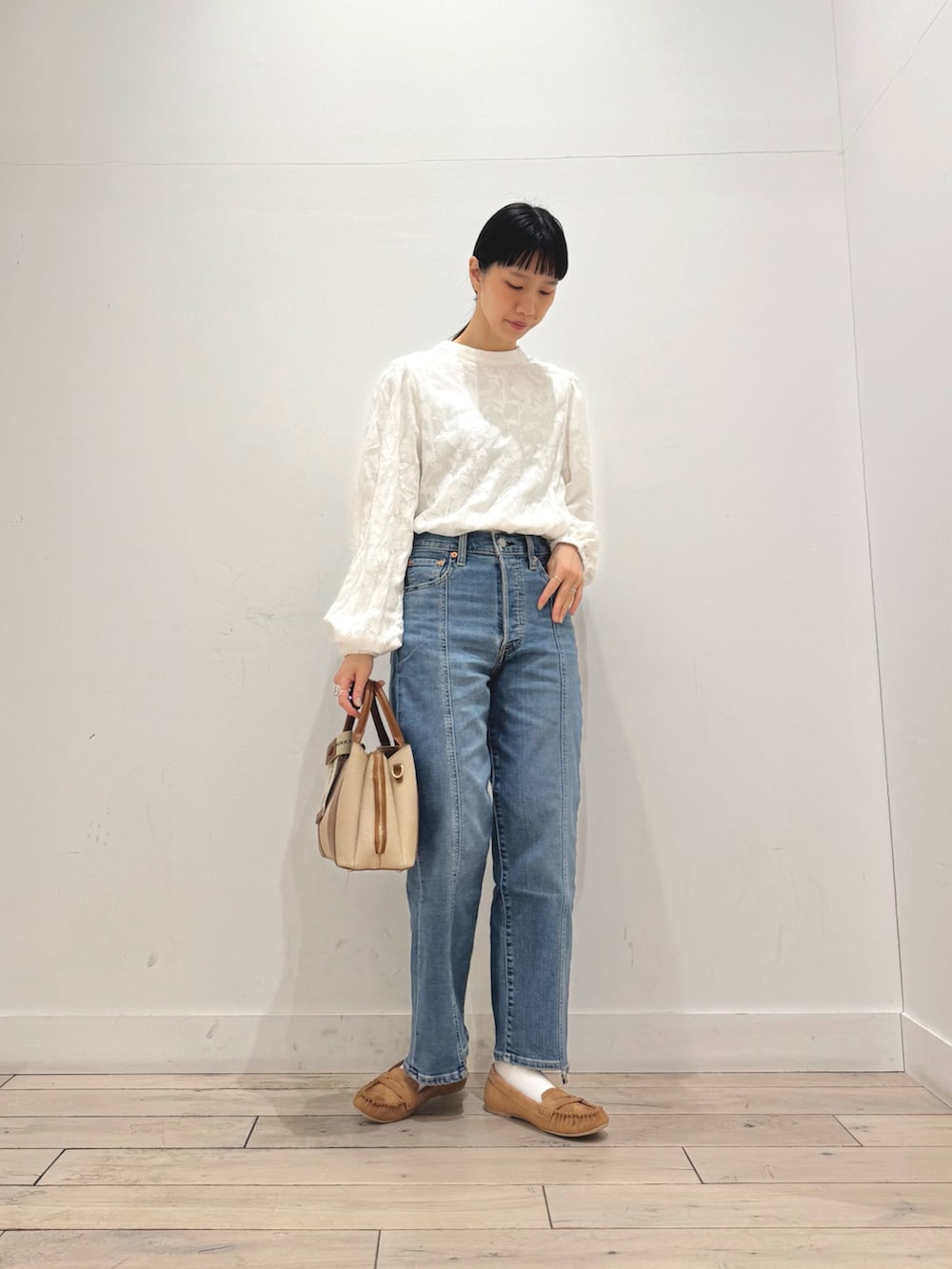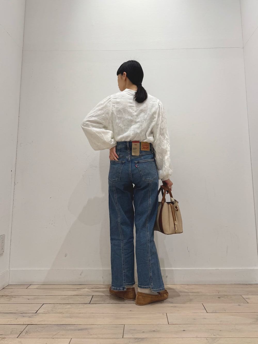 ブラウスの袖にボリュームがあるので、デニムはスッキリなストレートのものに。裾のデザインかわいいです◎