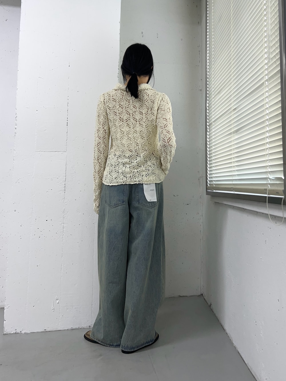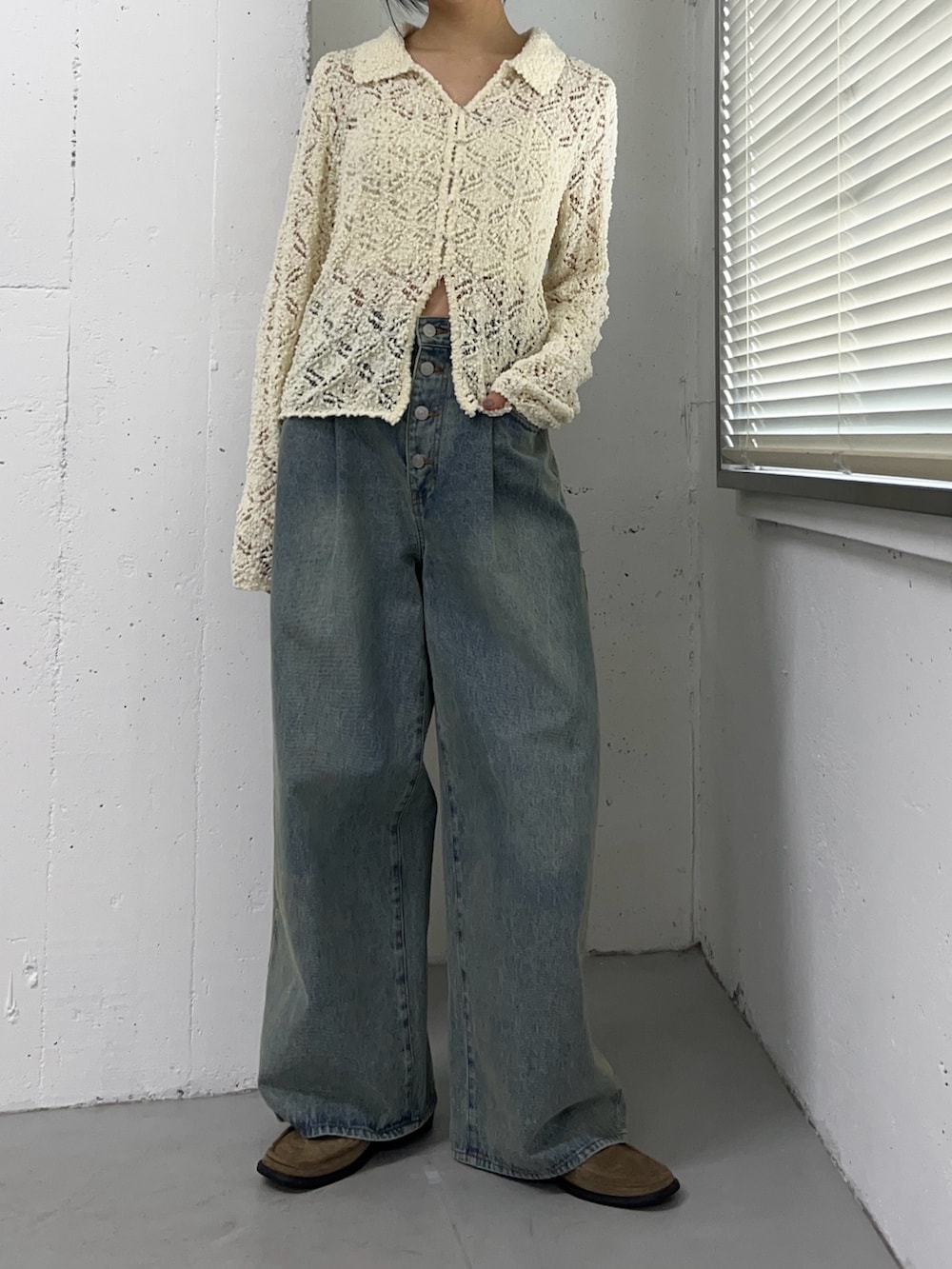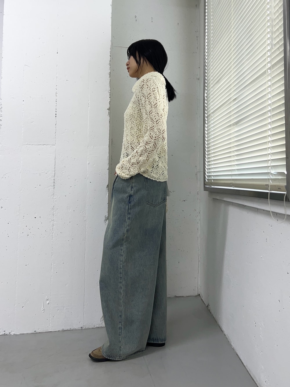 クロシェレースニットのトップスに、デニムを合わせて着てみました。