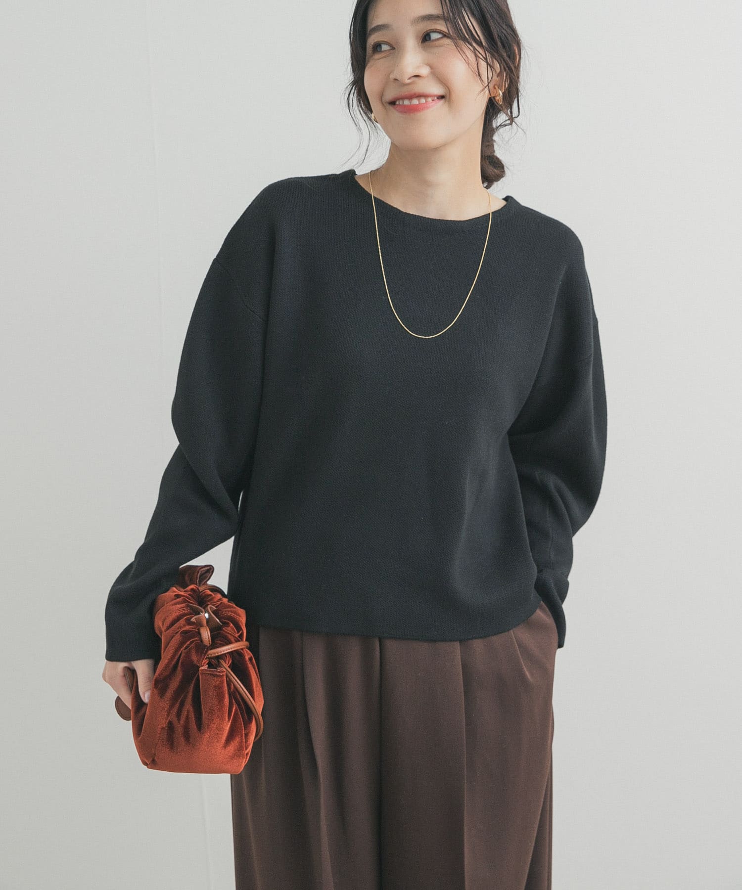 シンプルなニットとパンツもインナーで雰囲気を変えて着れる万能アイテム。