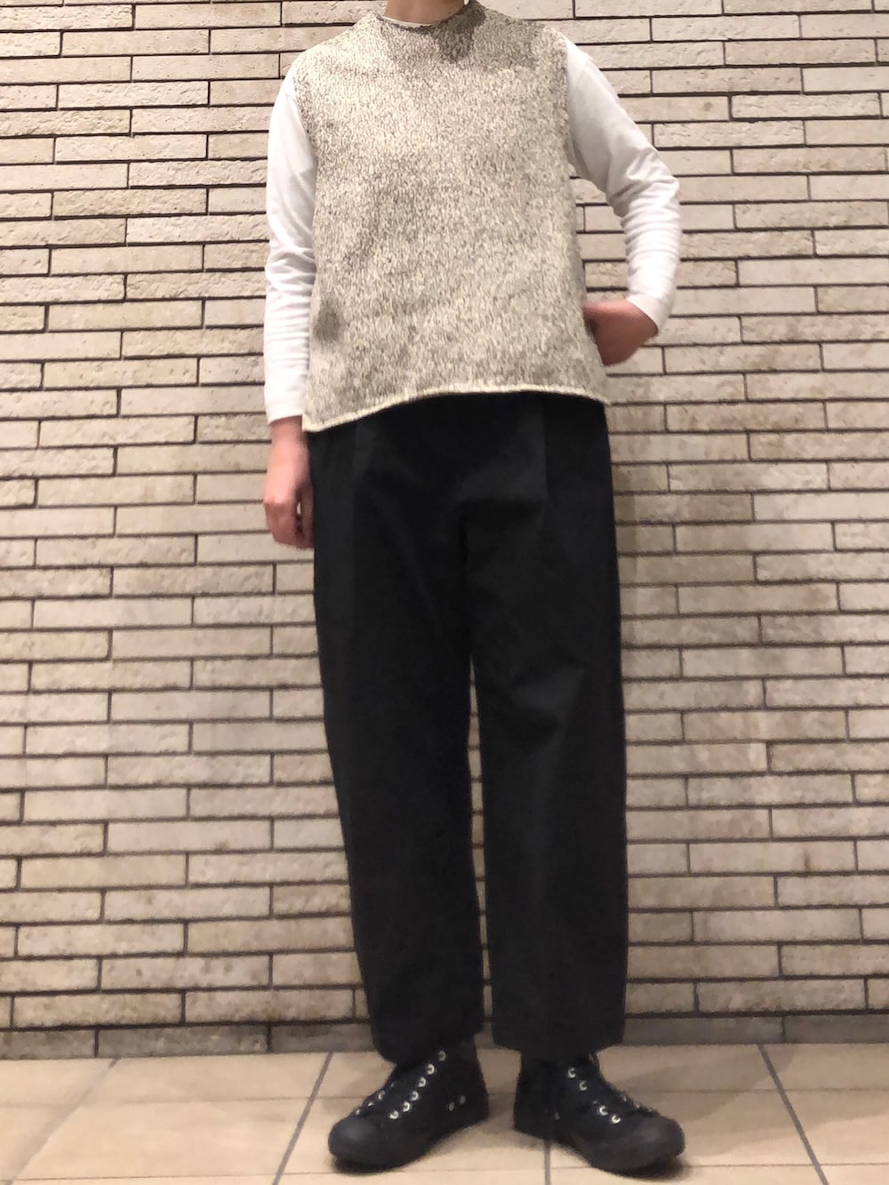 テープヤーンで編み立てられたコットンニットは、春先のスタイリングに重宝します。