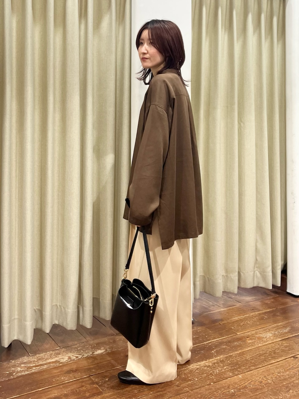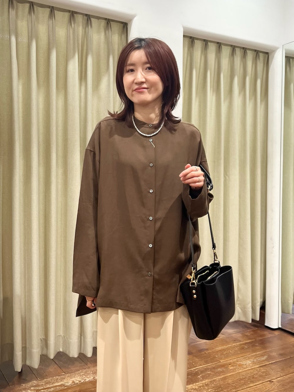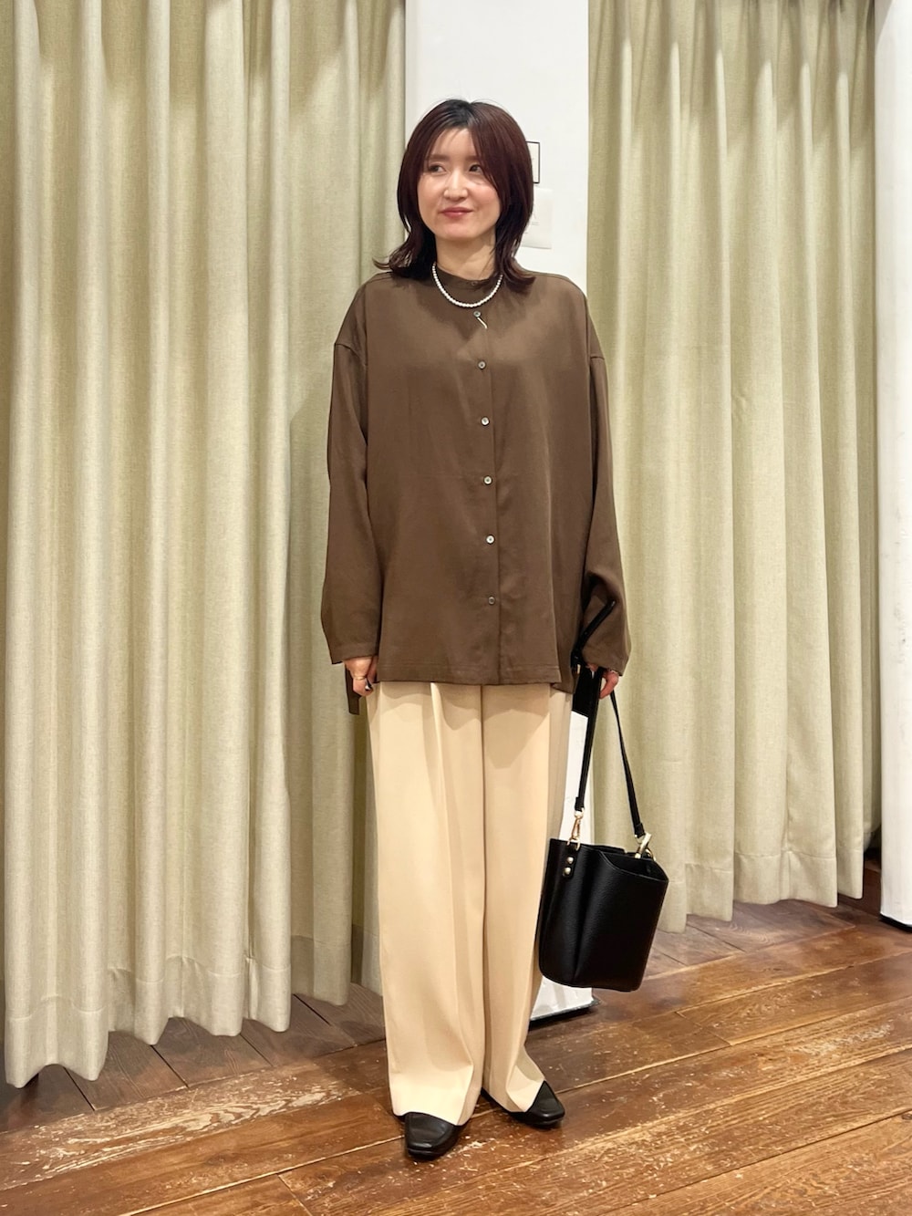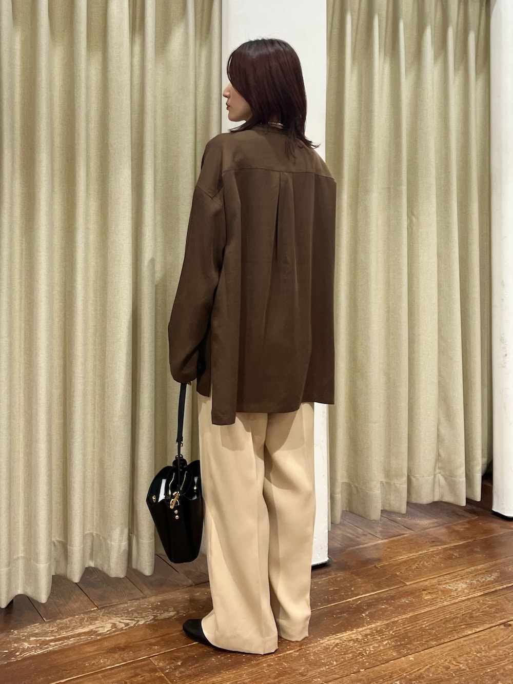 ブラウスは光沢のあるブラウンのカラーが上品で落ち感もあり大人っぽく着ていただけます。