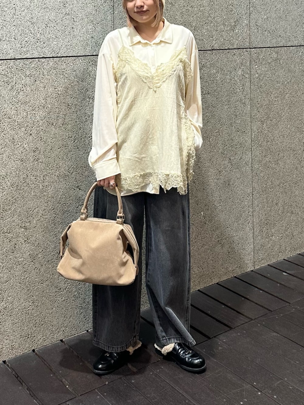 ブラックデニムとビーニーでモード感を出しつつ、レースキャミをプラスしてレディにも♡