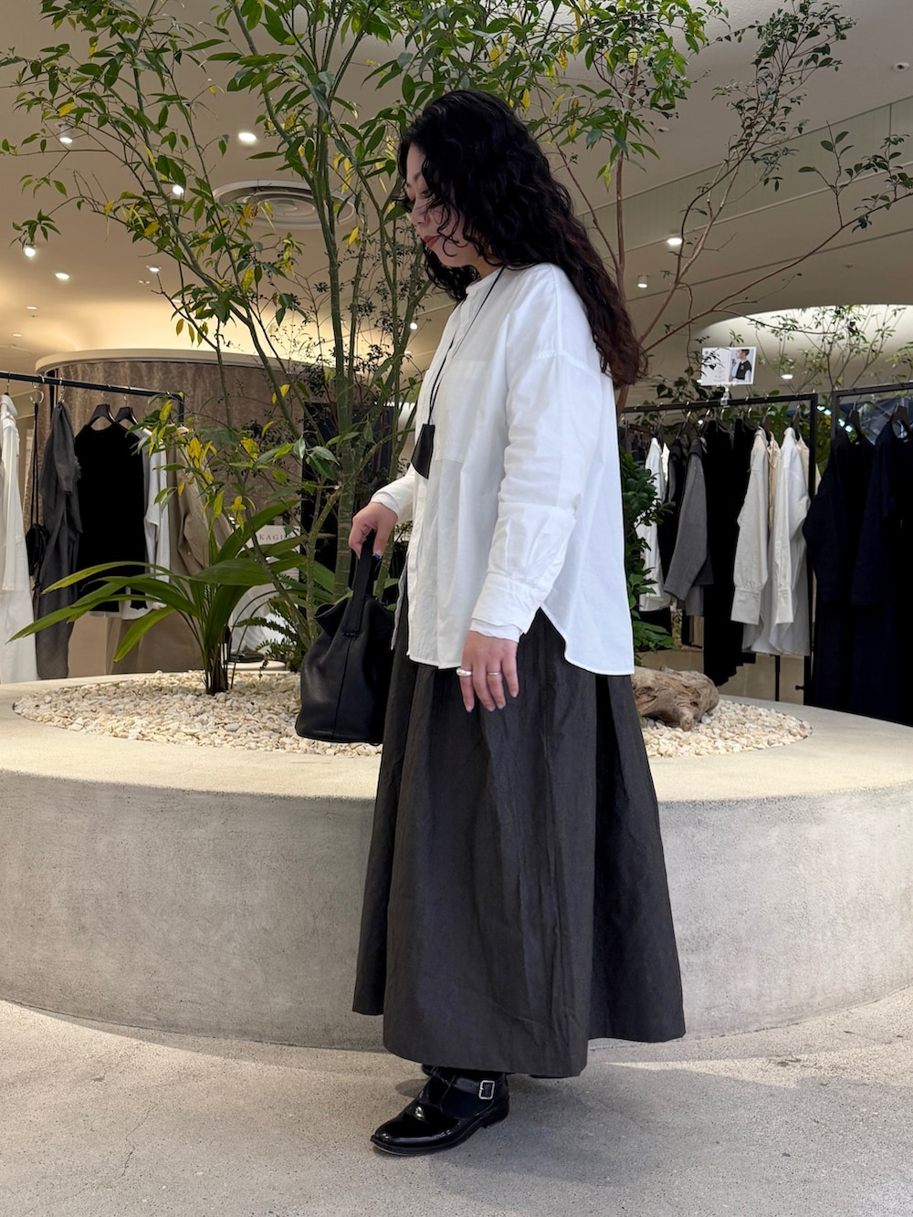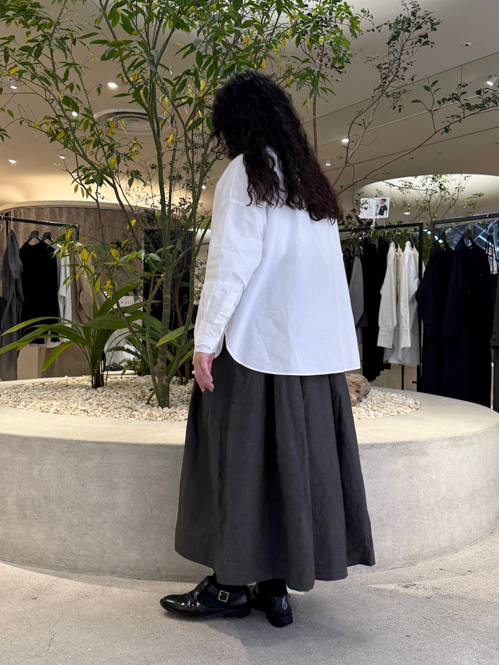 シャツは再入荷の度に問い合わせの多いアイテムです。一枚あると着回し抜群で、羽織でもベストのインナーにも◎身幅は体のラインを拾わないゆったりシルエットで、丈は腰回りが隠れてインせずに着れる長すぎない丈感が着方を選ばず個人的に嬉しいポイントでした。