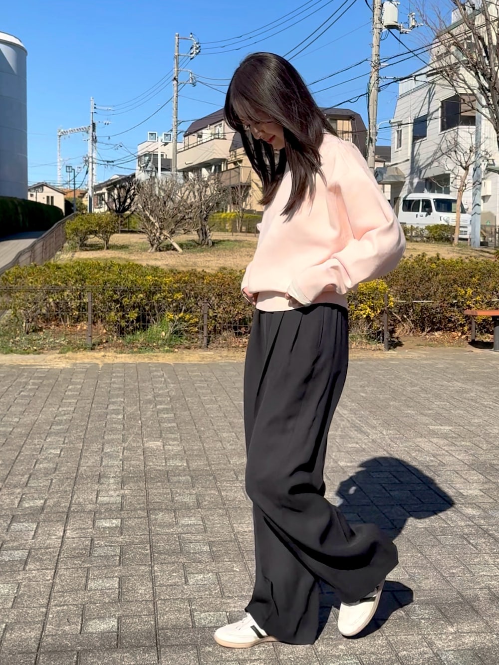 ボトムはてろっとした落ち感のある素材でウエストも総ゴムでリボンで調整ができます。