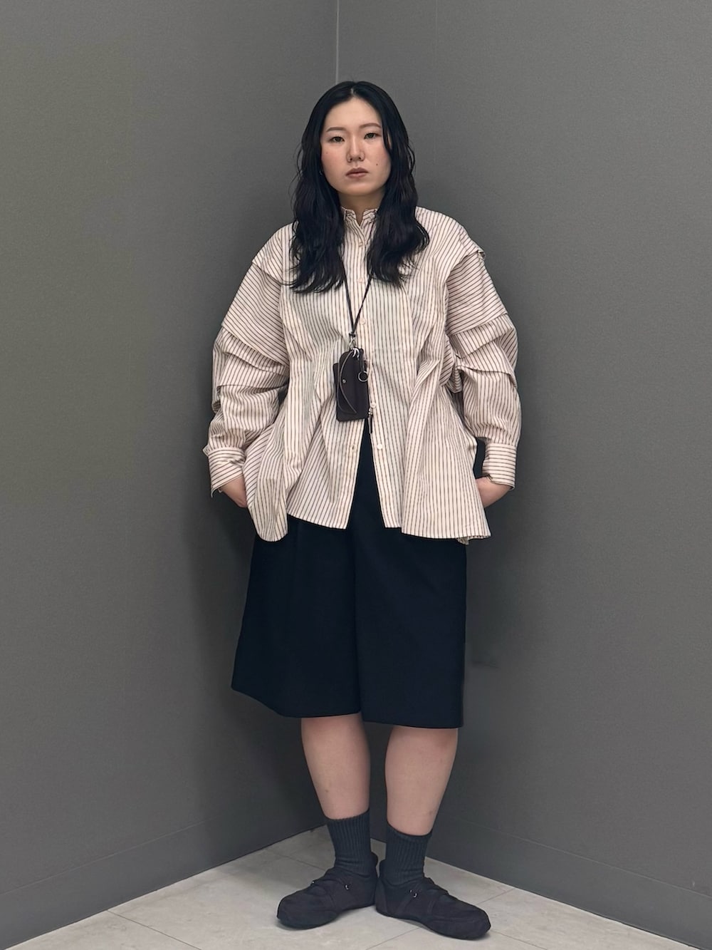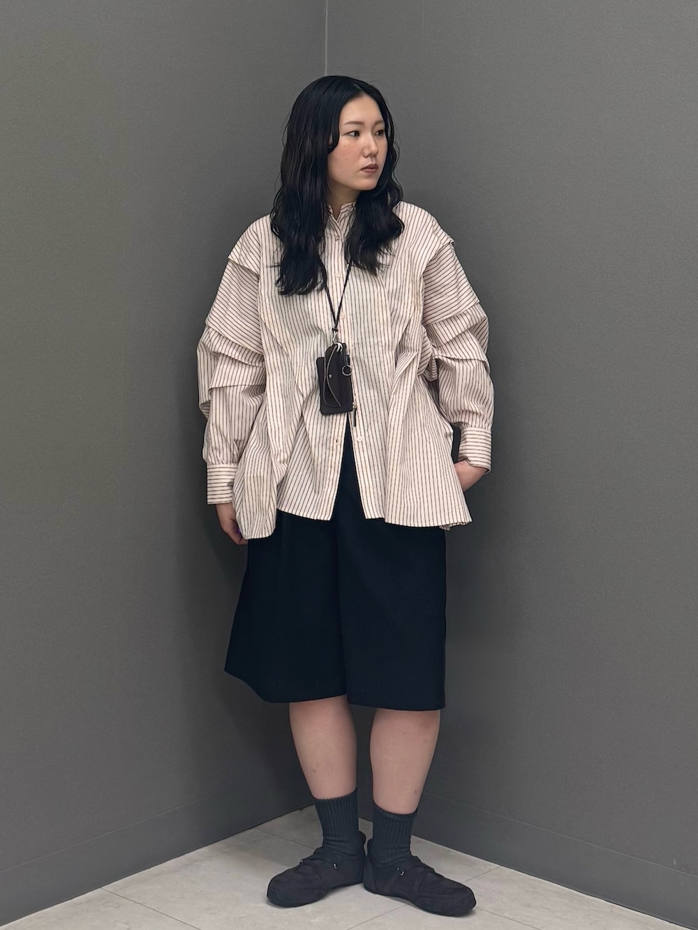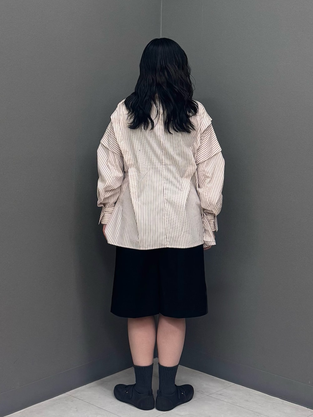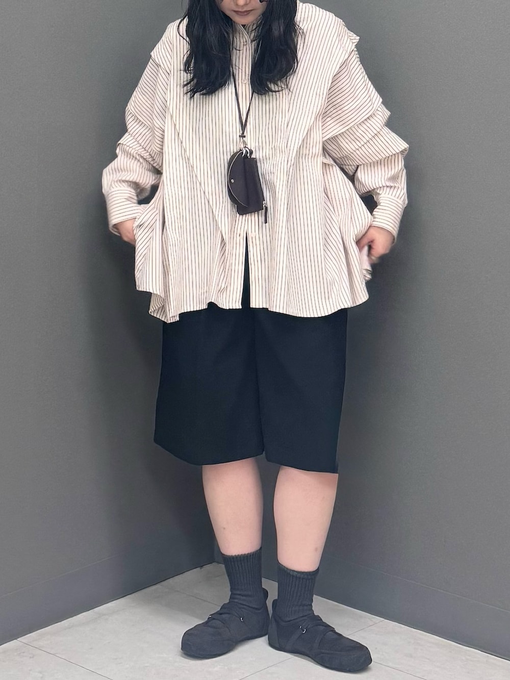 アシンメトリーに施されたタックが特徴的なストライプシャツ