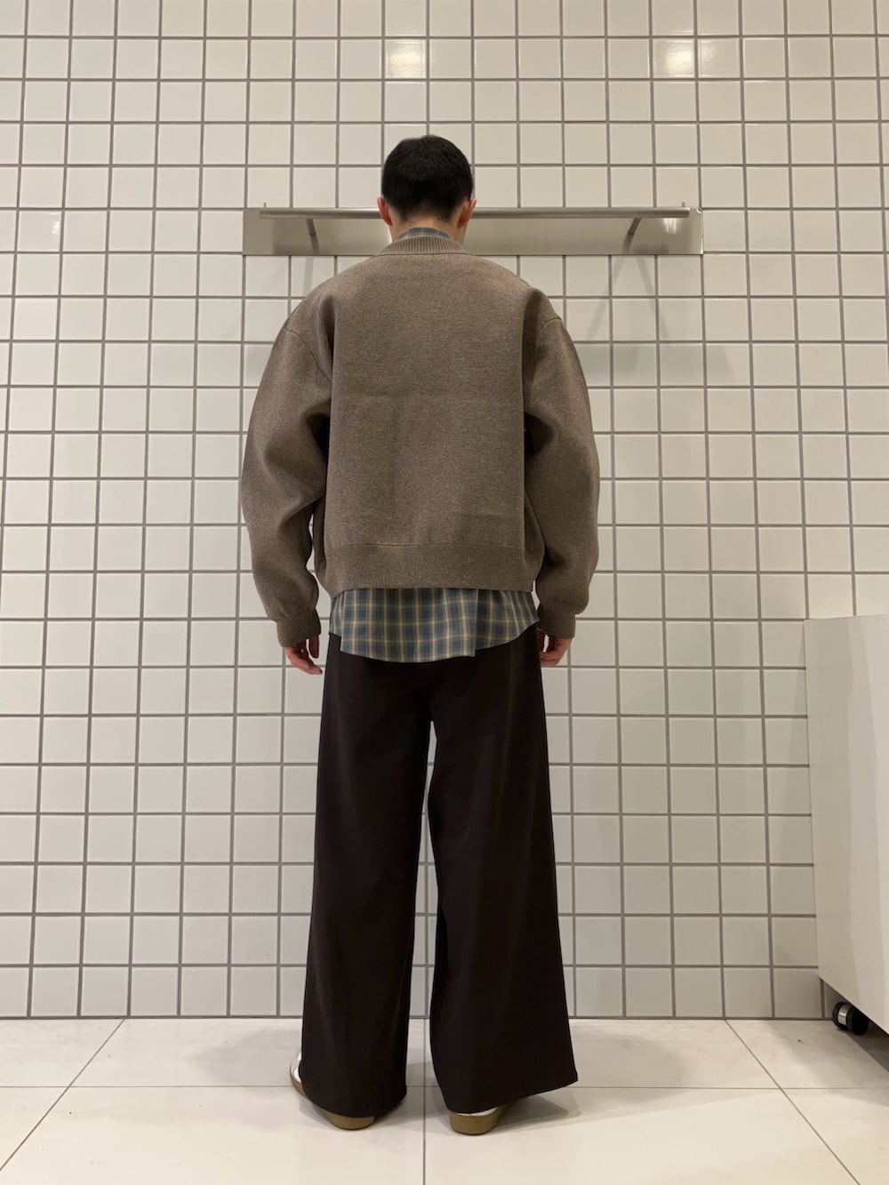 春らしいブラウンのニットブルゾンにチェックのシャツを合わせました。