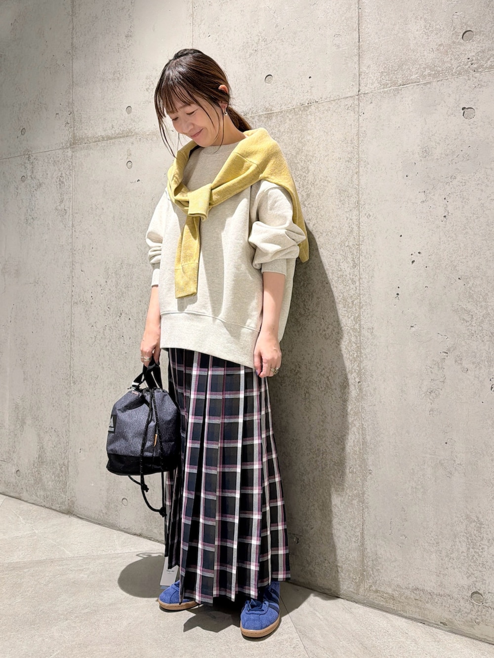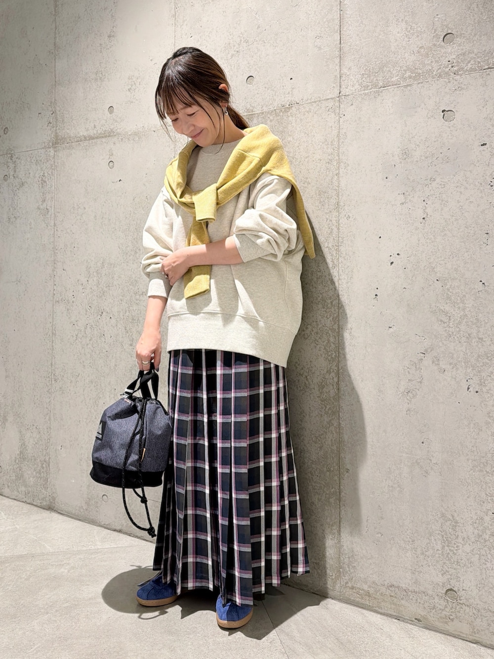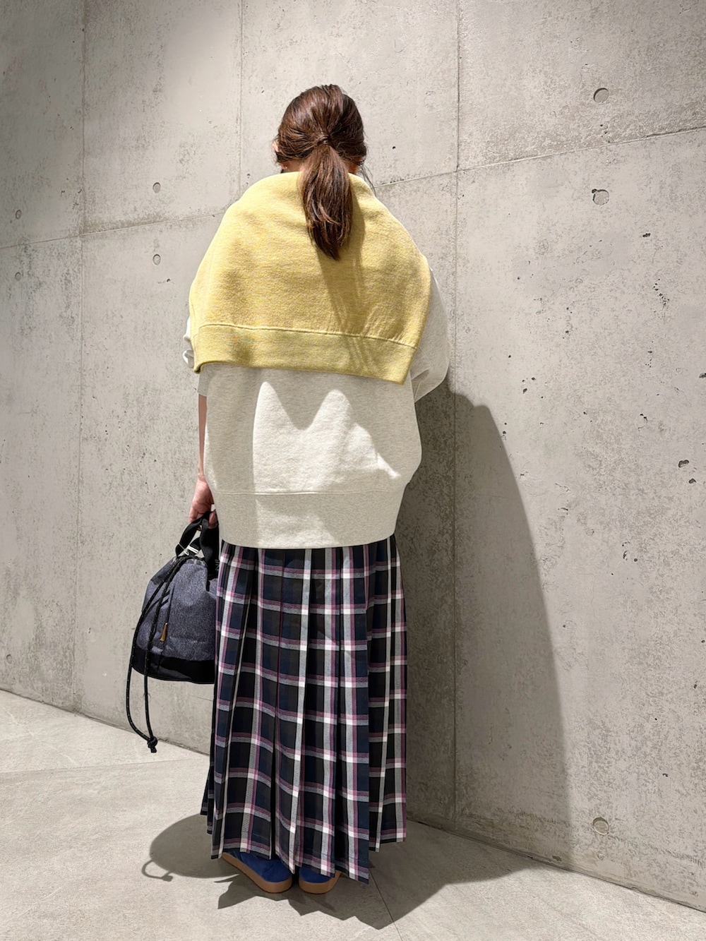 黄色のニットを肩掛けして春カラーをプラスしてみました。