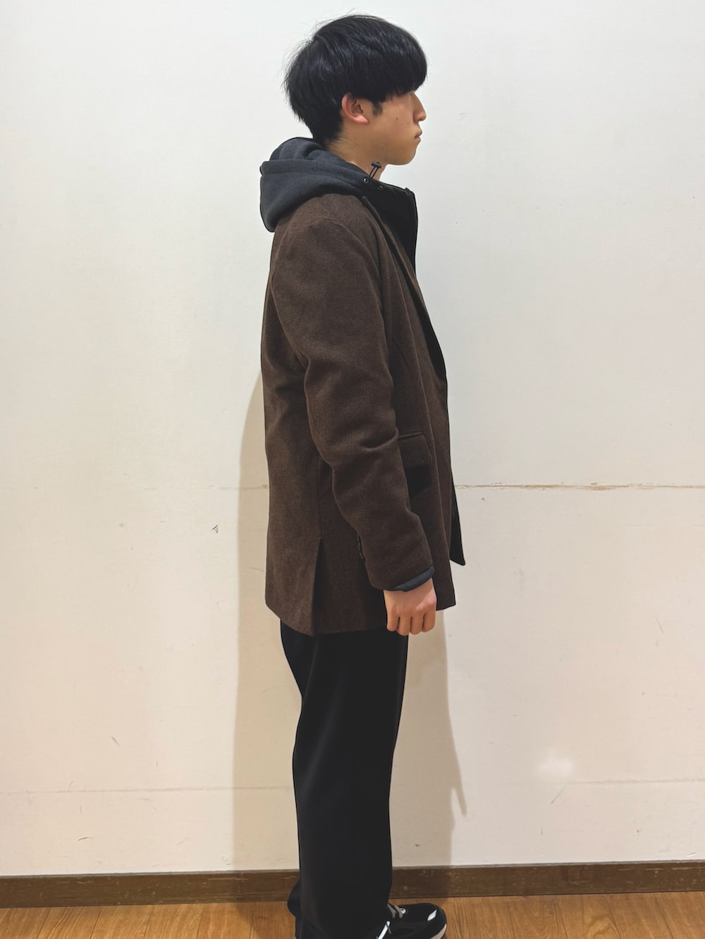 ウールのジャケットに、パーカーを組み合わせて、キレイめカジュアルコーデにしました