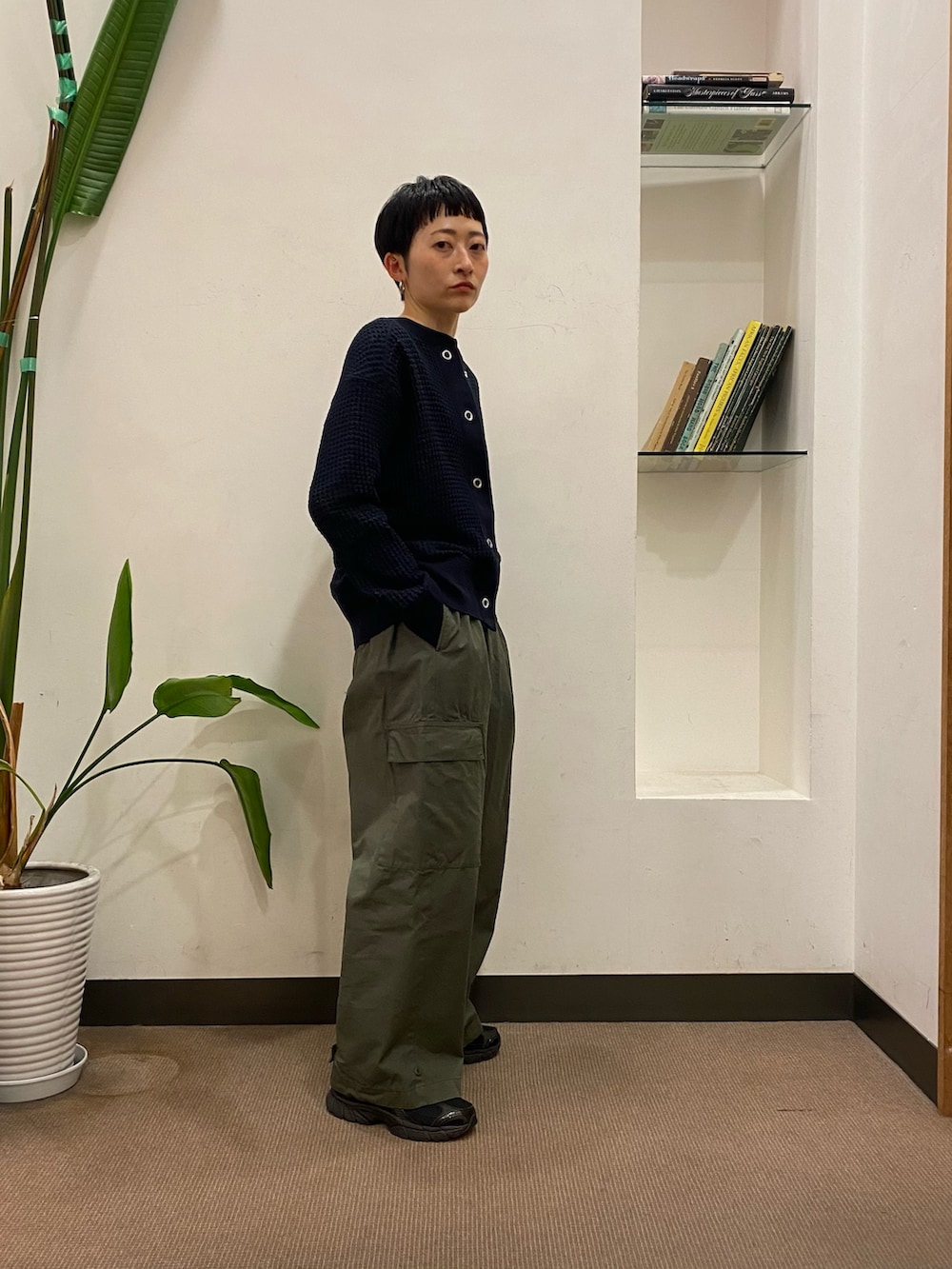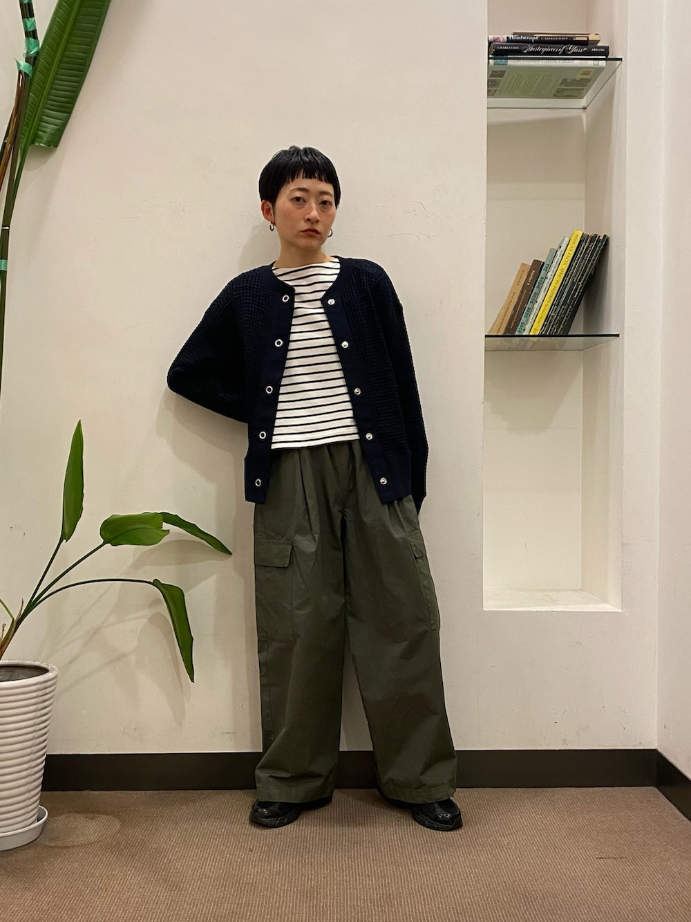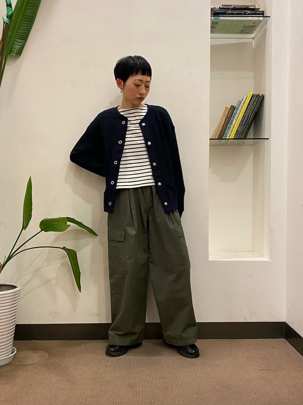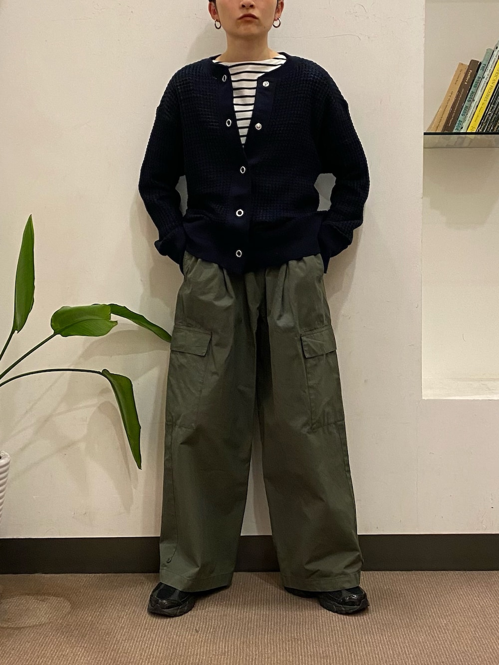 パンツがワイドなので、カーディガンのボタンの開け方でバランスを取りました!