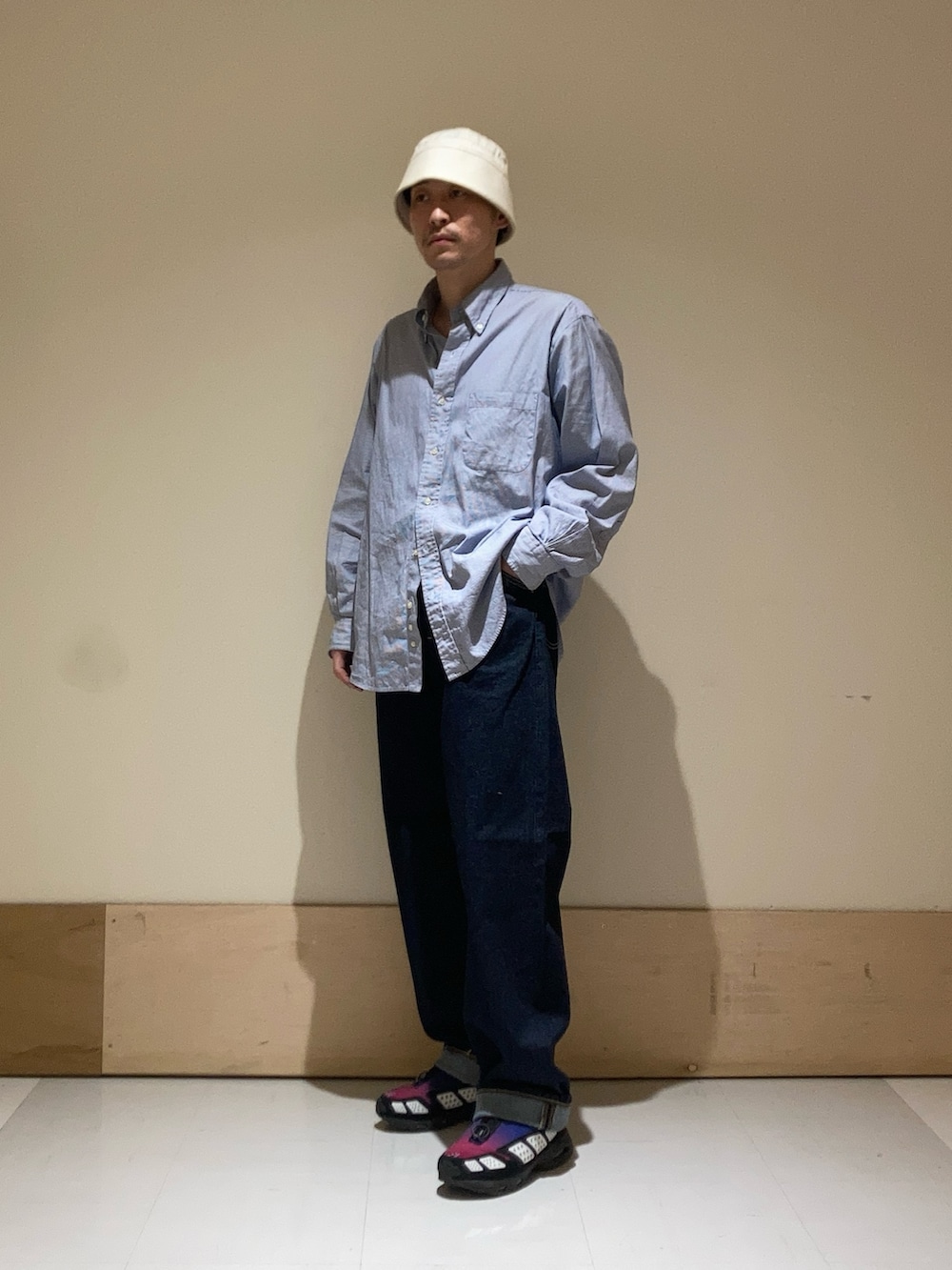 スッキリと履かれたい方はもちろんマイサイズですが、ちょっとイナたく履くのも気分がもって方、ワンサイズ上げてみてください。