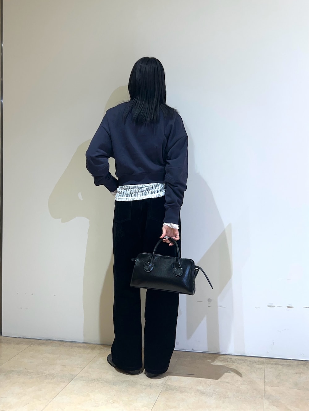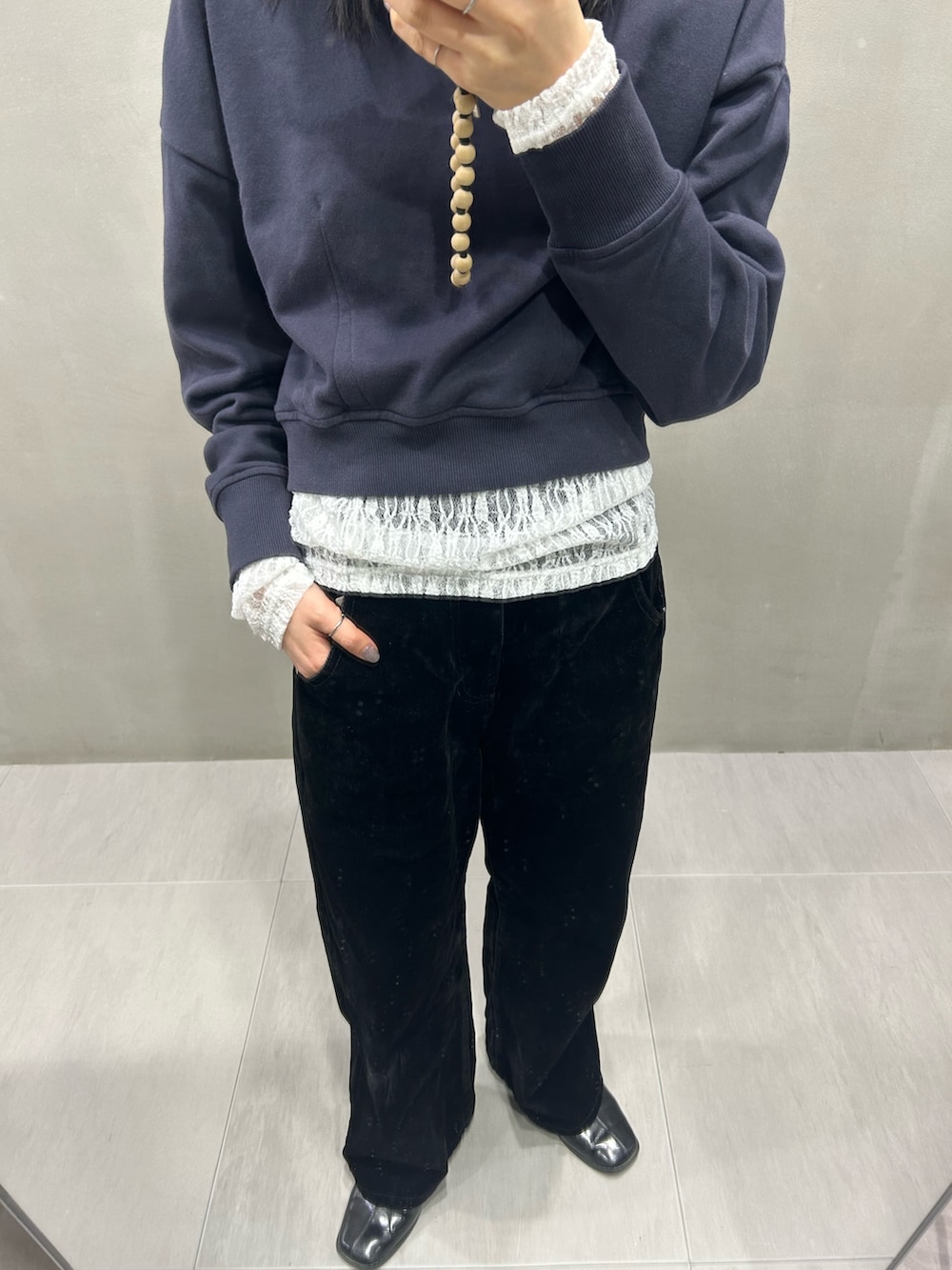 コンパクトフォルムスウェットに、レースのトップス、ブラックのデニムを合わせて着てみました。