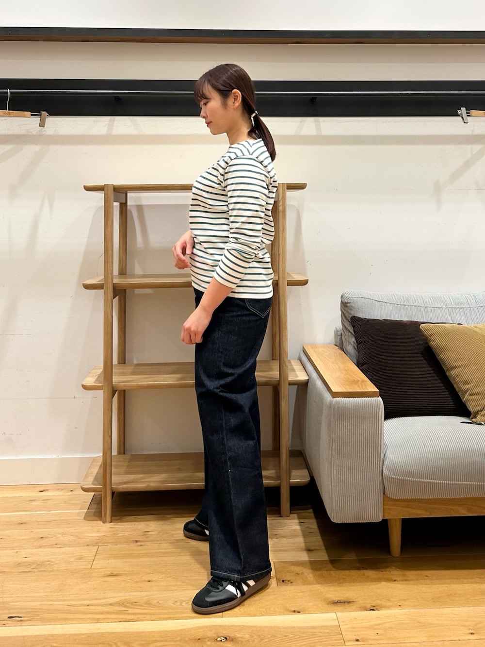 美シルエットの完全別注のデニムをご紹介します!足元にボリュームがたっぷり出る太めのワイド、それでいてヒップやもも周りは余分なボリュームを出さない設計で、スマートかつラフな着こなしが叶うデニムです。シンプルでサラッと着れるトップスとの相性が良さそうです。