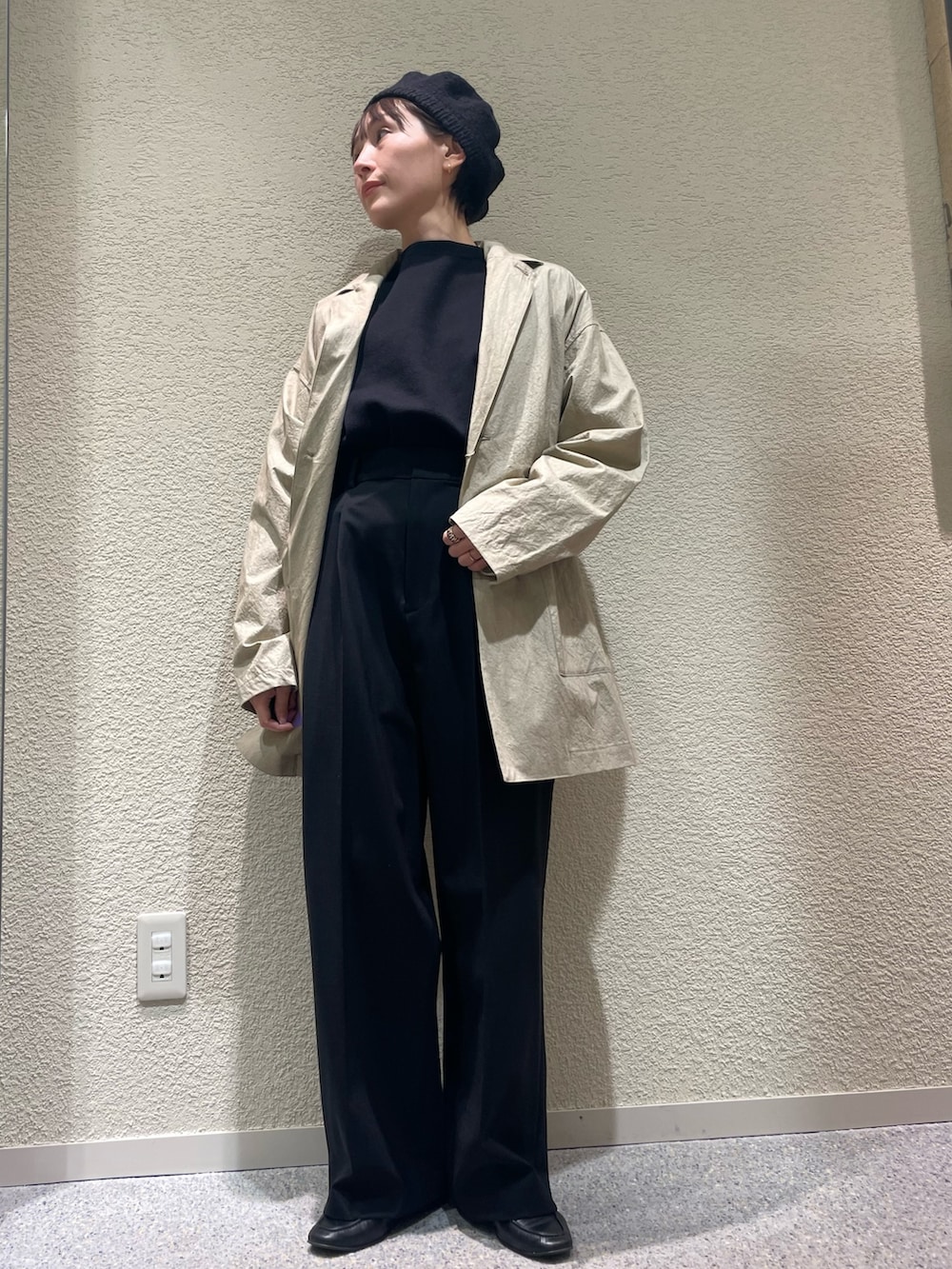 丈が伸びる事で縦長に見える効果があります!遠州染めがとても綺麗で、春らしい明るめbeige可愛い色です。他をオールブラックにする事で、色が映えます。