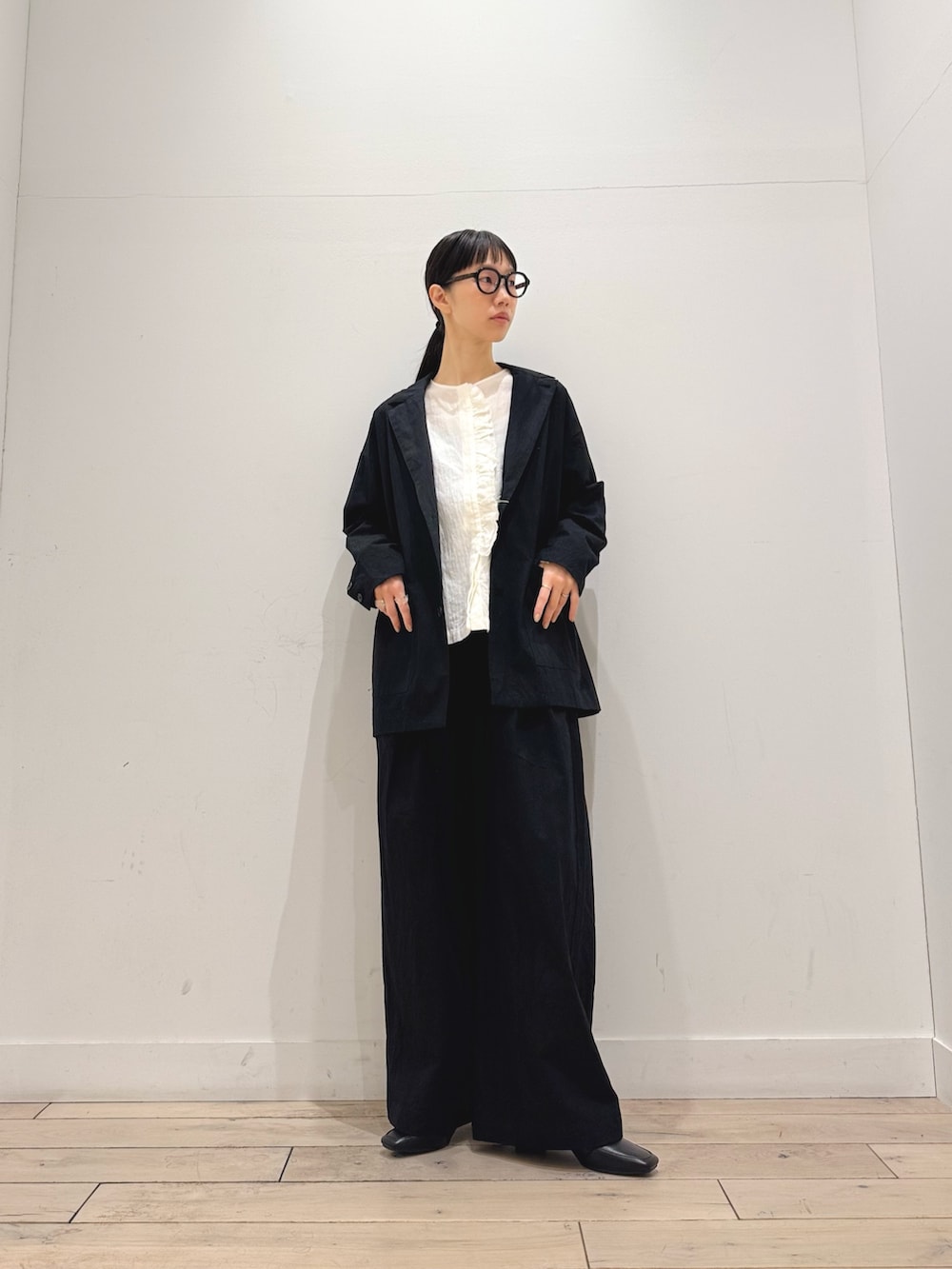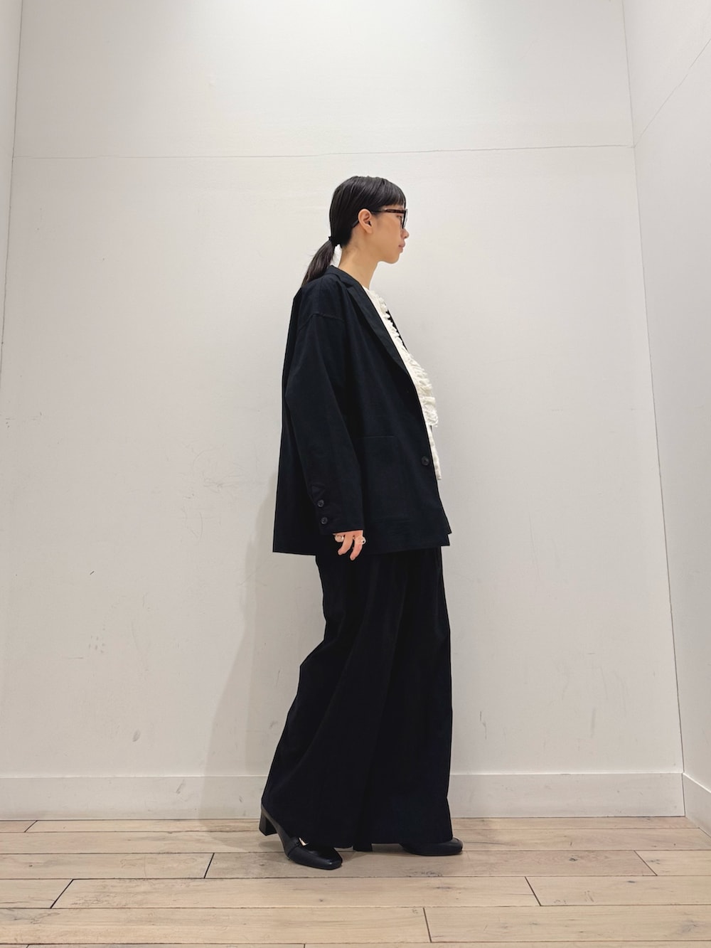 パンツはワイドシルエットですが、タックが入っていてスッキリ見えします◎