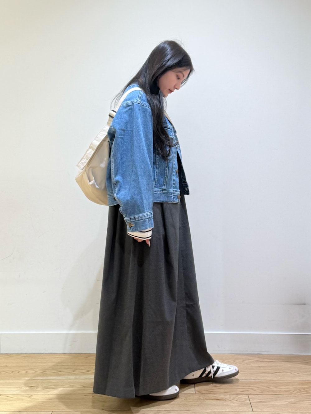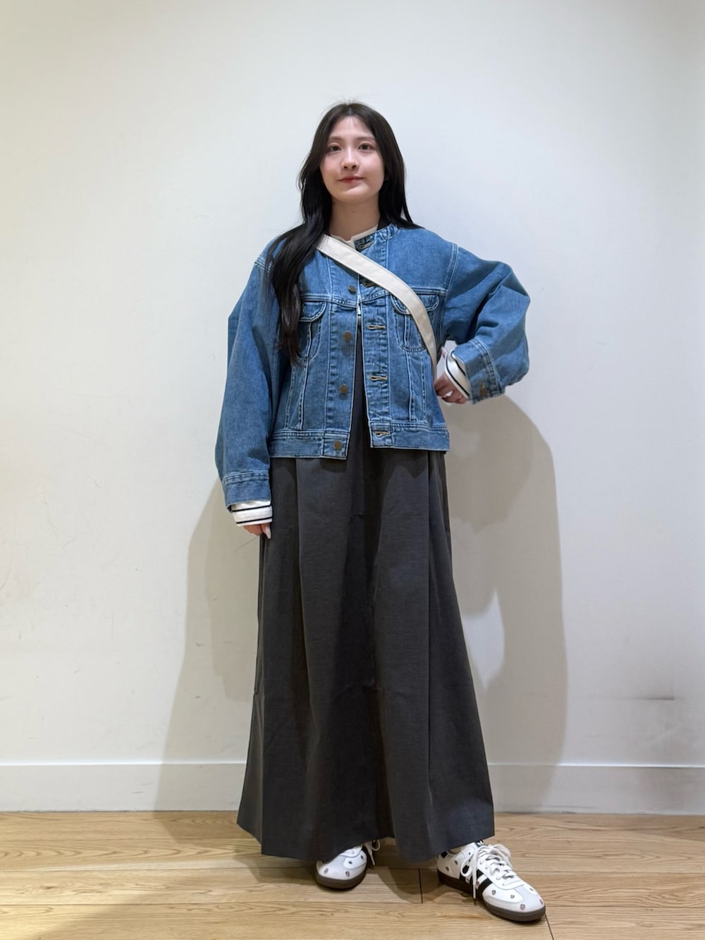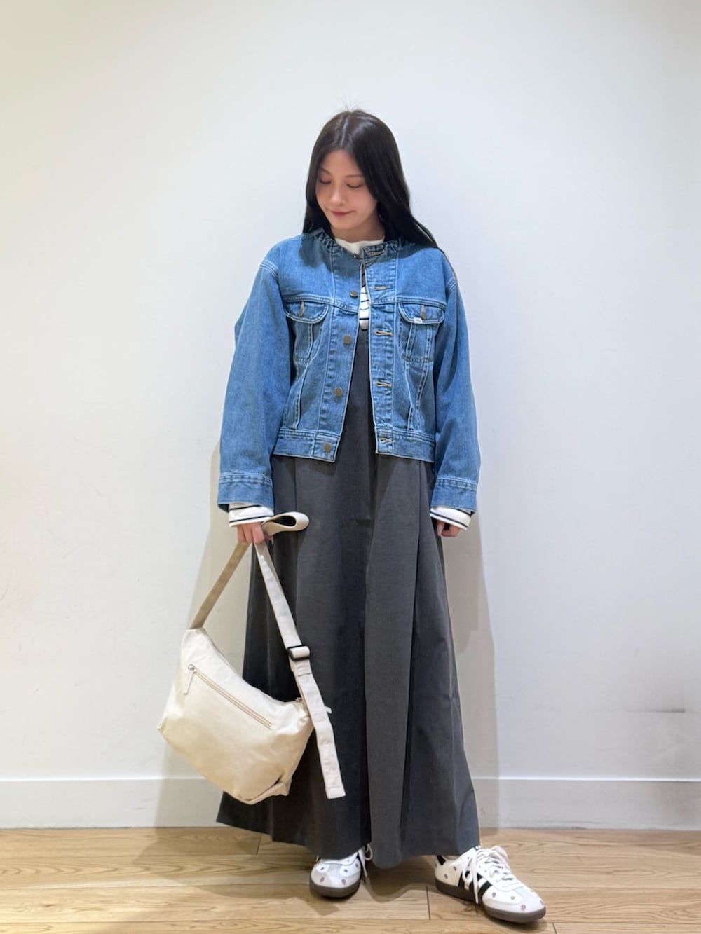 デニムジャケットは、ショート丈なので低身長の方でも着られてる感なくすっきりと着ることができておすすめです!