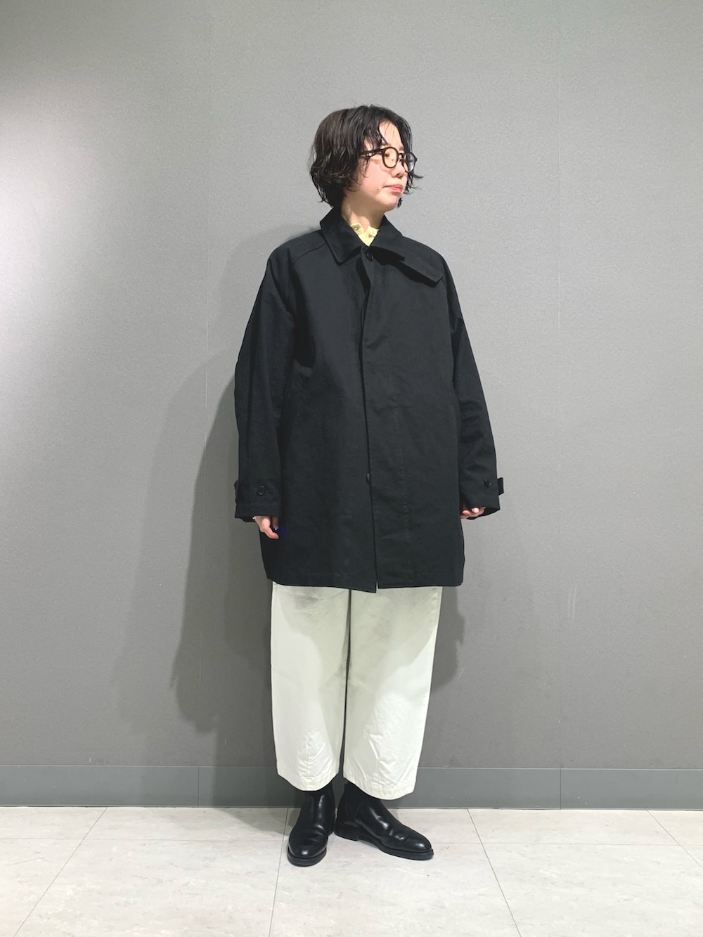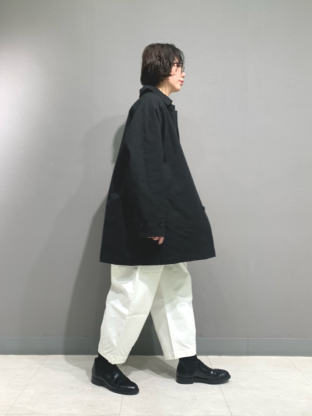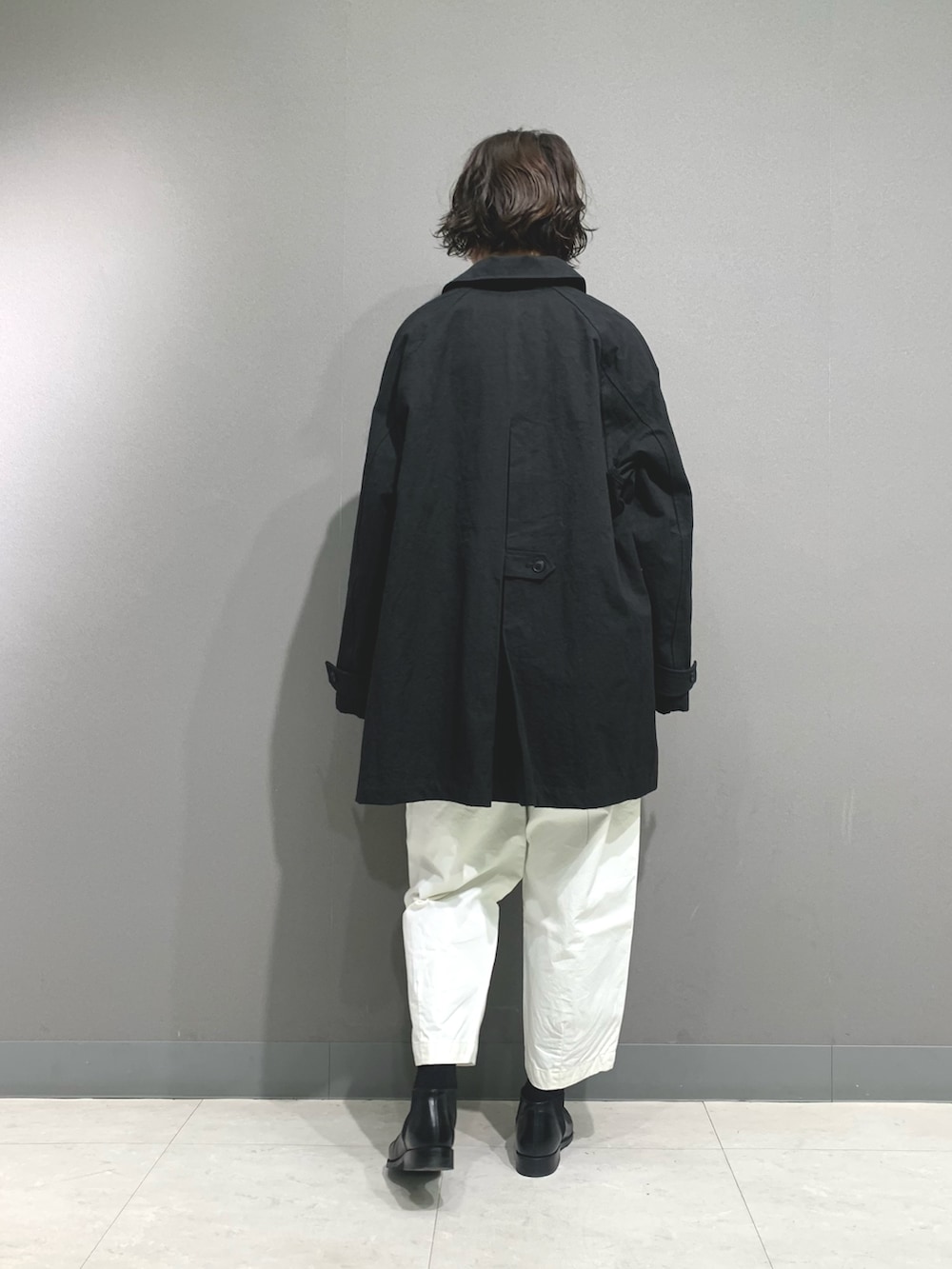 バルコートと同じ素材のしっかりとしたコットン素材のハーフコートです。冬場にも同じデザインのウールコートを販売していましたがコットンのハリのある素材感で雰囲気がだいぶ変わります。背中は広がり過ぎず落ち着いた印象です。