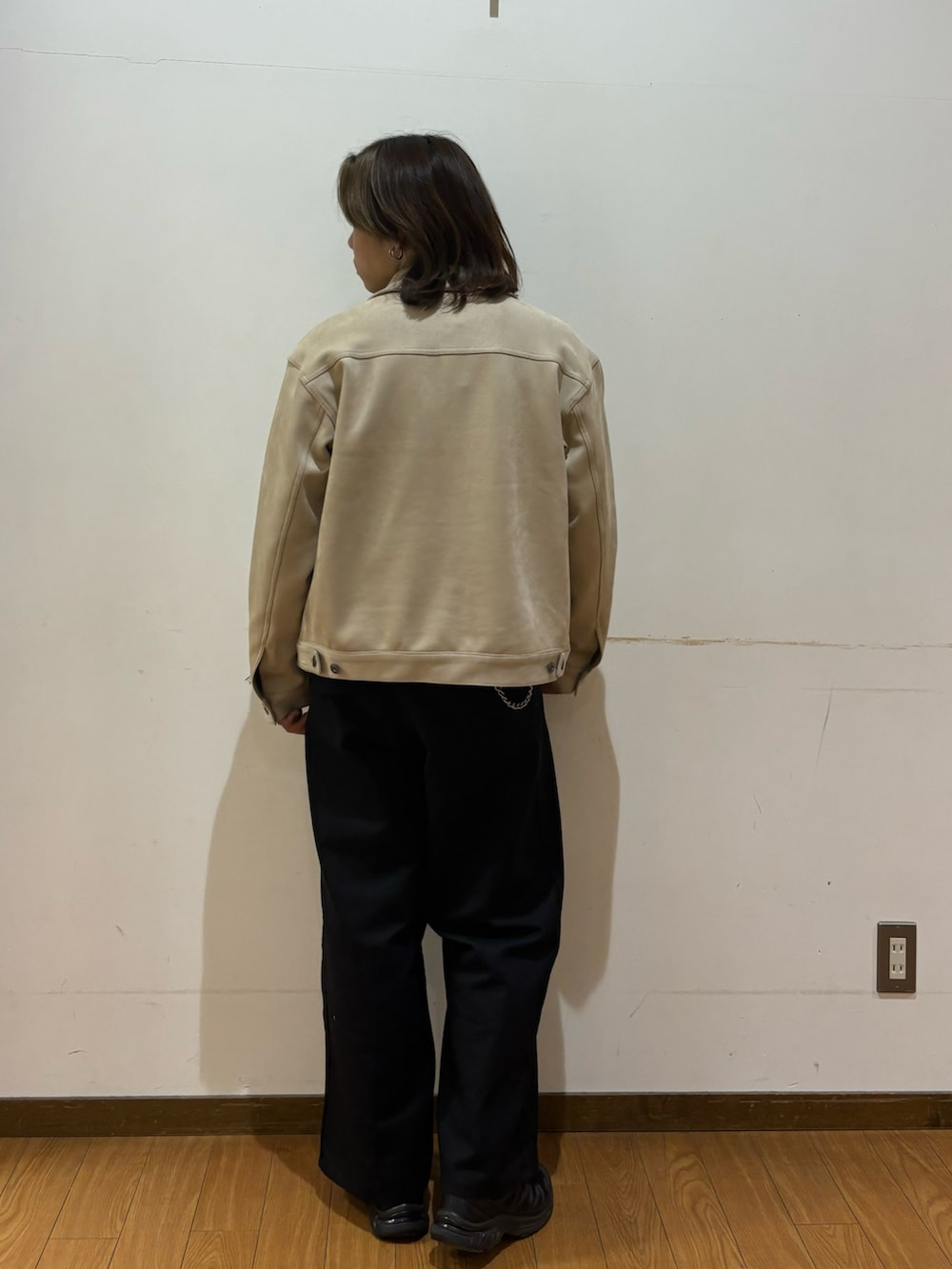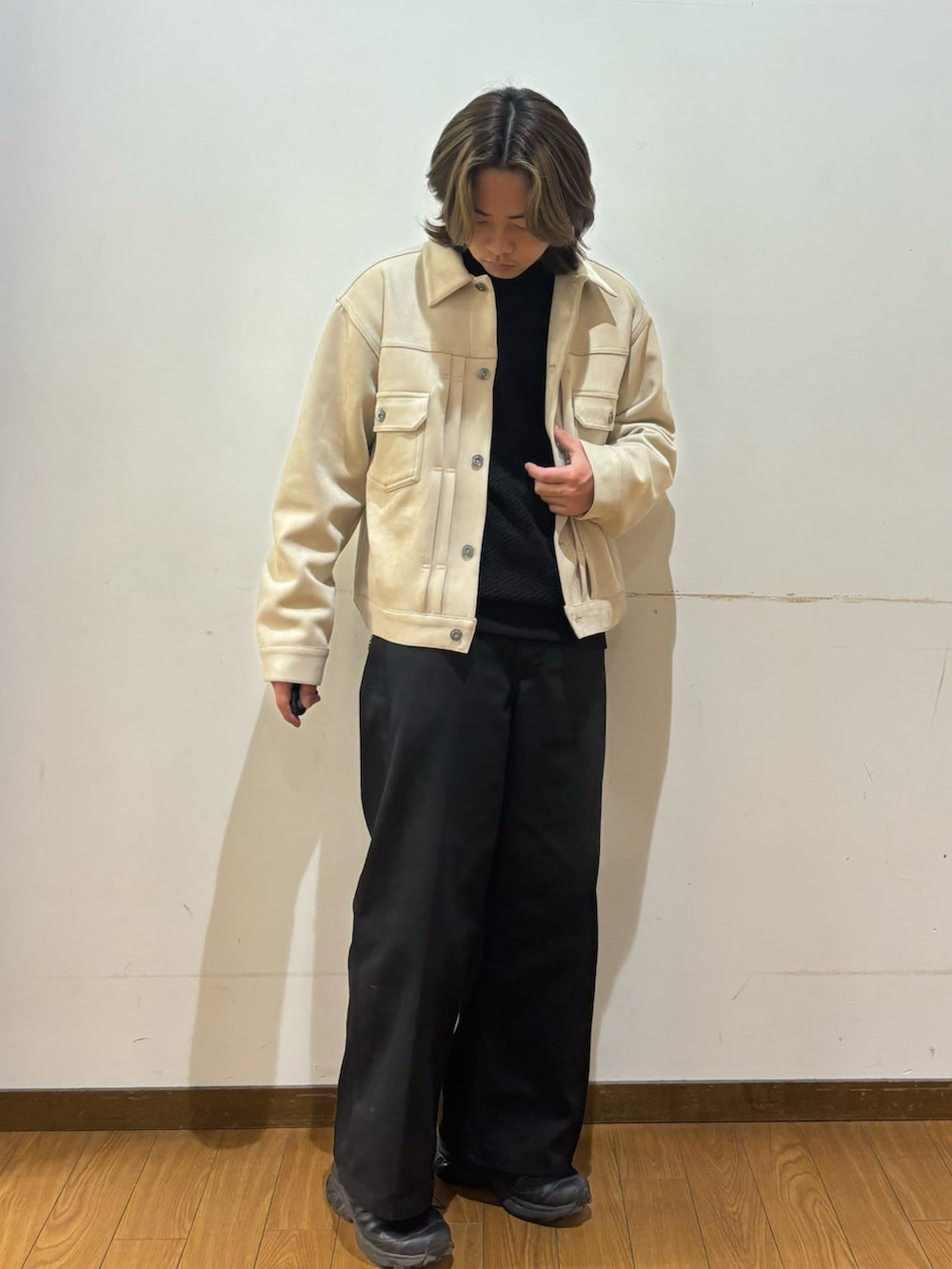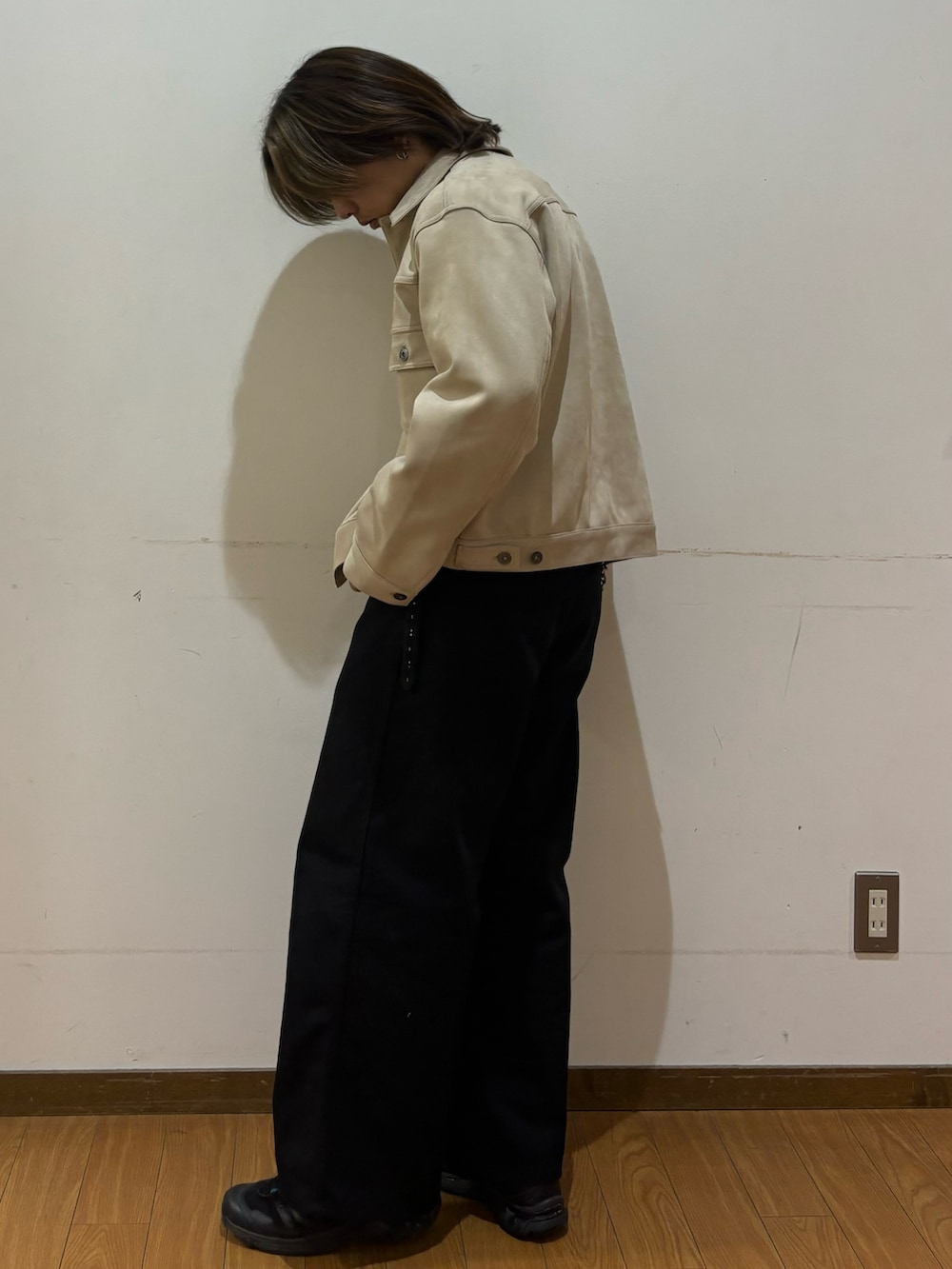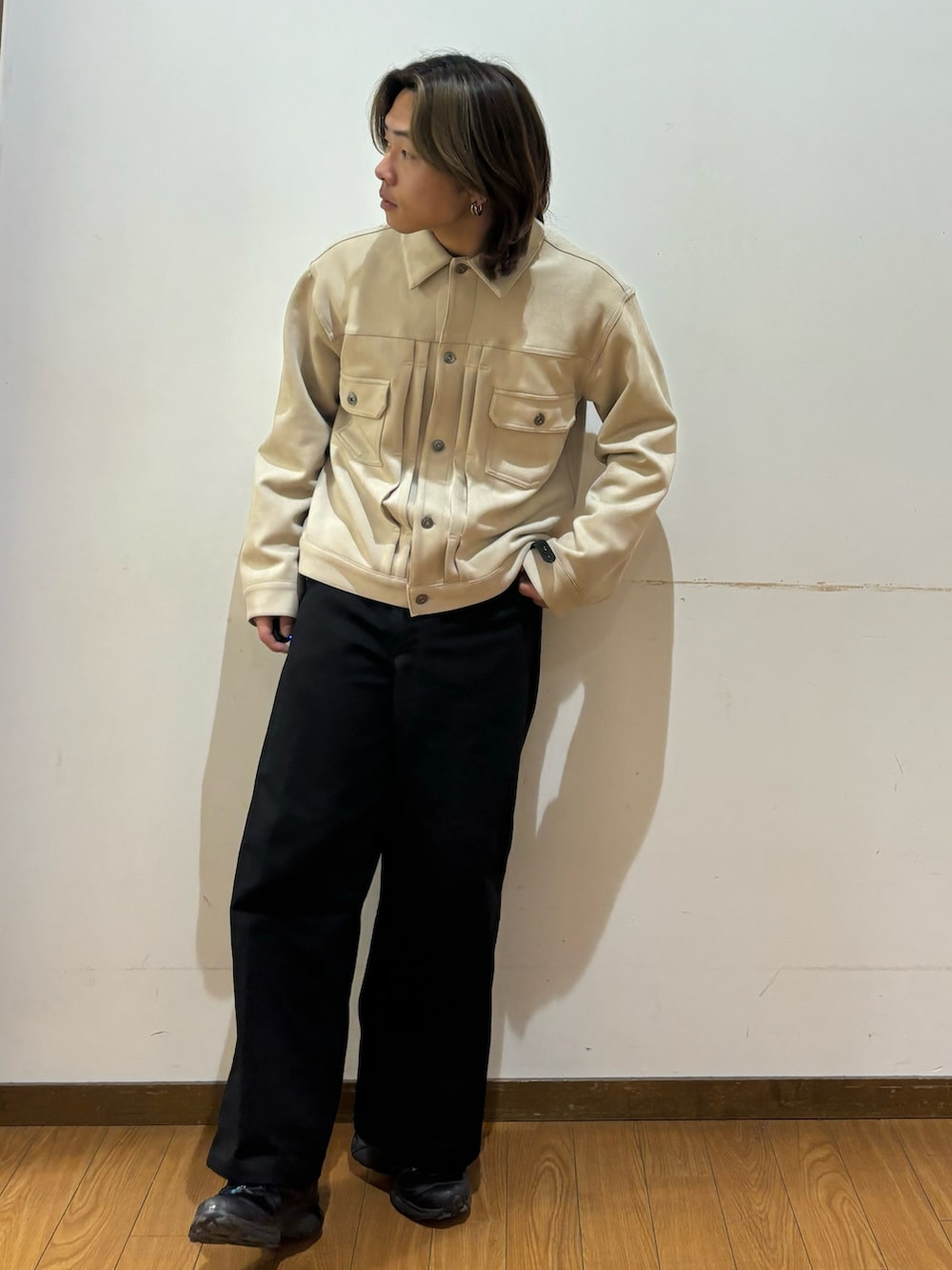 トップスのジャケットは着丈が短いのが特徴的です!スラックスはやや太めのデニムやワークパンツなどとも相性が良いと思います!