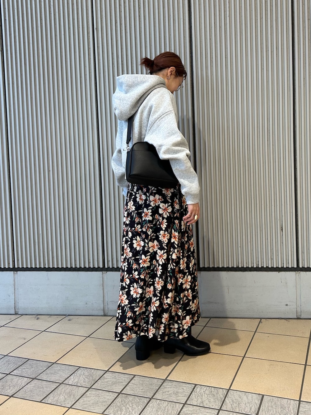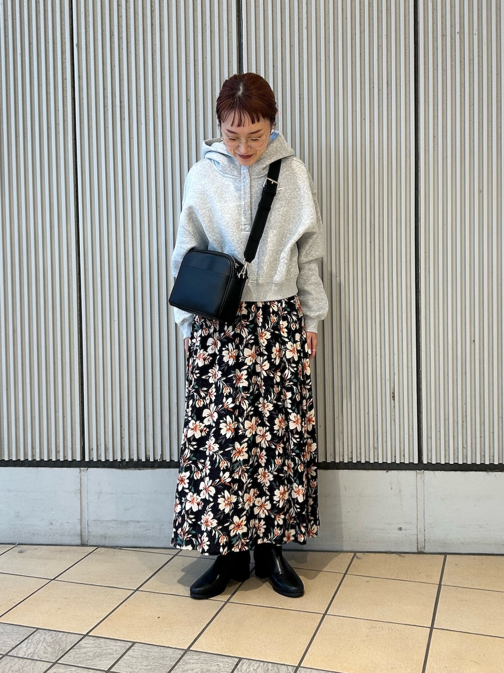 NIKEの着丈短めスウェットパーカーは、裏起毛で暖かいです。花柄スカートと合わせて、お出掛けコーデです。