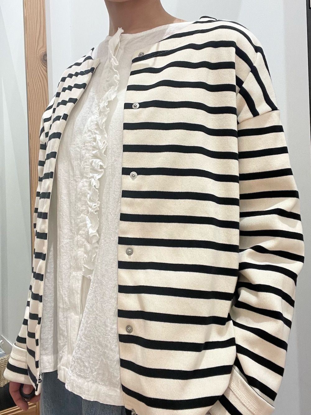 ボーダーを重ねたレイヤードスタイル。