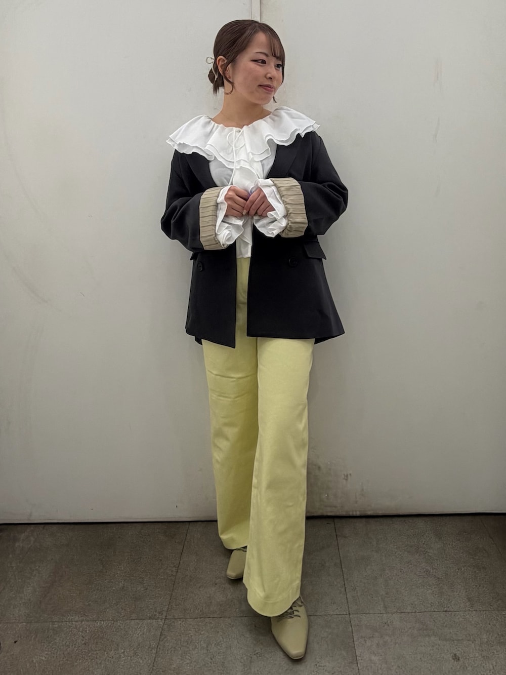フリルのブラウスに春らしいカラーのパンツを合わせてみました‎🤍🖤💛