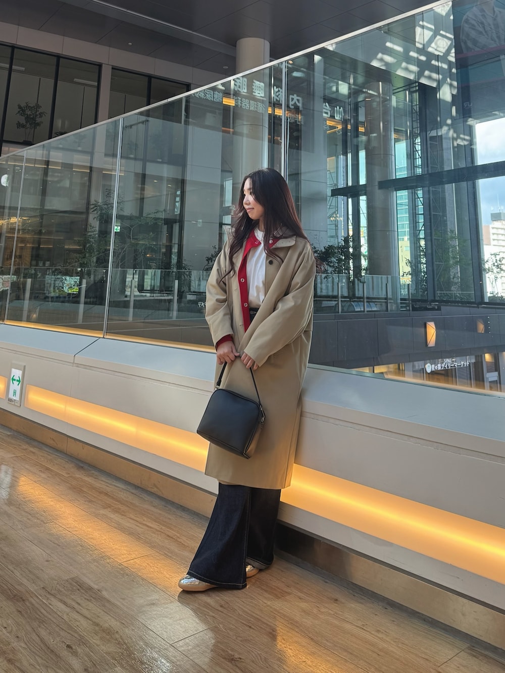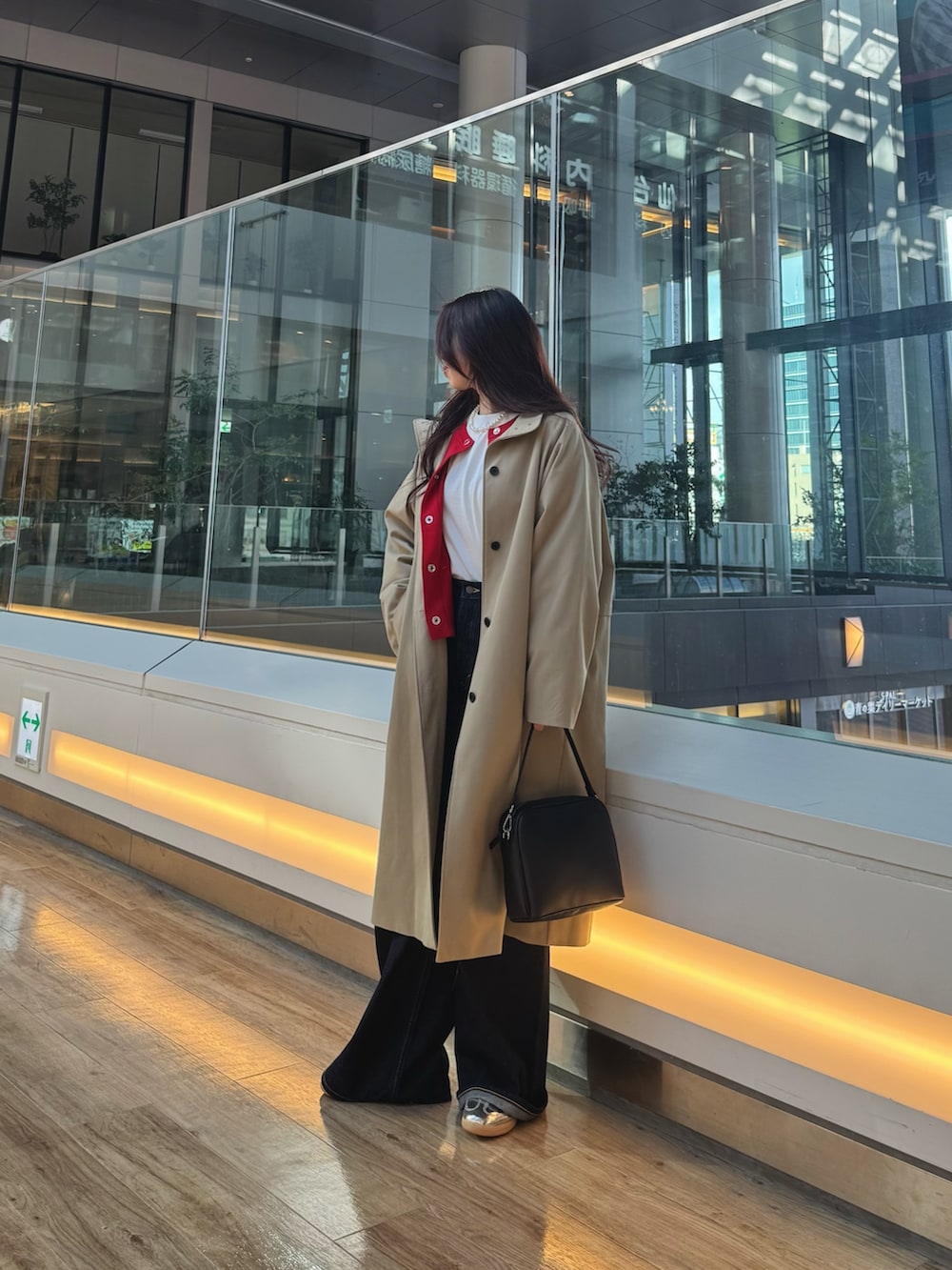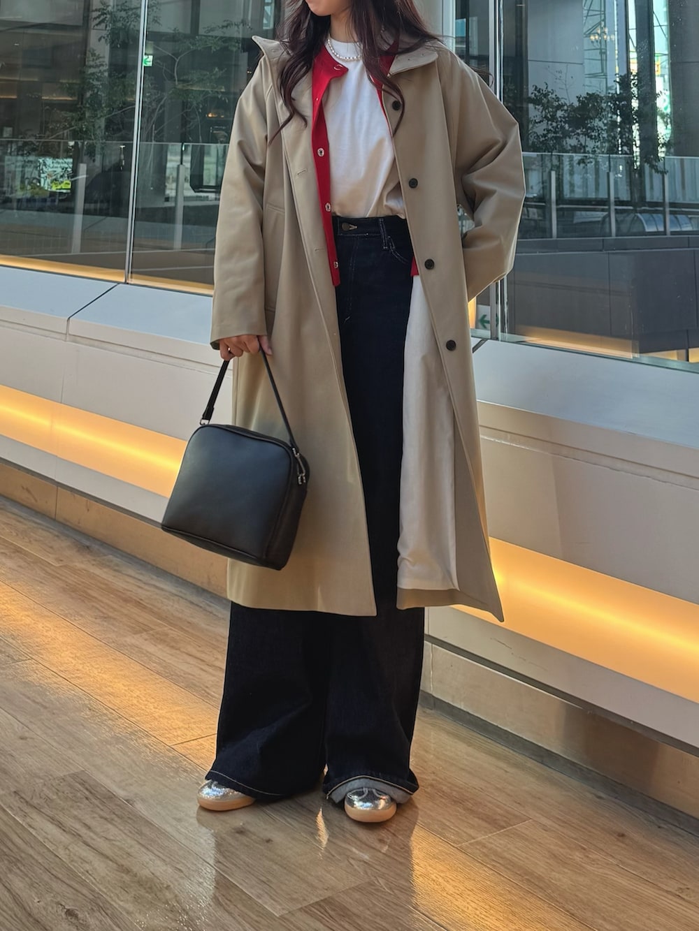 中には、200日ニットシリーズの赤のカーディガンを合わせてみました!