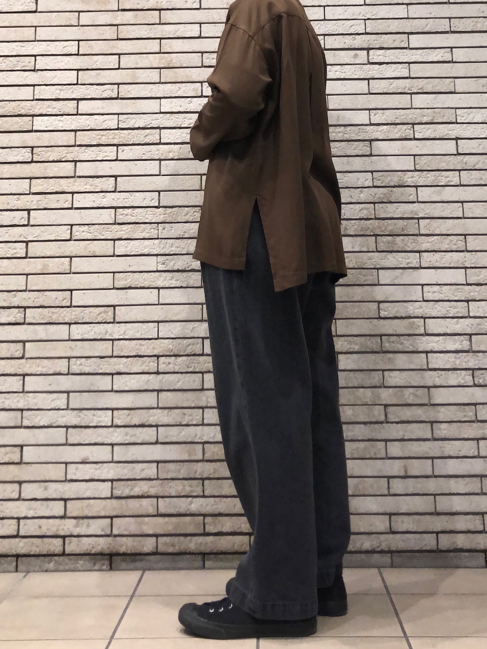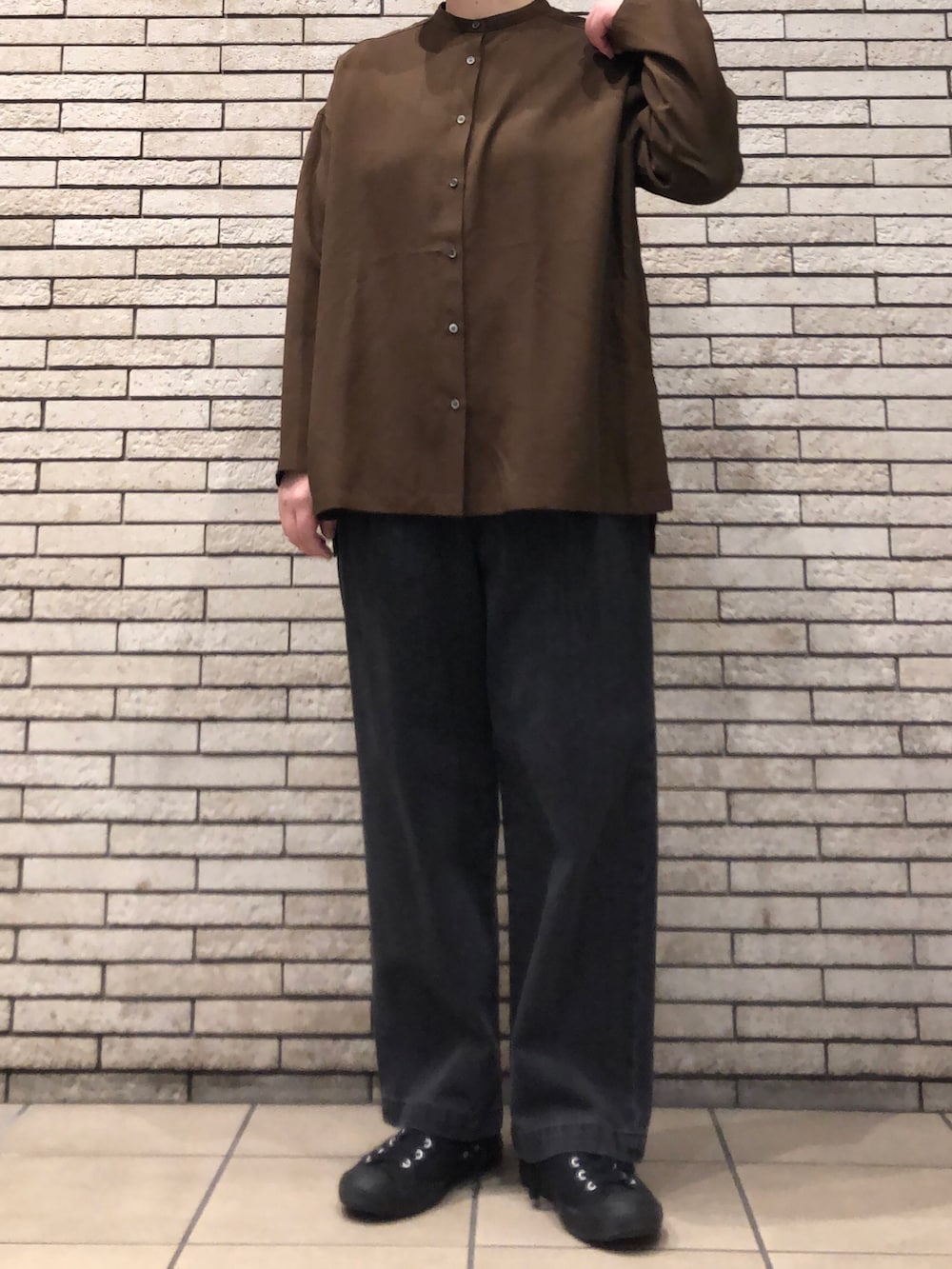 今回はブラウンとのシャツと合わせて、クラシックな大人カジュアルに。落ち寒のあるシャツは色合いがかわいい1着です。