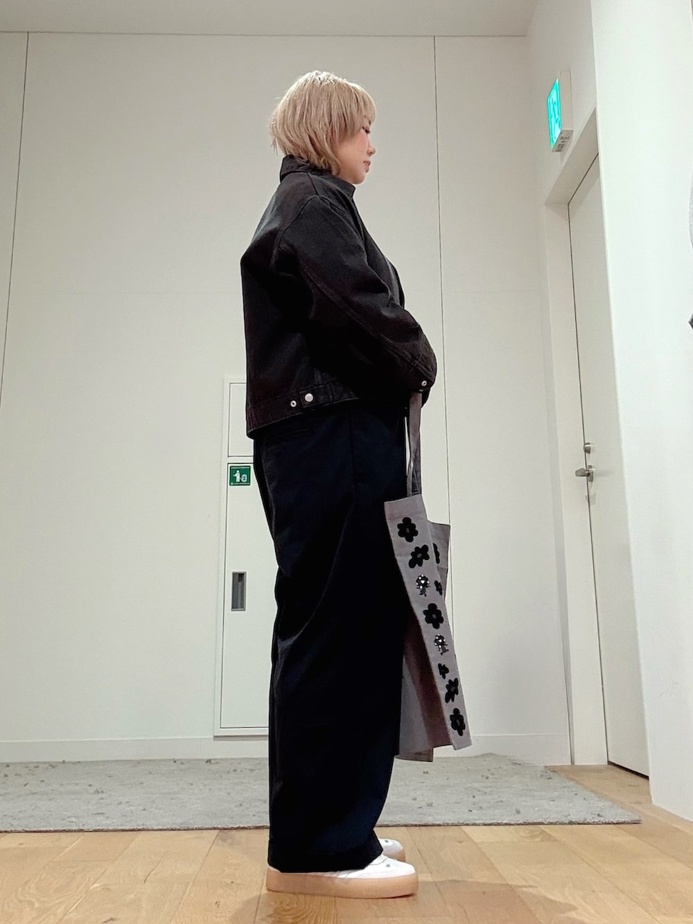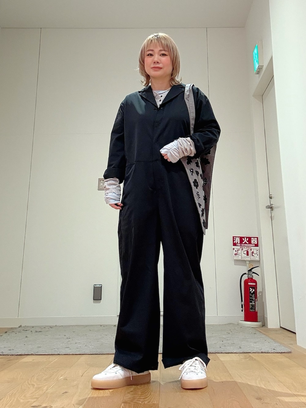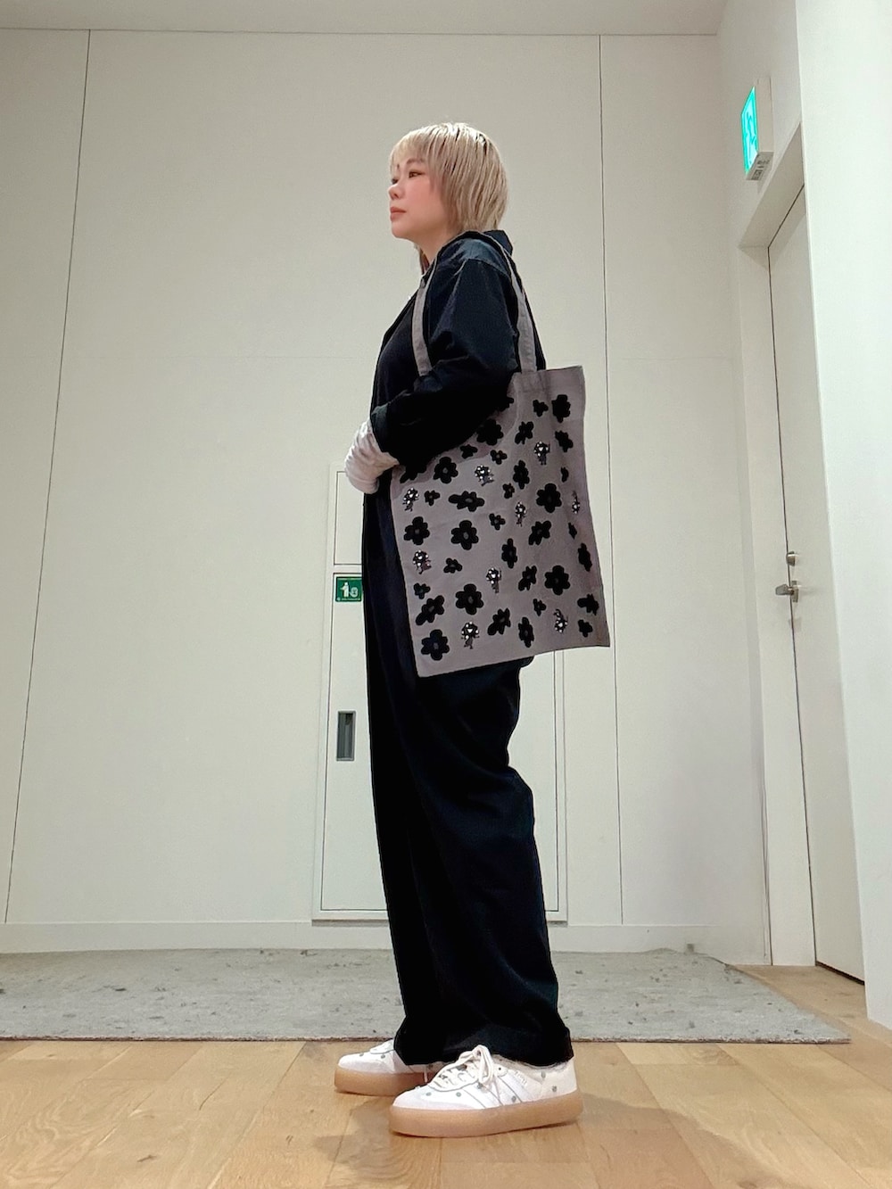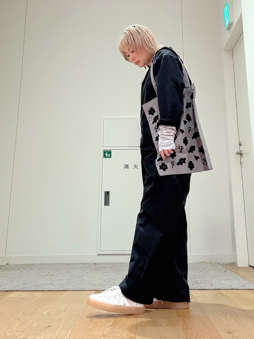 ミャクミャクのグレーバッグと、花柄が可愛いadidasスニーカーで遊び心を添えた、大人カジュアルスタイルです。