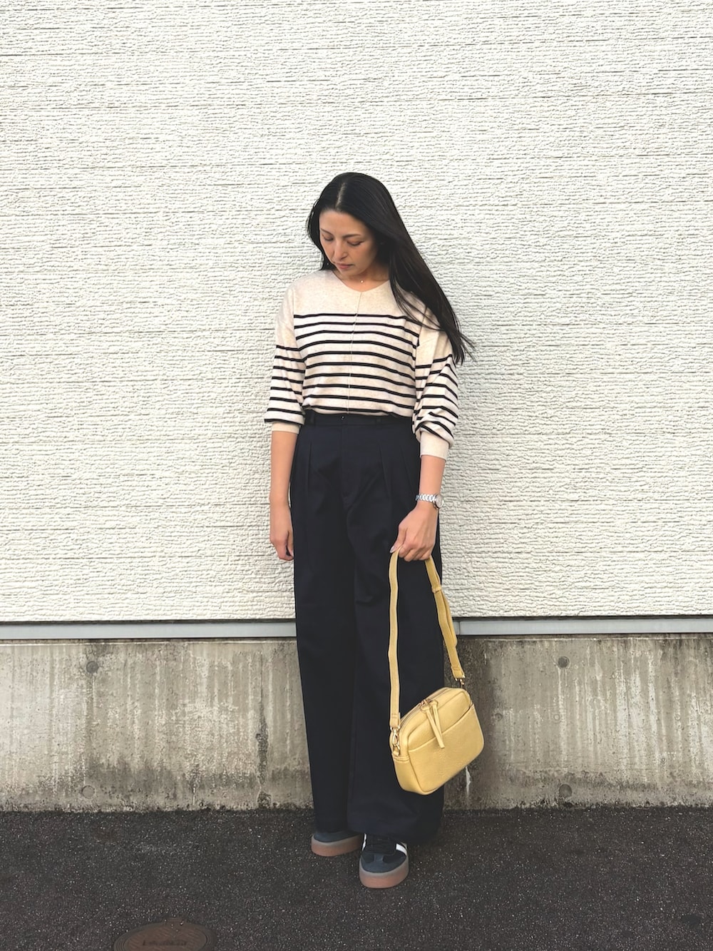 浅めVネックと薄手ニットで、シンプルなの