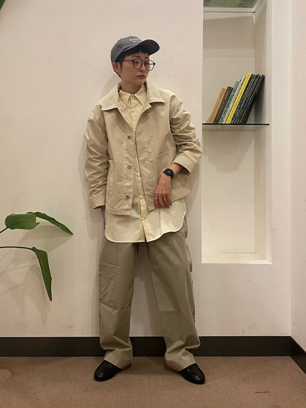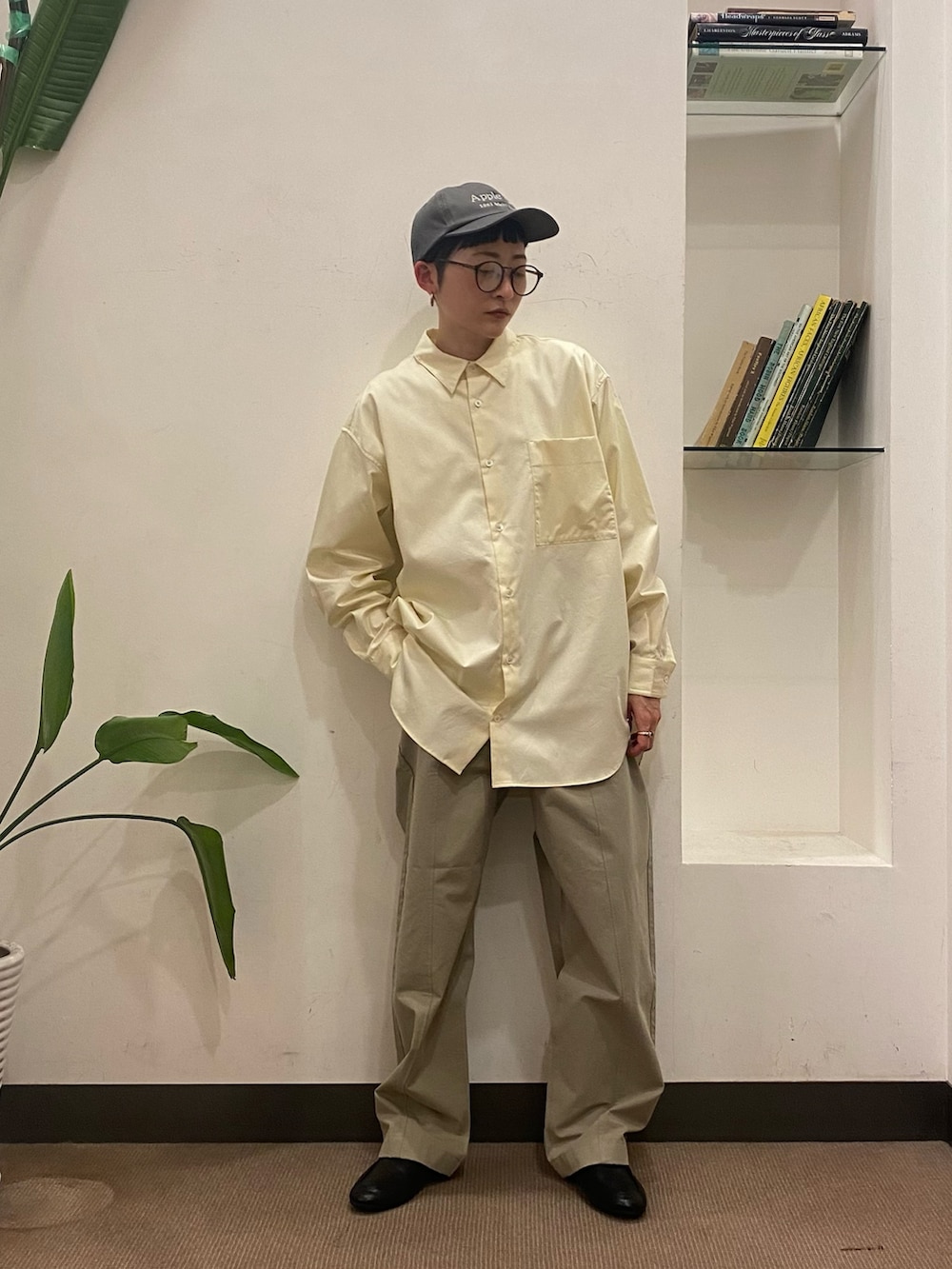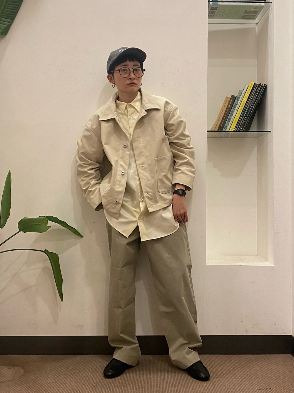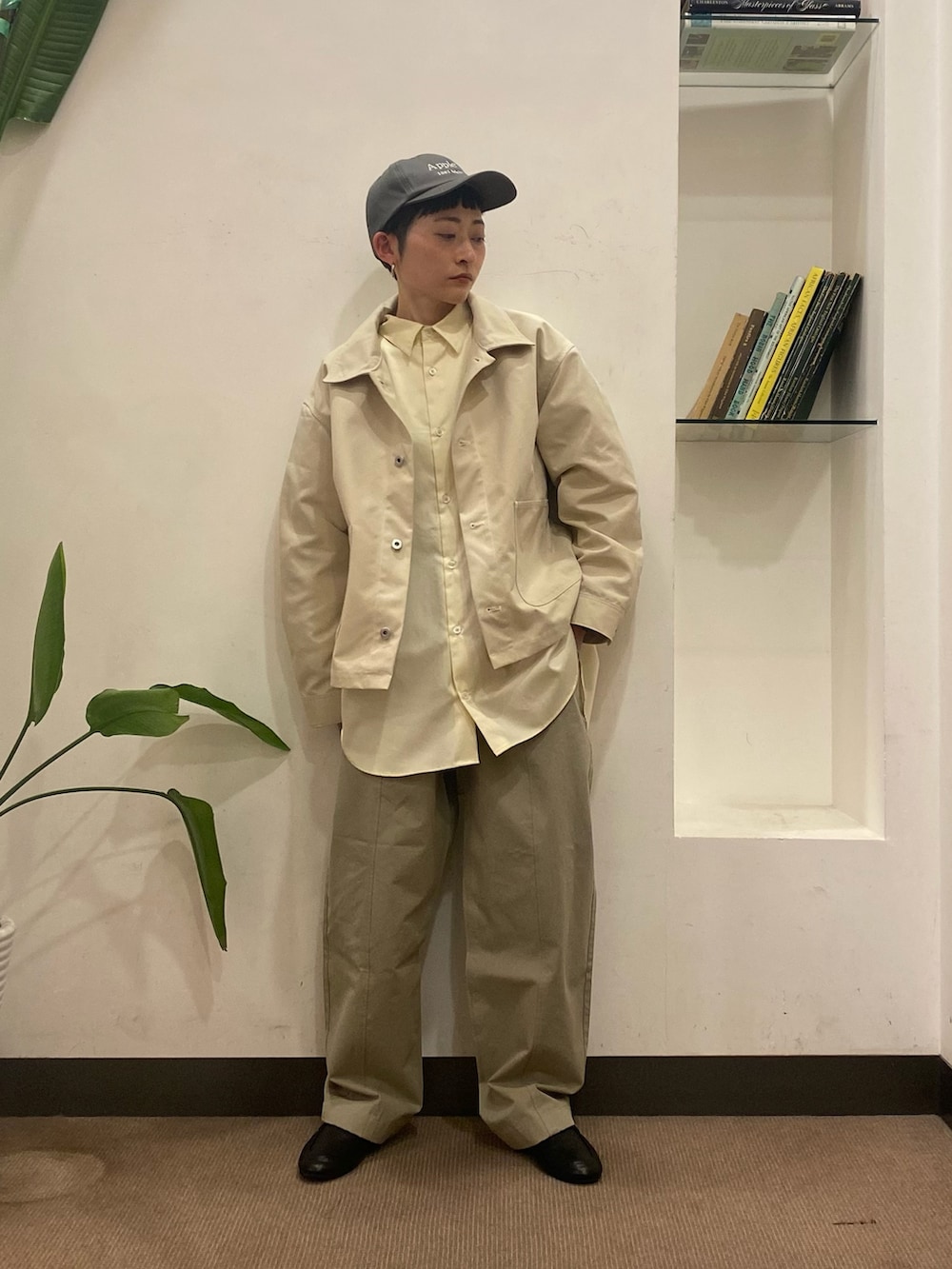 春らしいイエローのシャツをワントーンで合わせてみました。ルーズなシャツなのでアウターを短めにしてバランスを取りました。