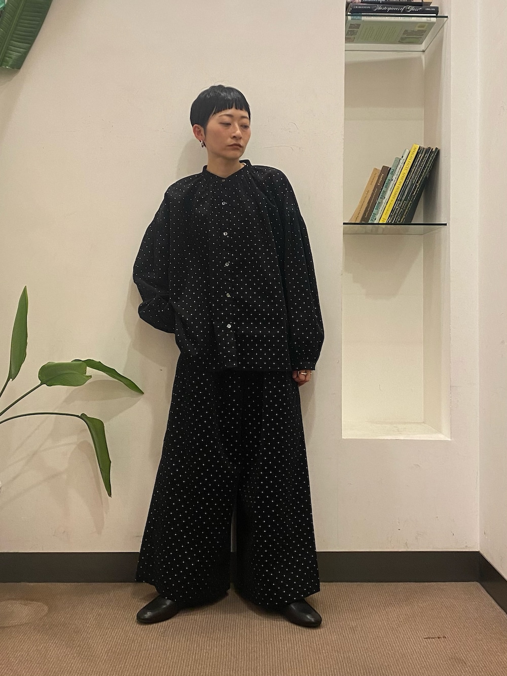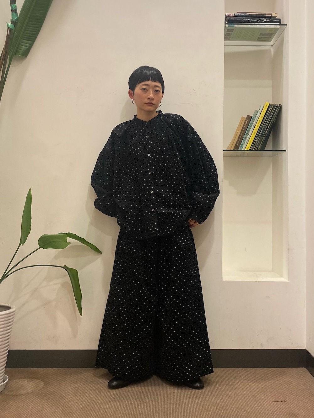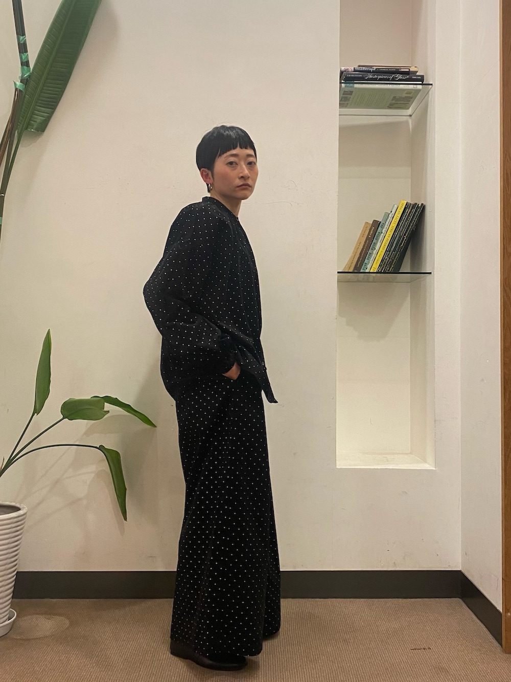 コーデュロイ×ドットのデザインは新鮮な組み合わせでカジュアルとフェミニンのミックスが可愛いです。セットアップで着ればモードさも加わってさらにおしゃれな印象になりますよ。