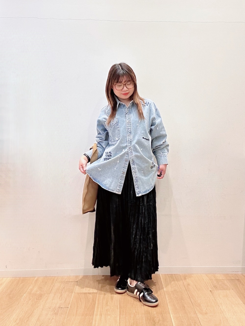 ピカデリーの別注デニムシャツのライト.ブルーとかぐれのスカートで大人カジュアルにコーディネートしました🧢👒
