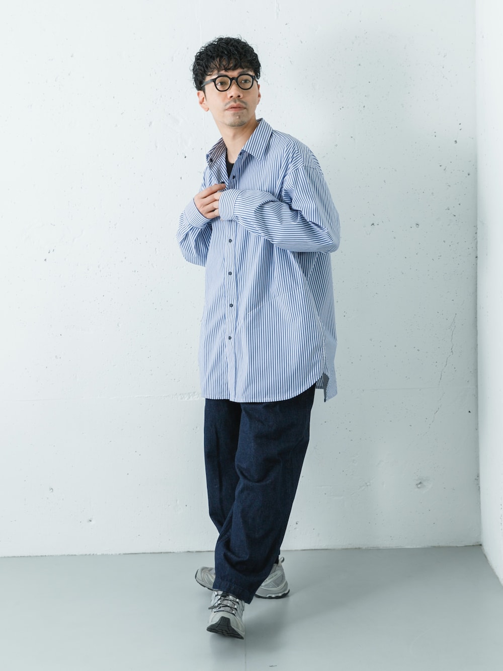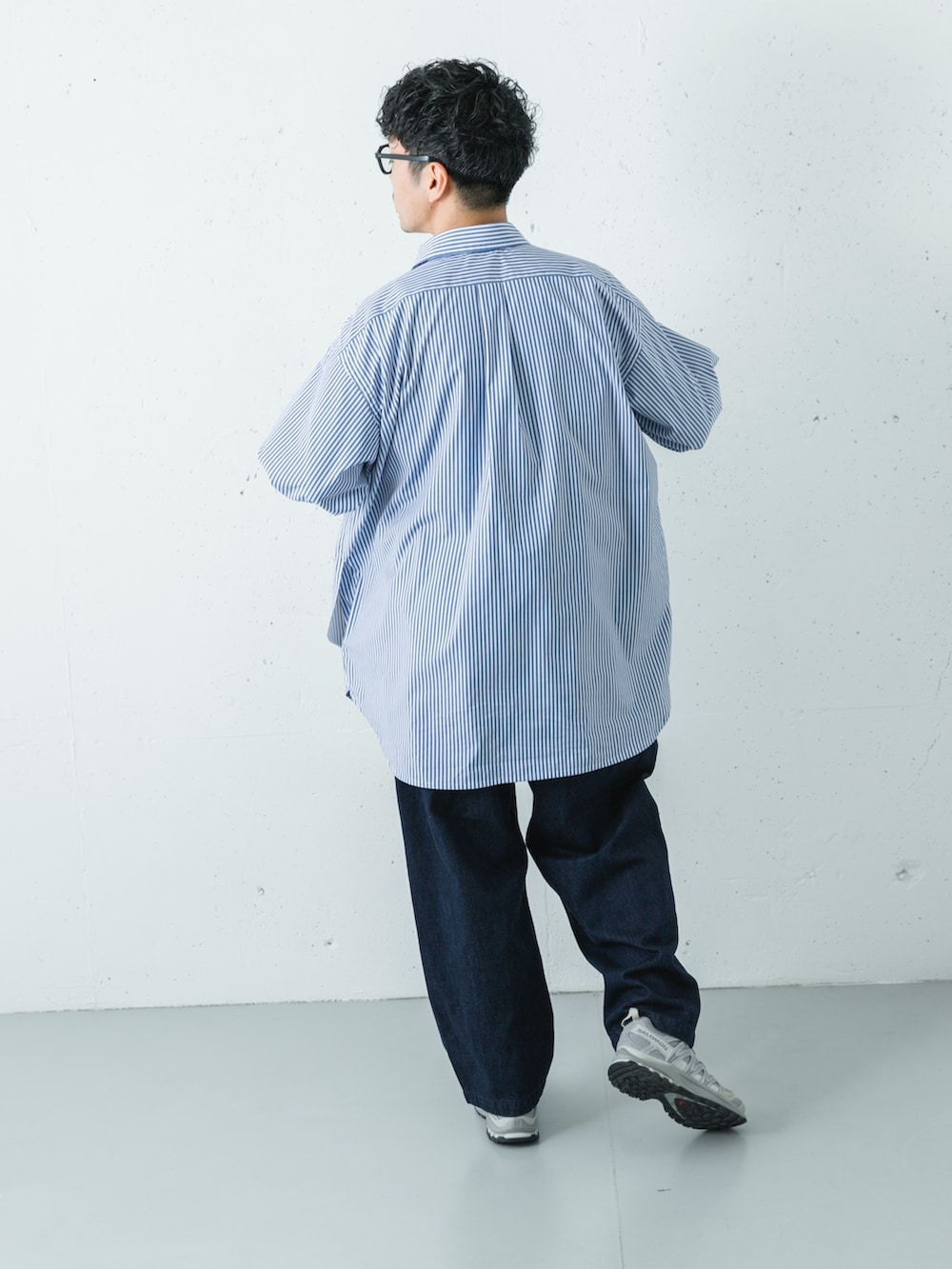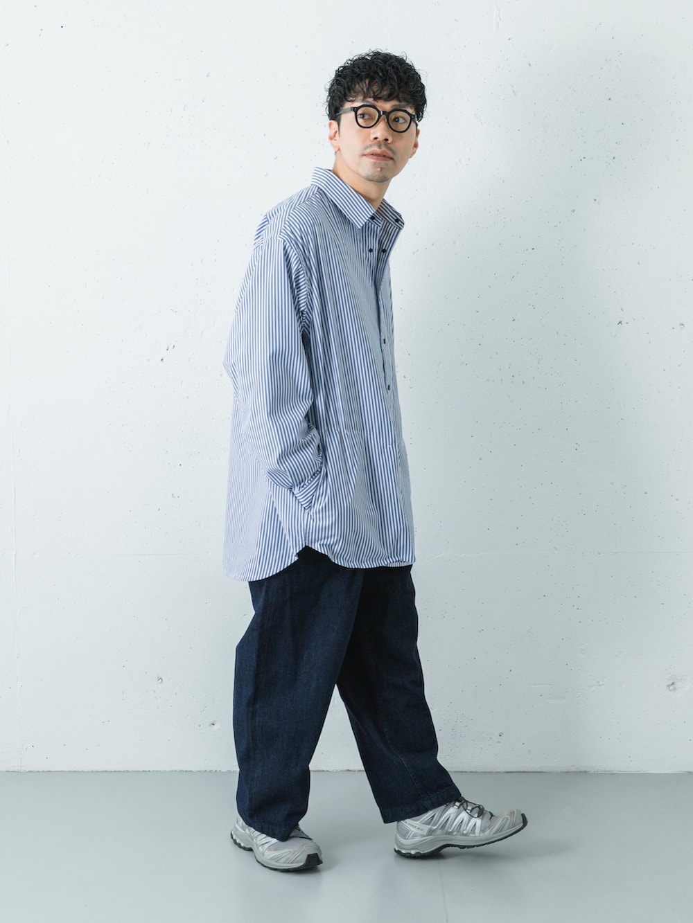 オーバーシャツとオーバーパンツのゆったりコーディネート。