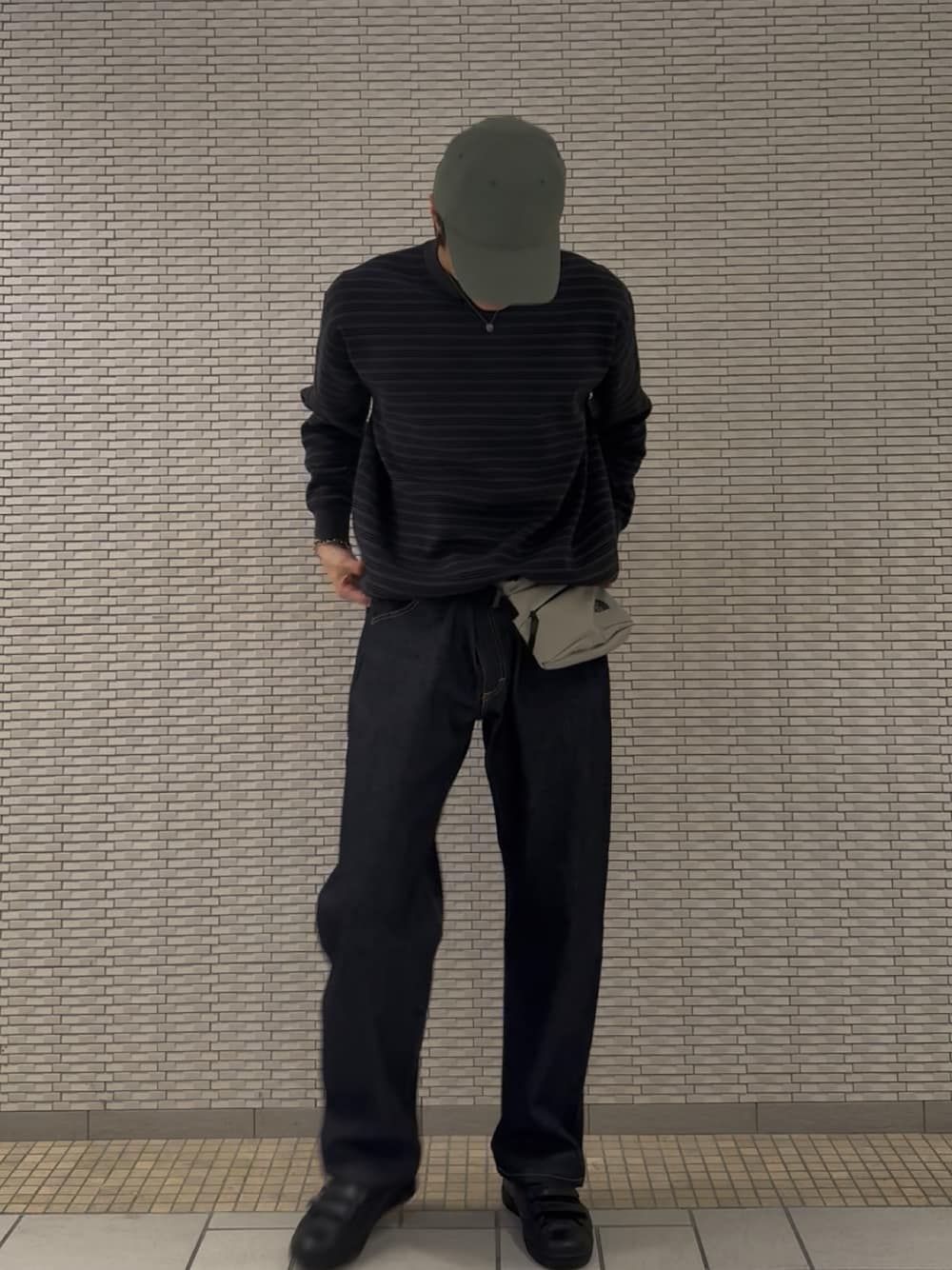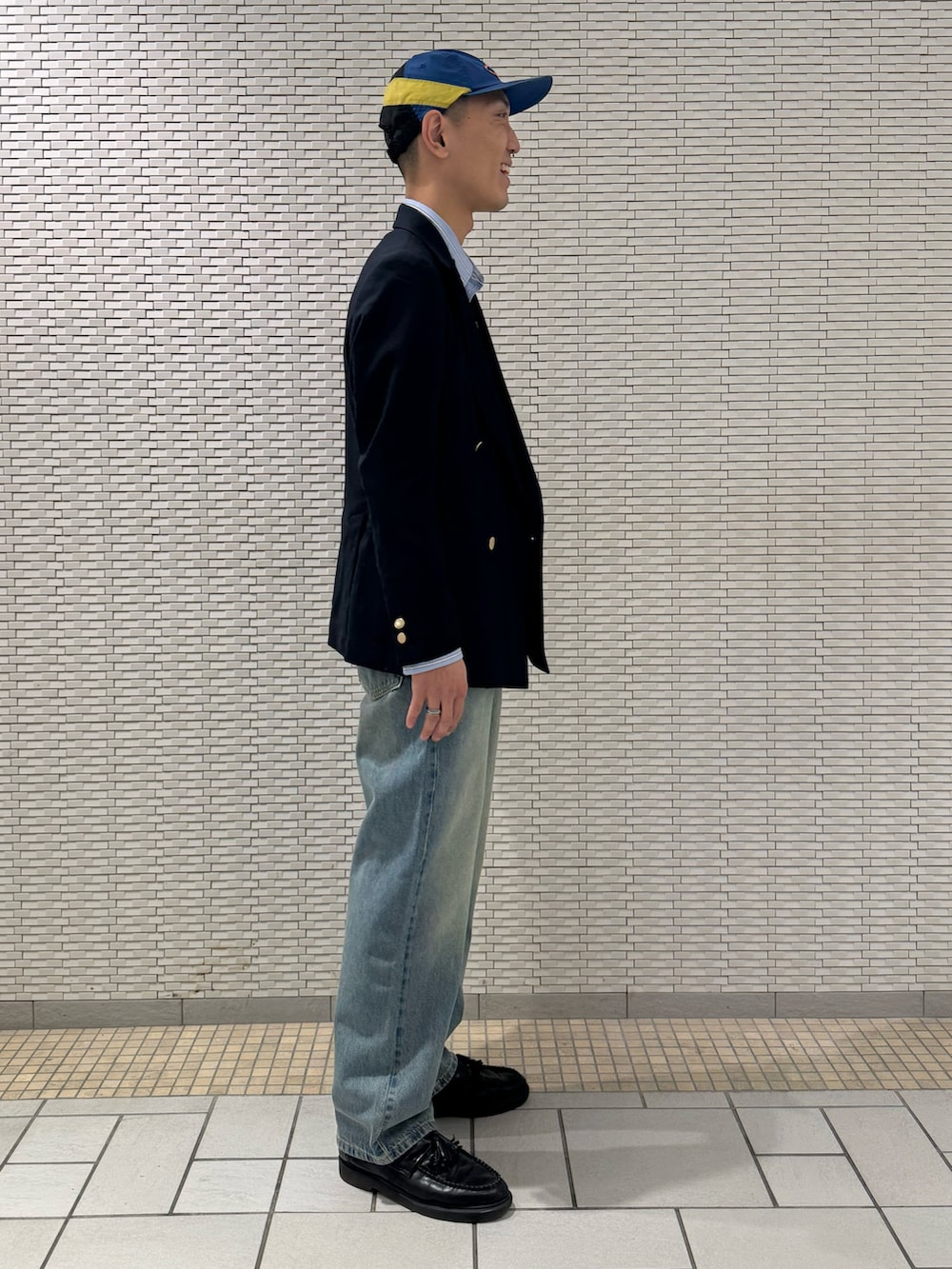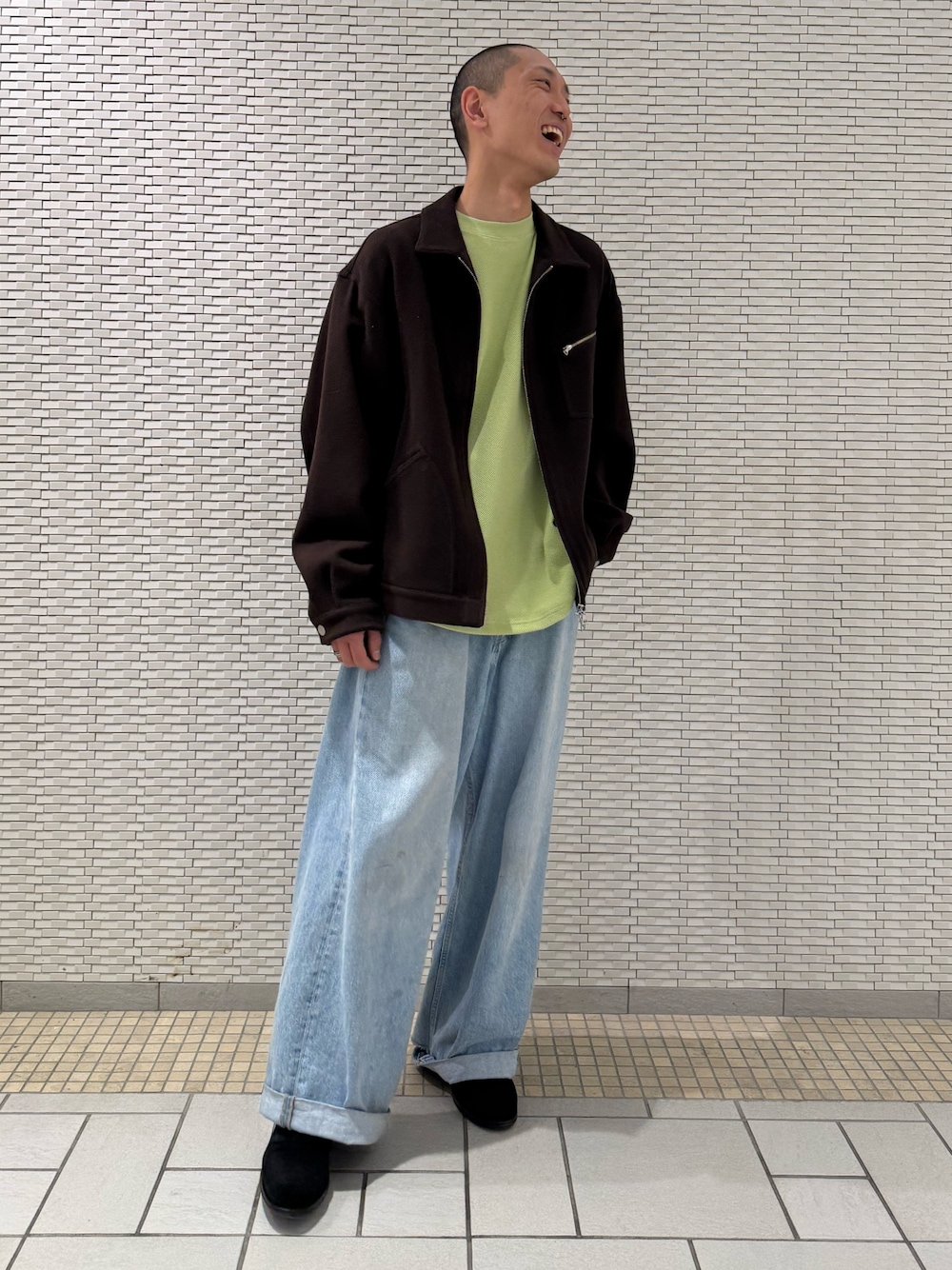 ワンカラーコーデはどうしてものっぺりしすぎてしまうことがあるため、インナーの柄やパンツの色落ち感で上から下まで見飽きることの無い様意識しました!