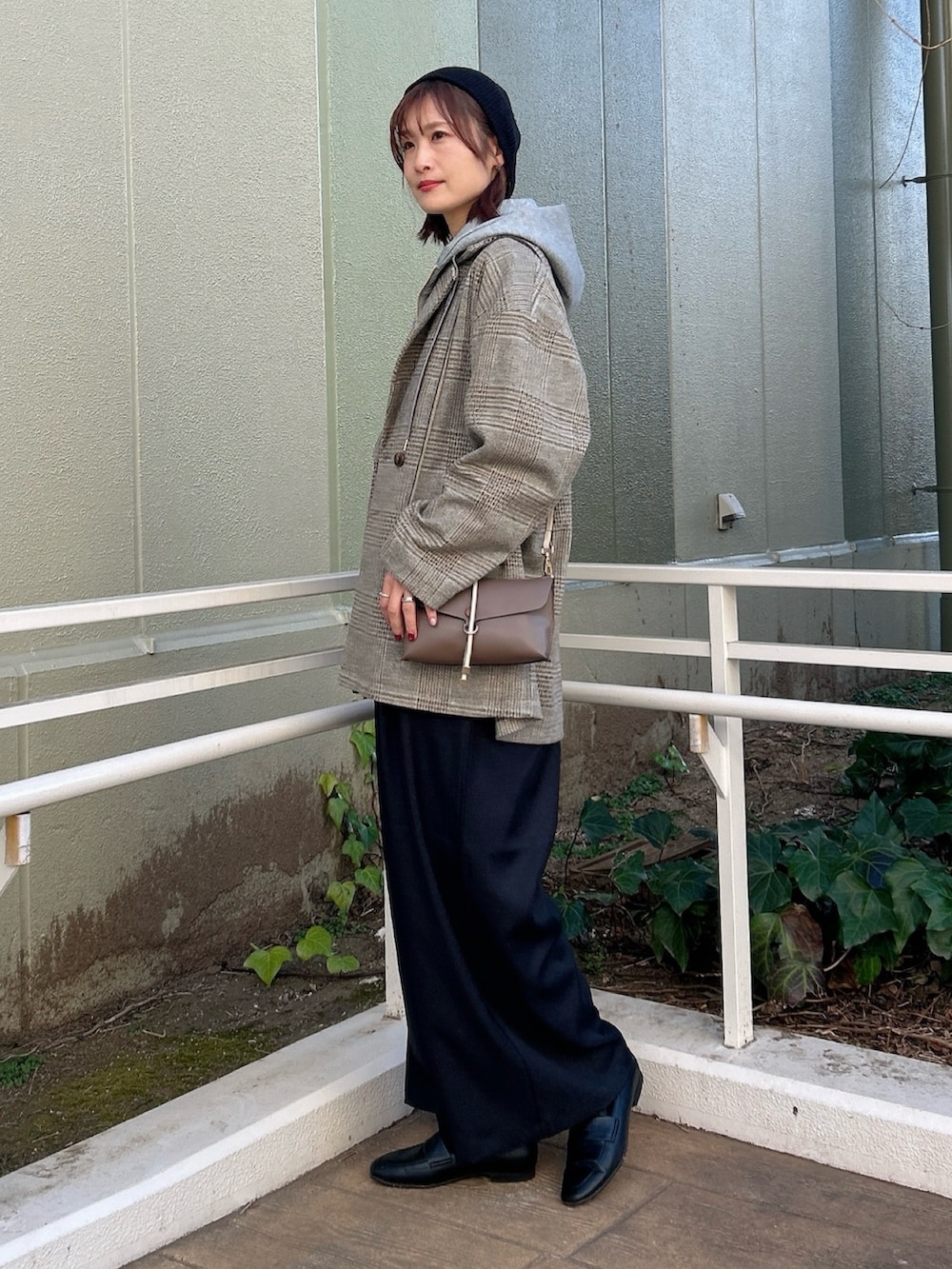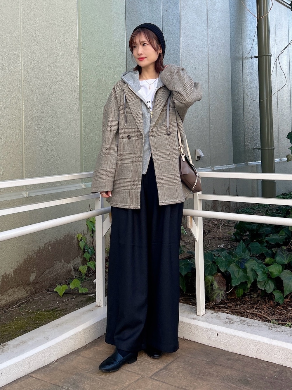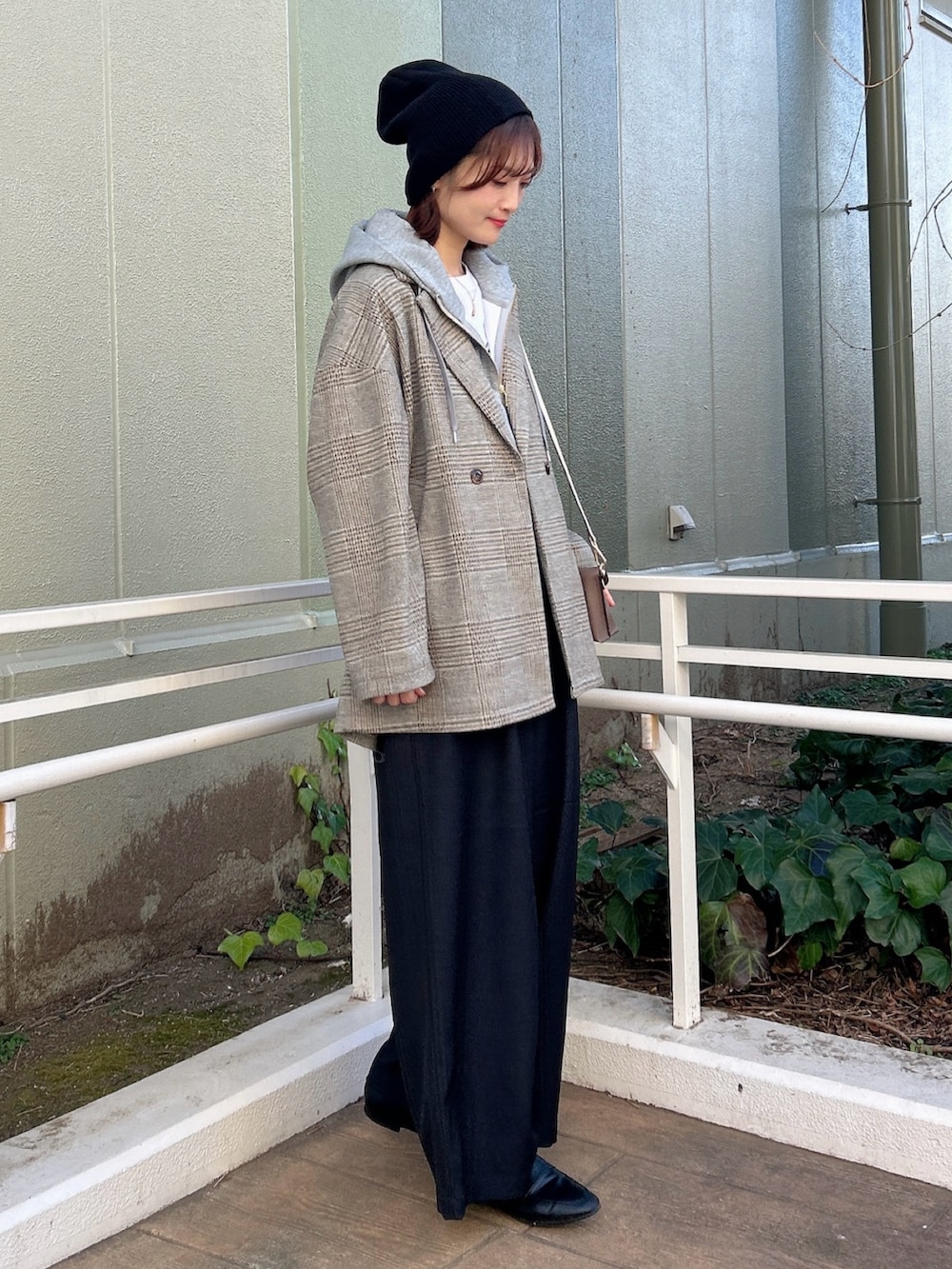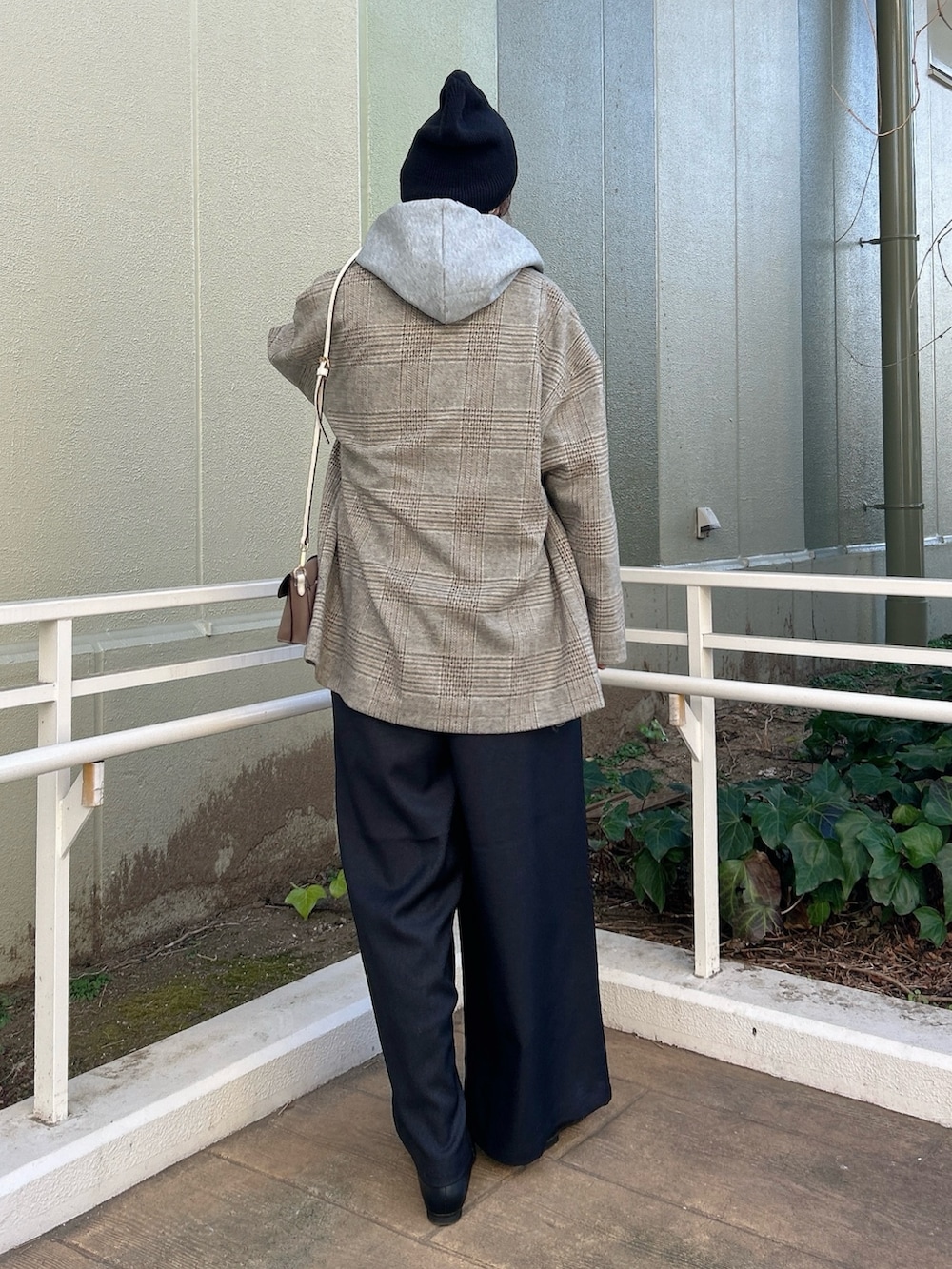 ✔︎ チェックジャケットにパーカーを仕込んで、きれいめカジュアルに。
